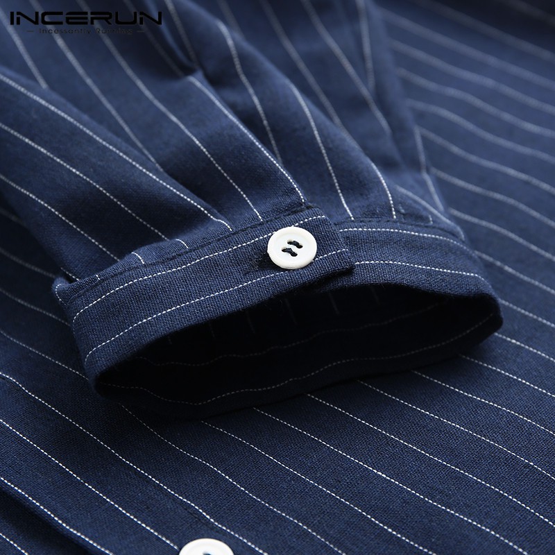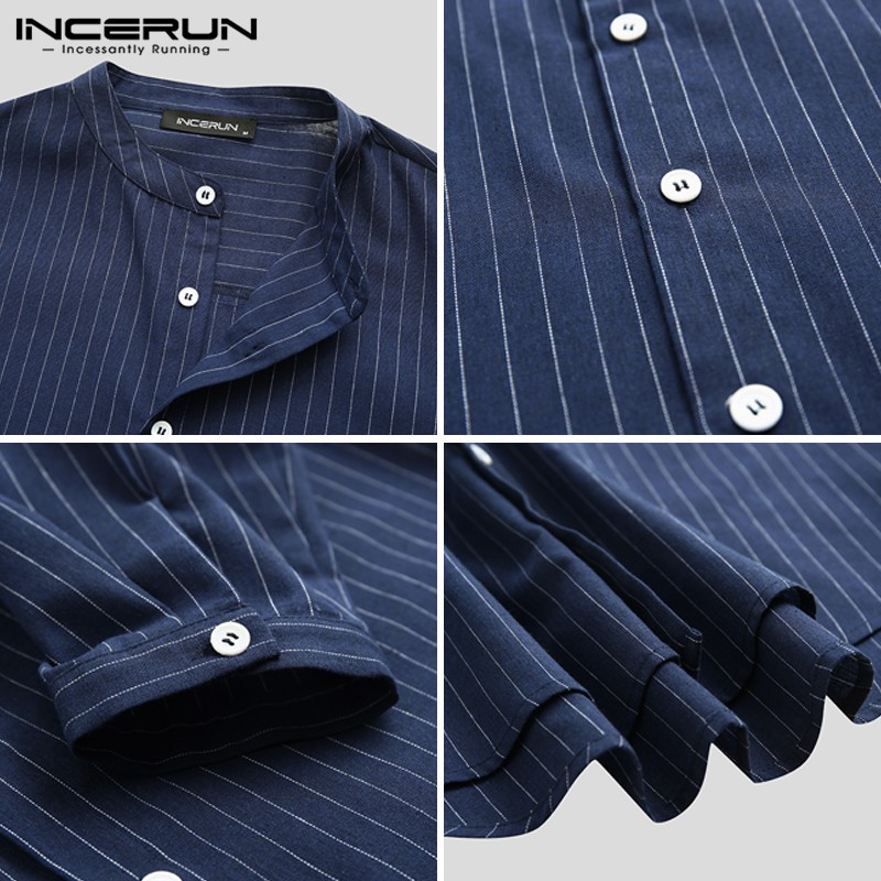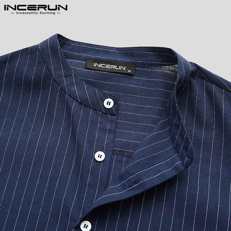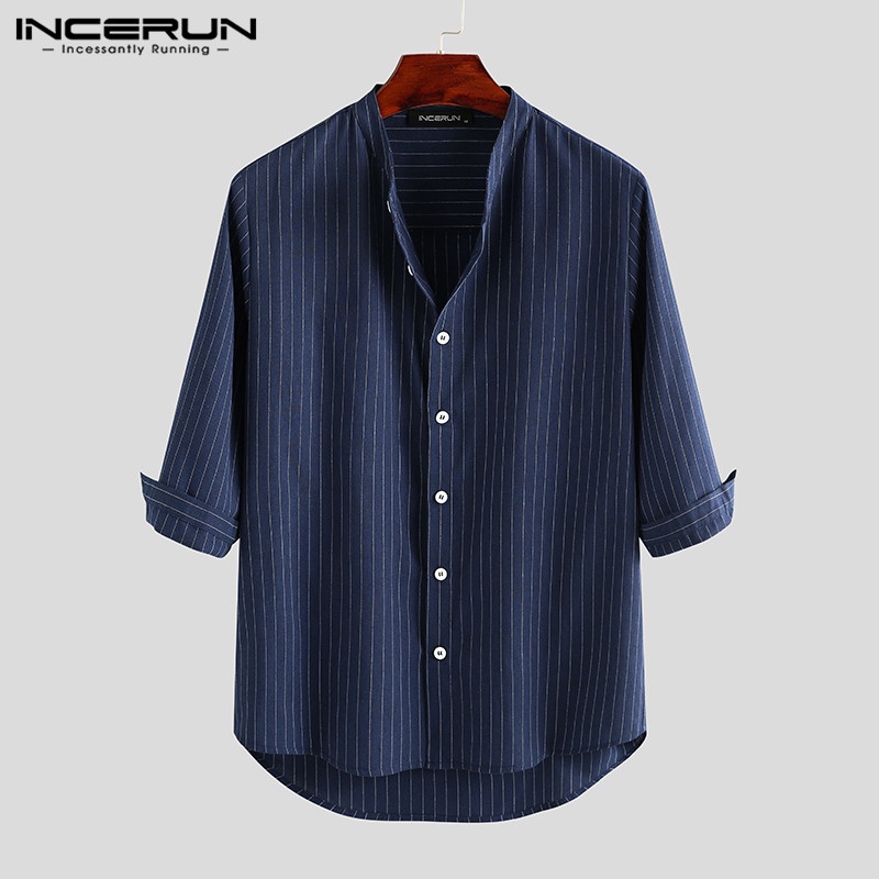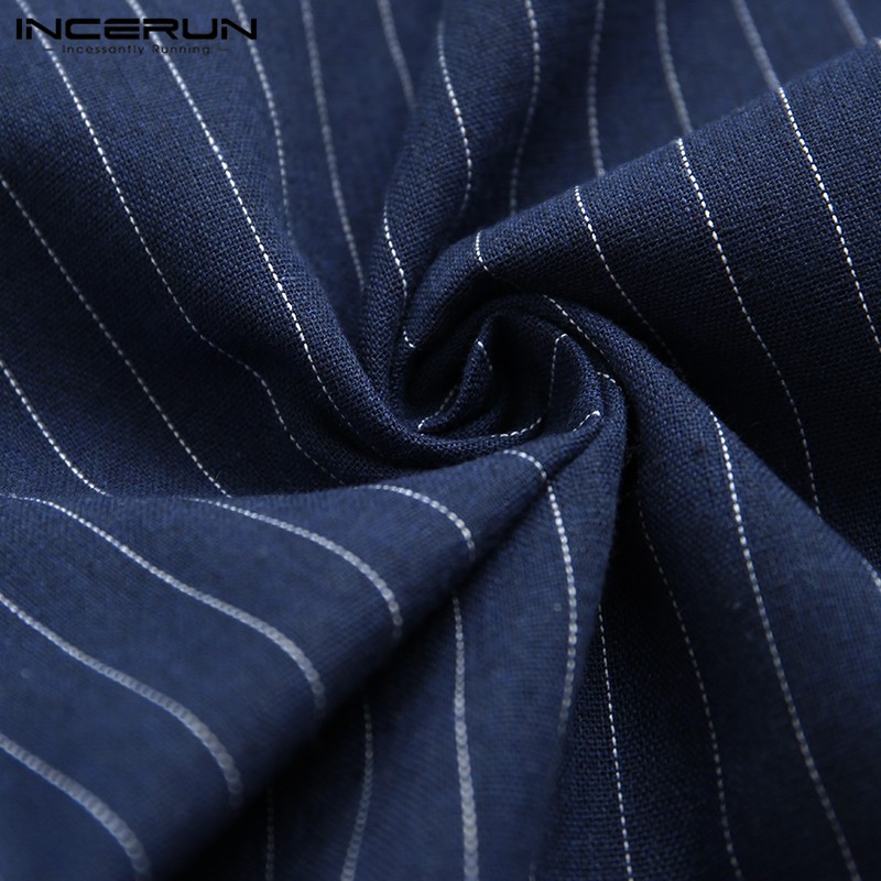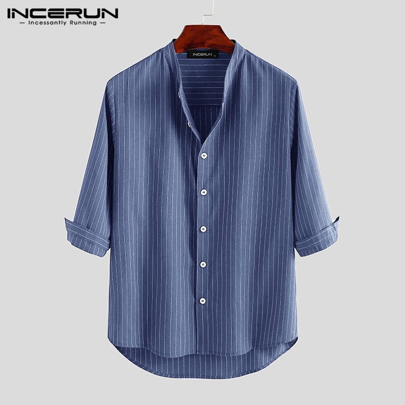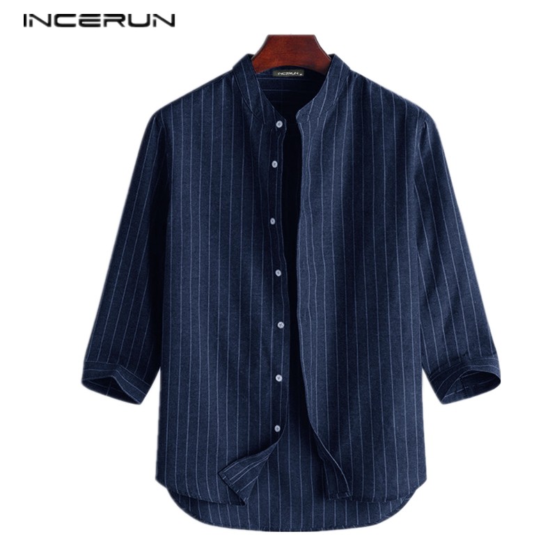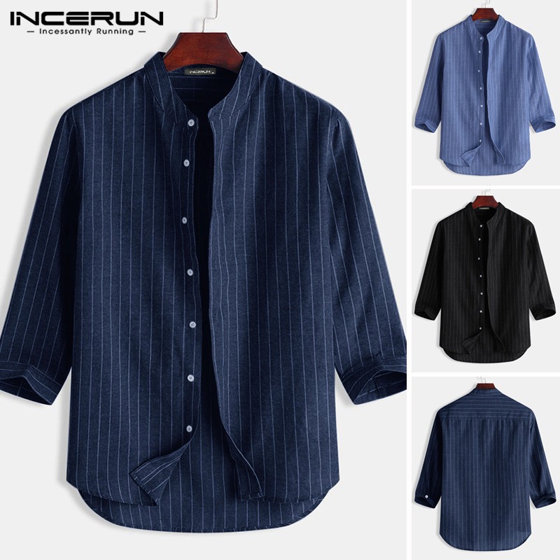 INCERUN เสื้อเชิ้ตลำลอง แขนสามส่วน ลายทาง มีกระดุมหน้า