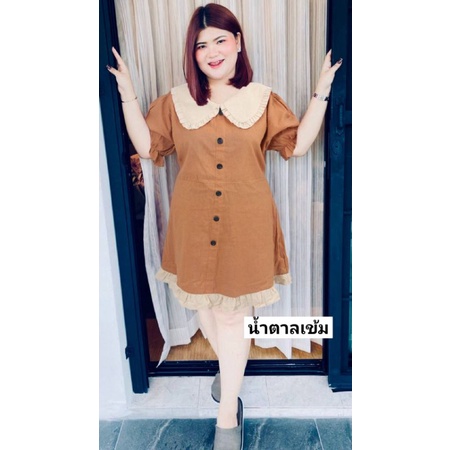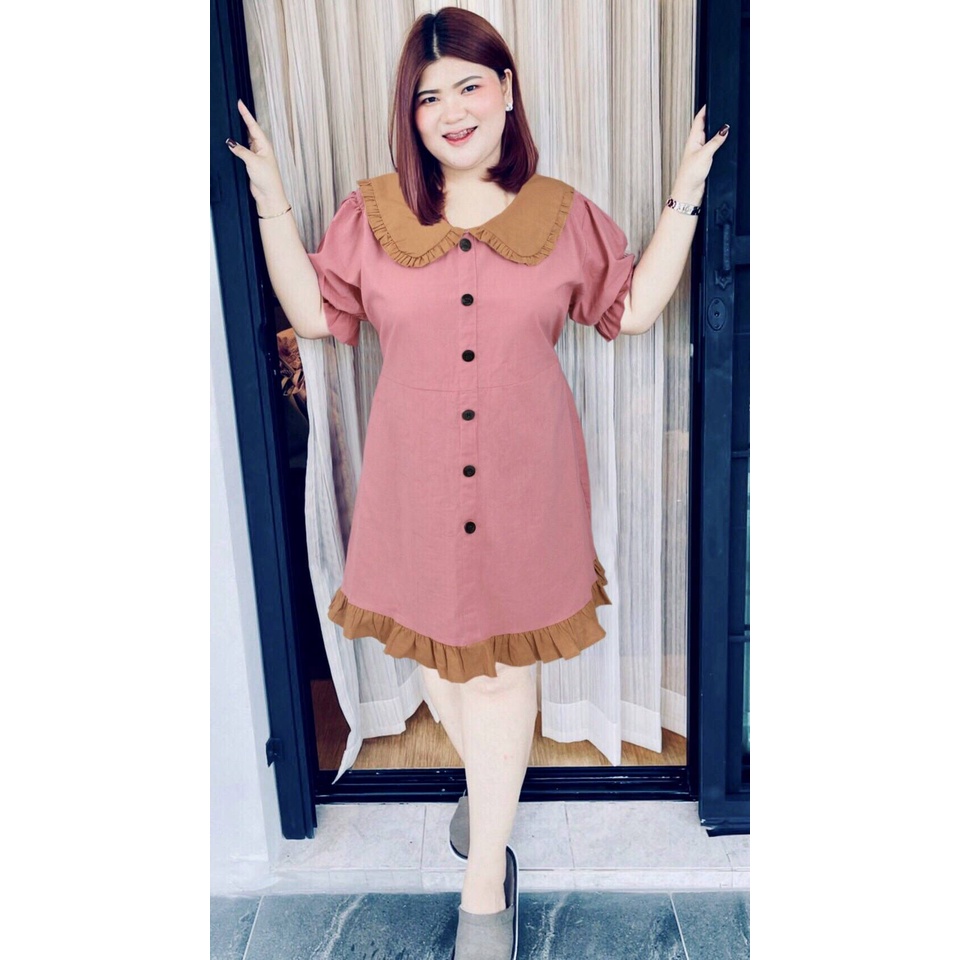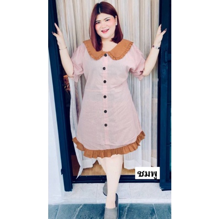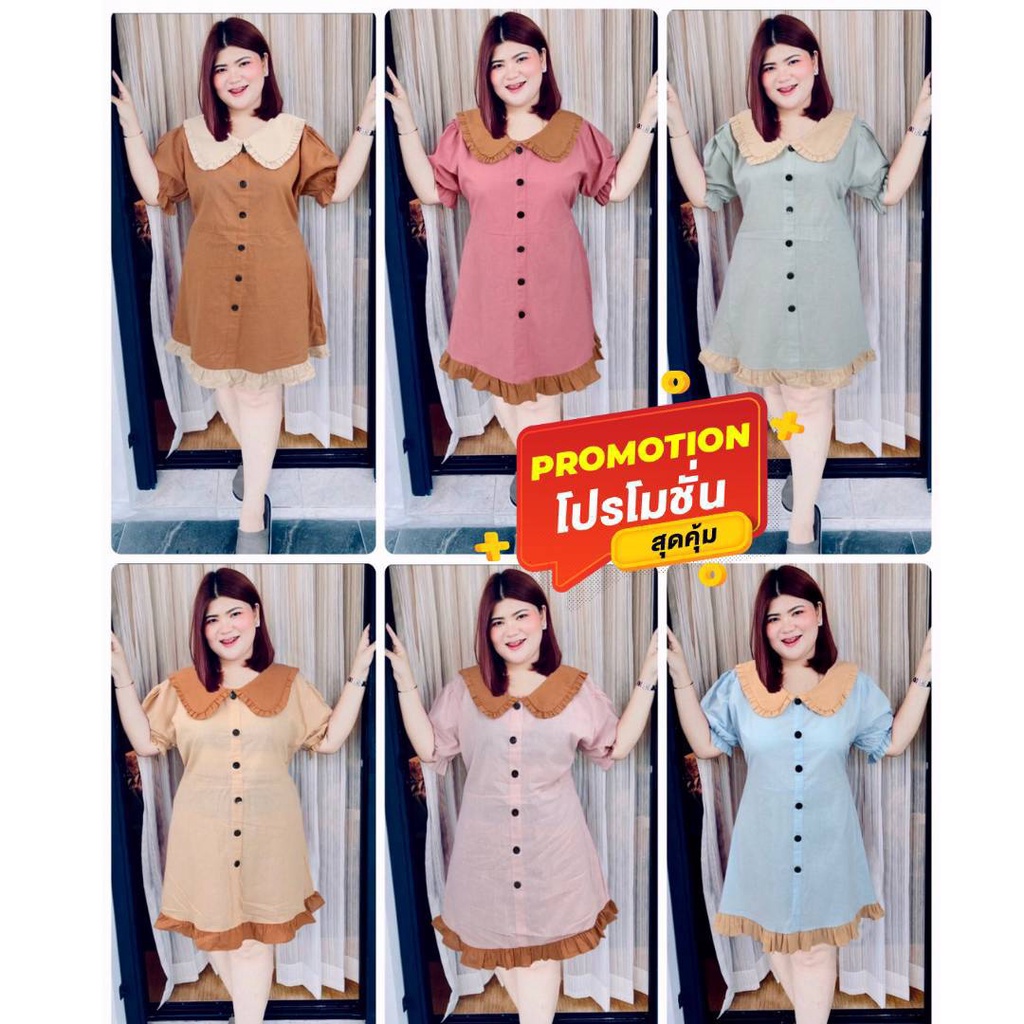 847.Rชุดเดรสสาวอวบปกบัวกระดุมหน้า ผ้าฝ้ายแต่งสีปกน่ารักๆ