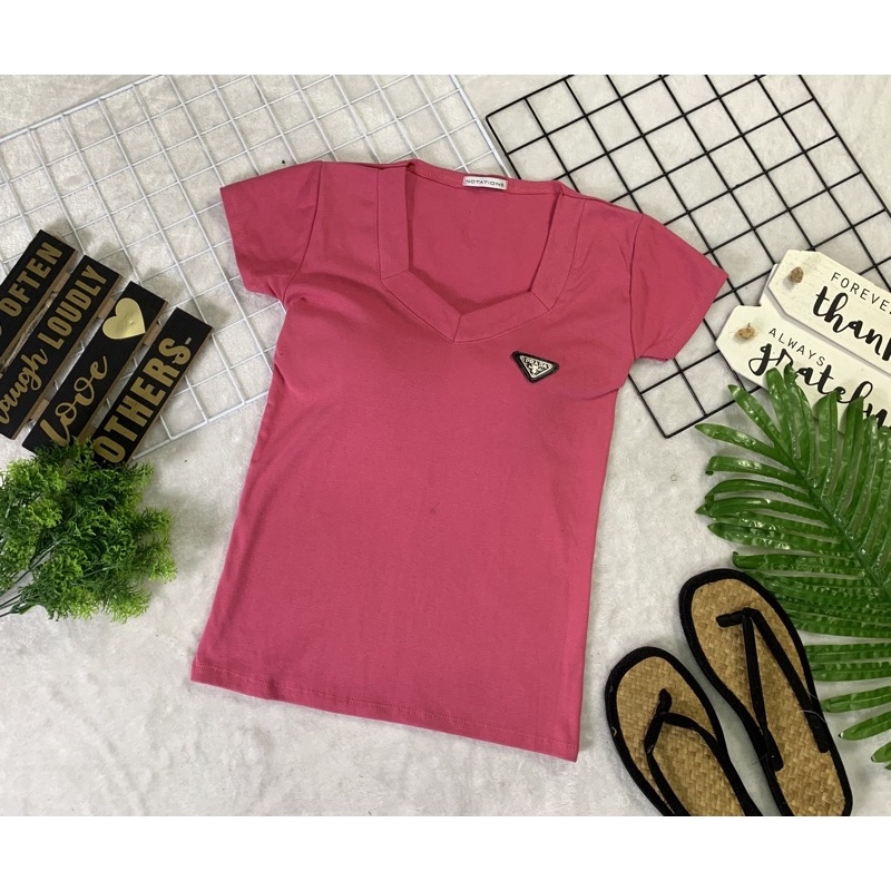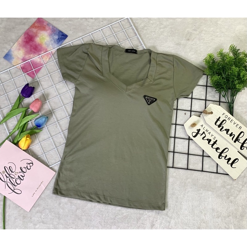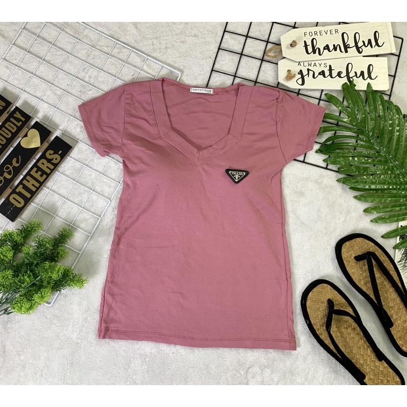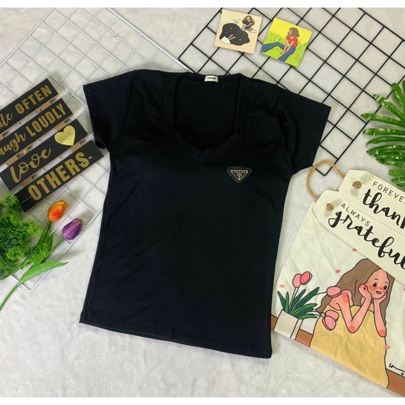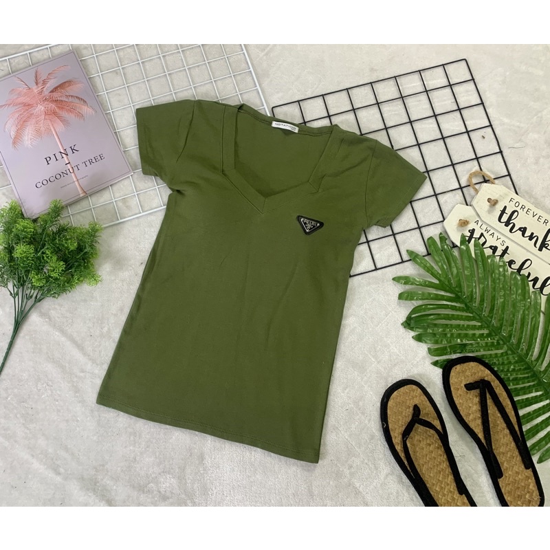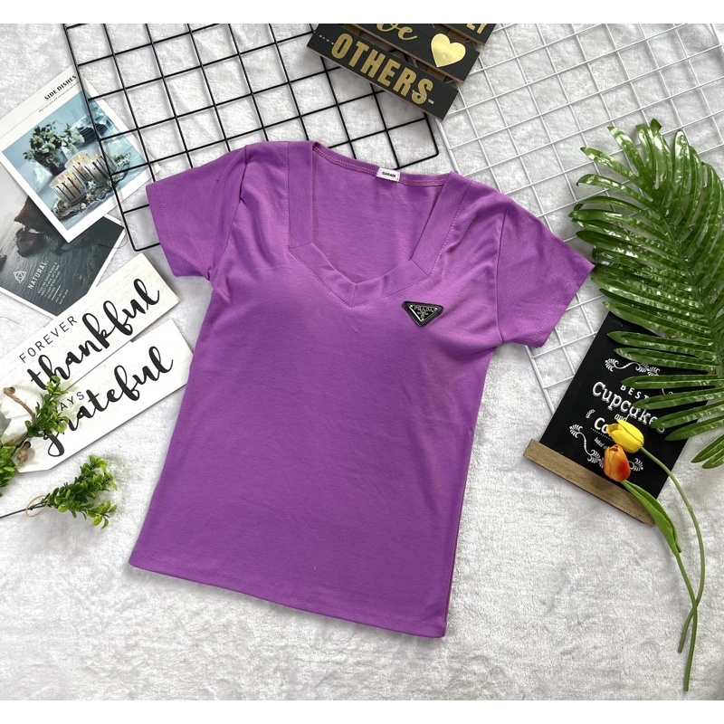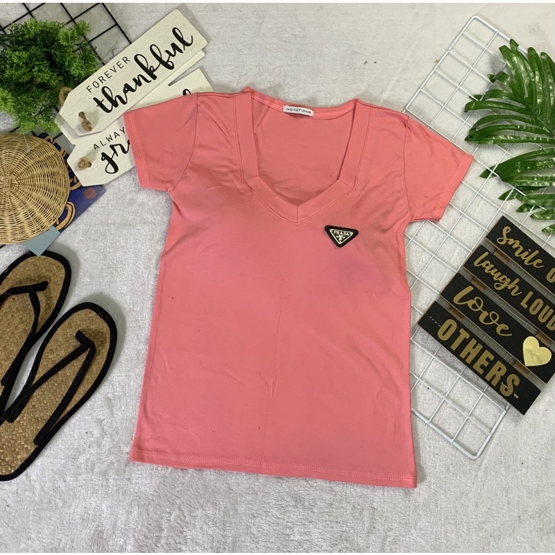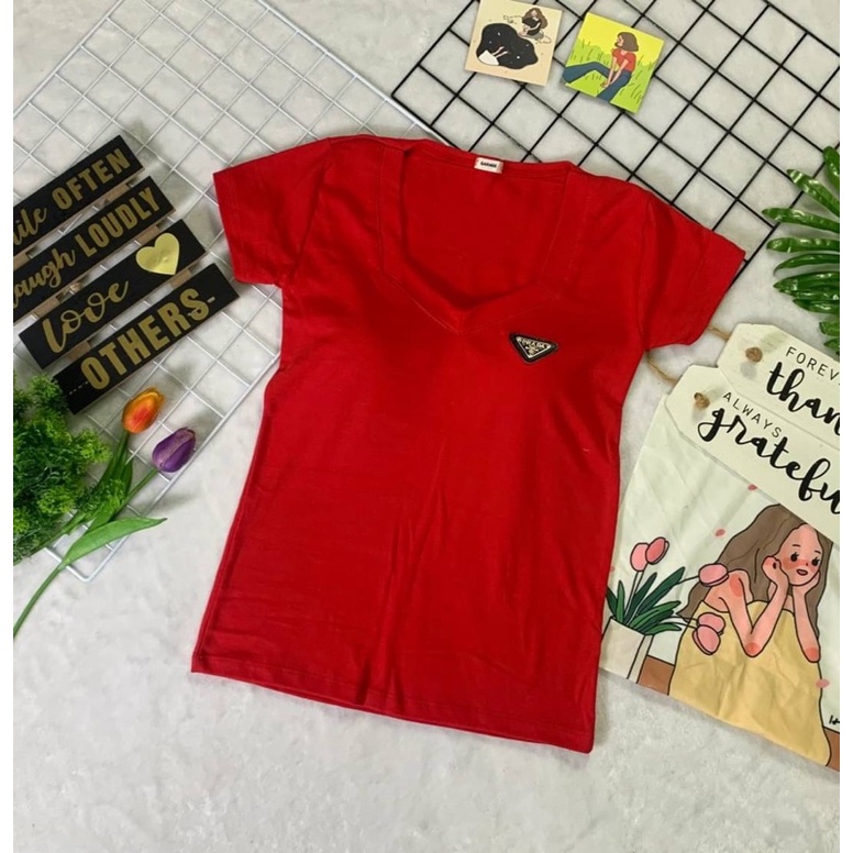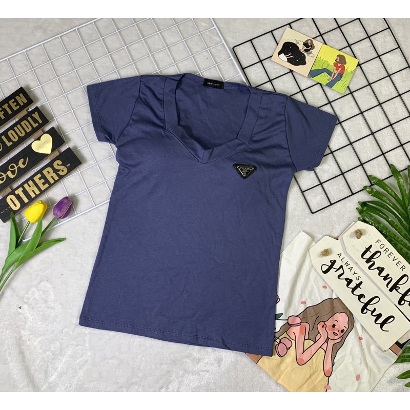 Lalata Vintage เสื้อแขนสั้นผู้หญิง เสื้อยืดแขนสั้น คอวีผ้านิ่ม แต่งป้าย ใส่แล้วทรงสวยสุดๆ