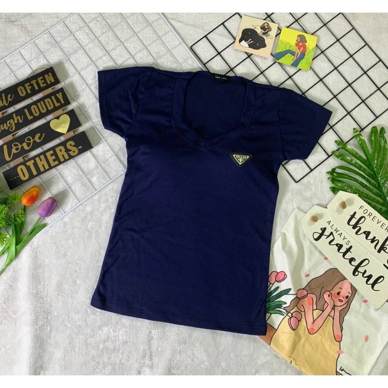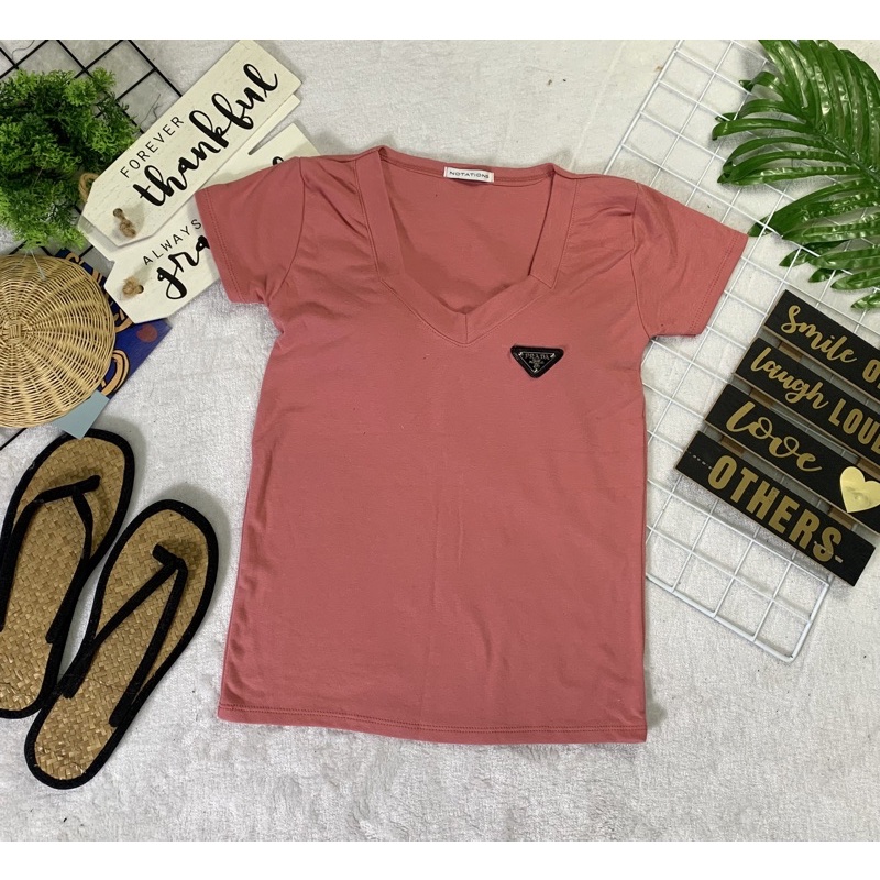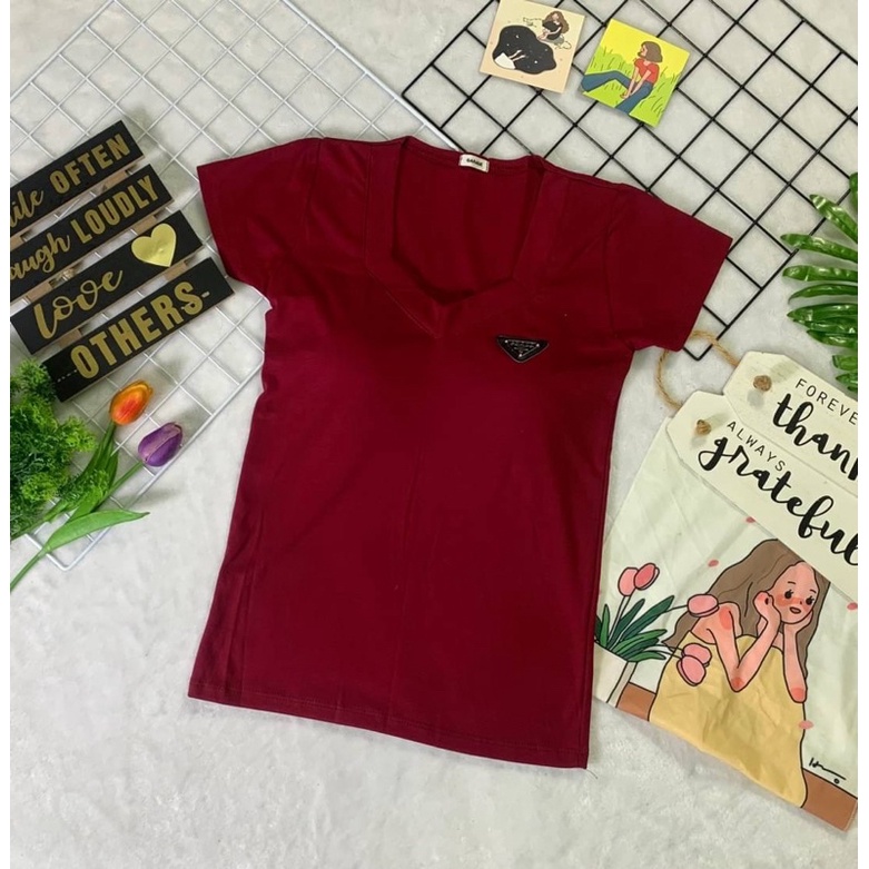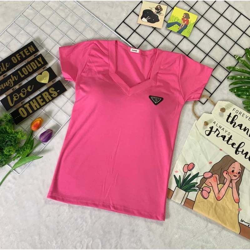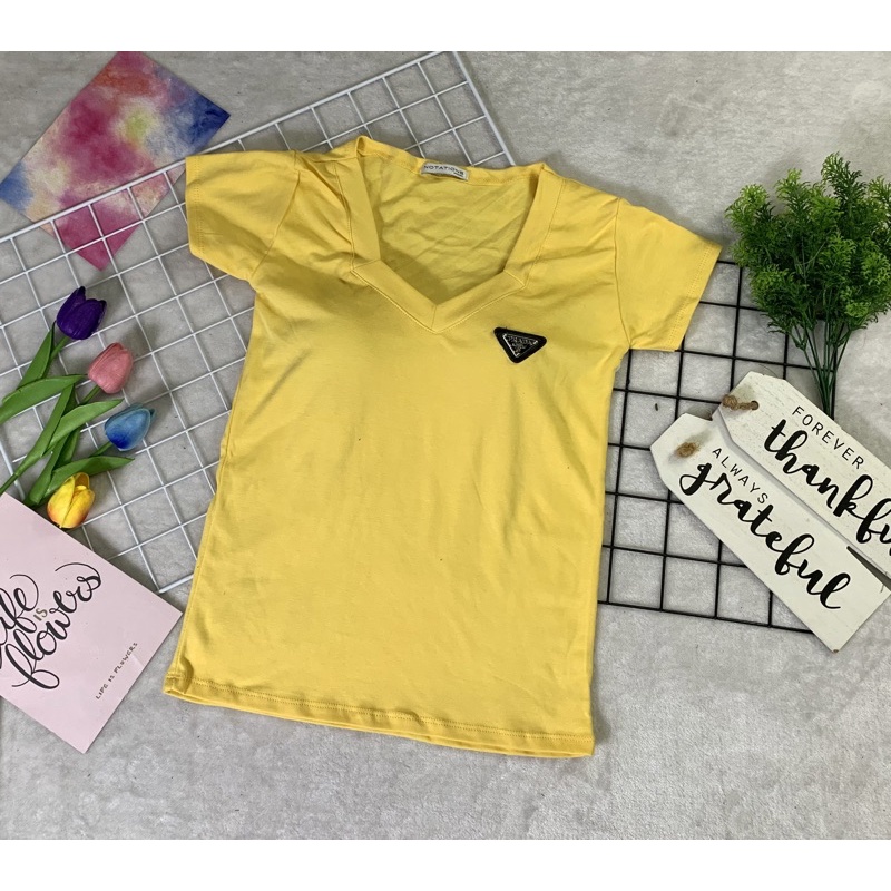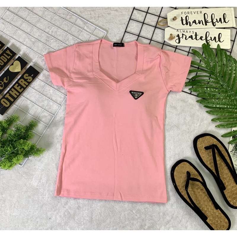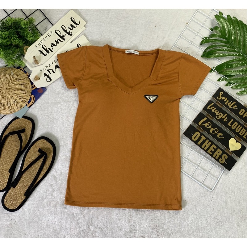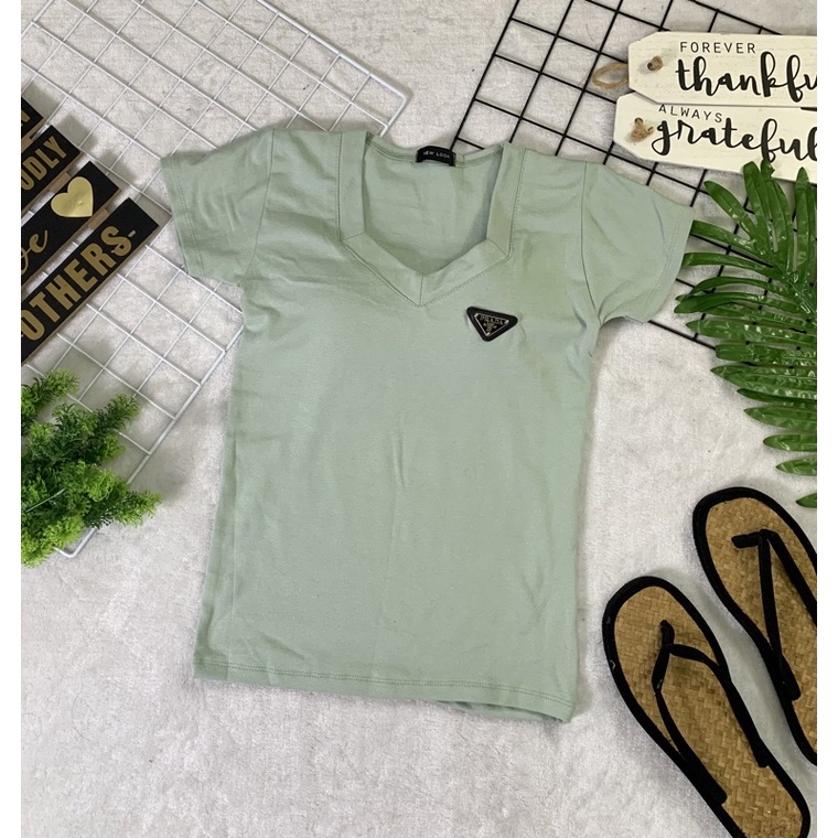 Lalata Vintage เสื้อแขนสั้นผู้หญิง เสื้อยืดแขนสั้น คอวีผ้านิ่ม แต่งป้าย ใส่แล้วทรงสวยสุดๆ