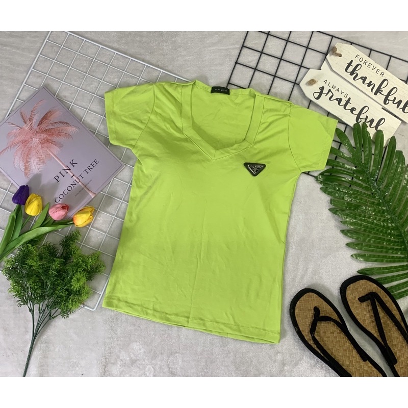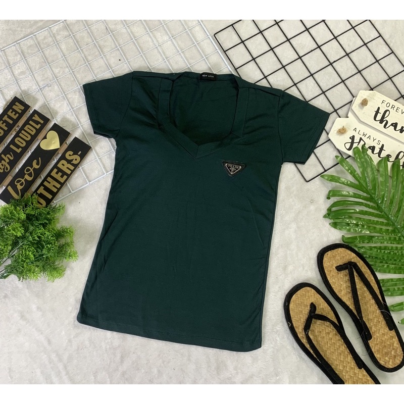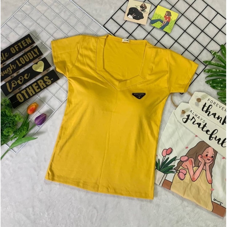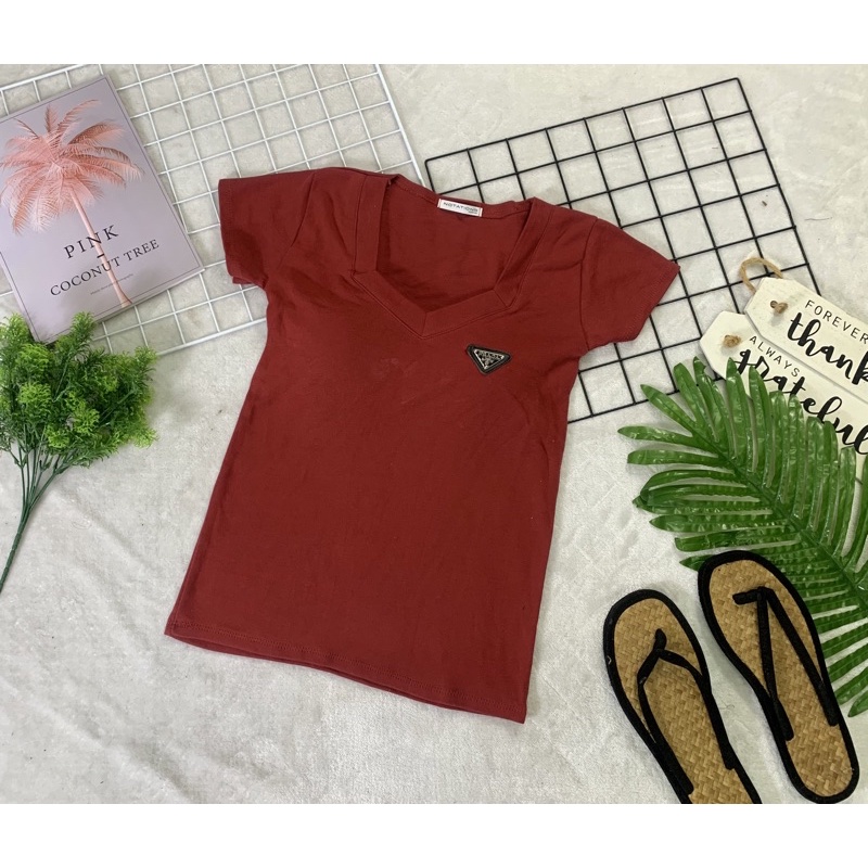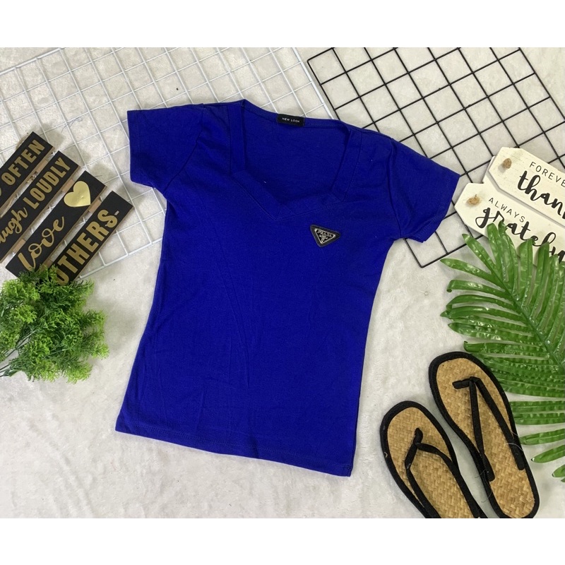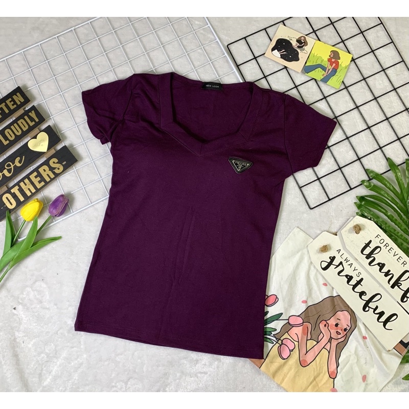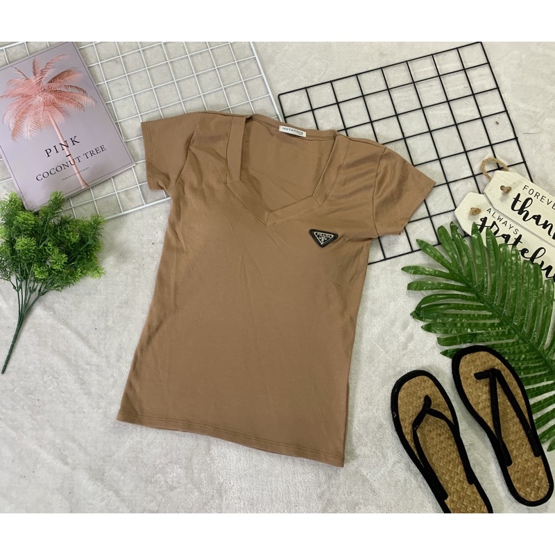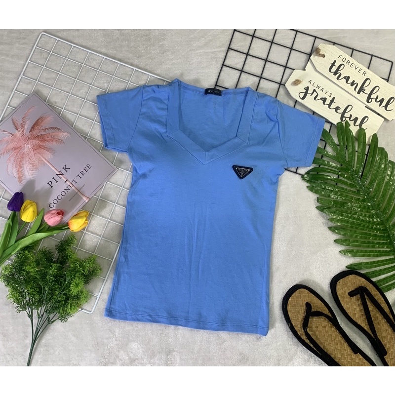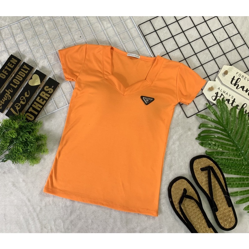 Lalata Vintage เสื้อแขนสั้นผู้หญิง เสื้อยืดแขนสั้น คอวีผ้านิ่ม แต่งป้าย ใส่แล้วทรงสวยสุดๆ