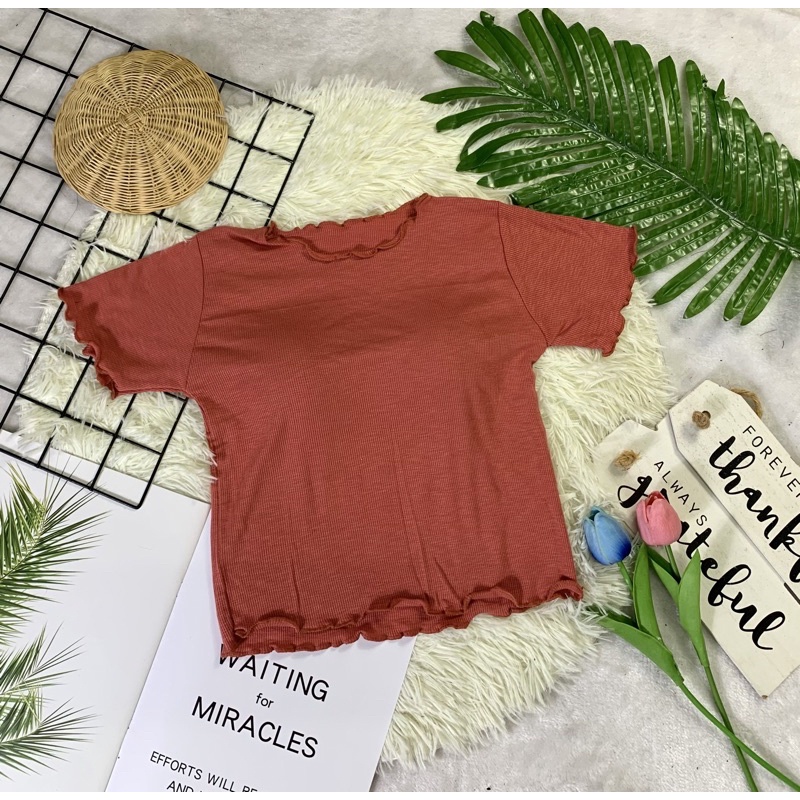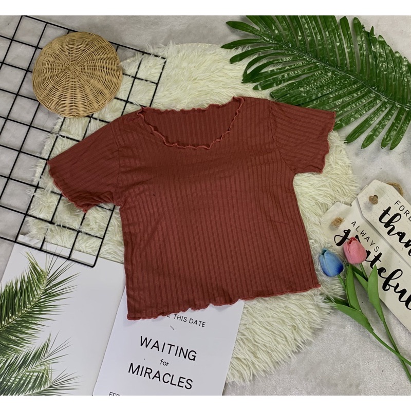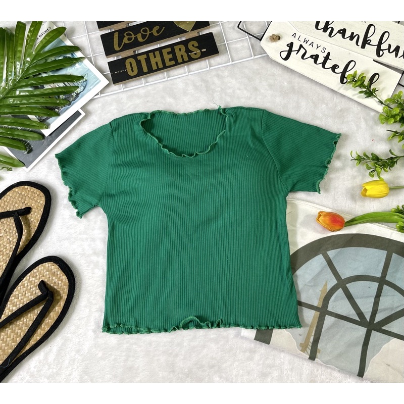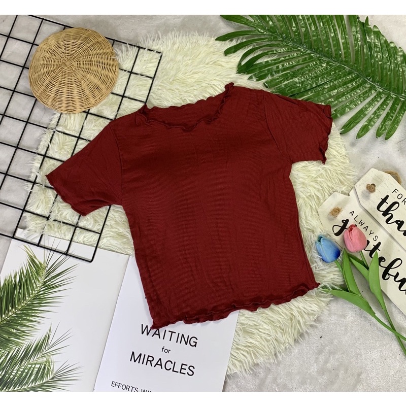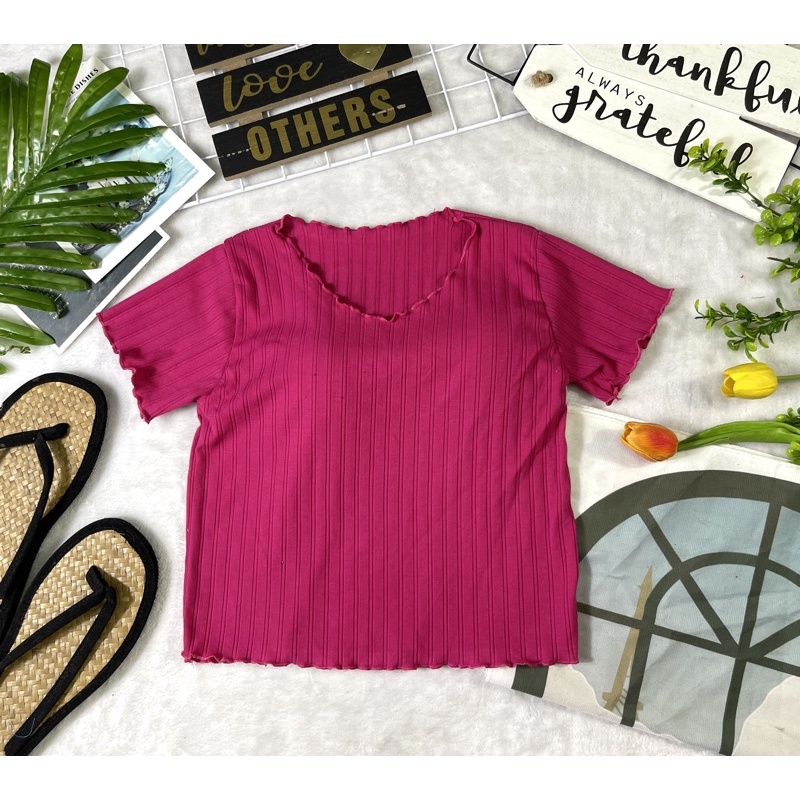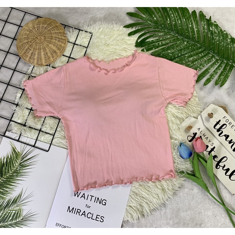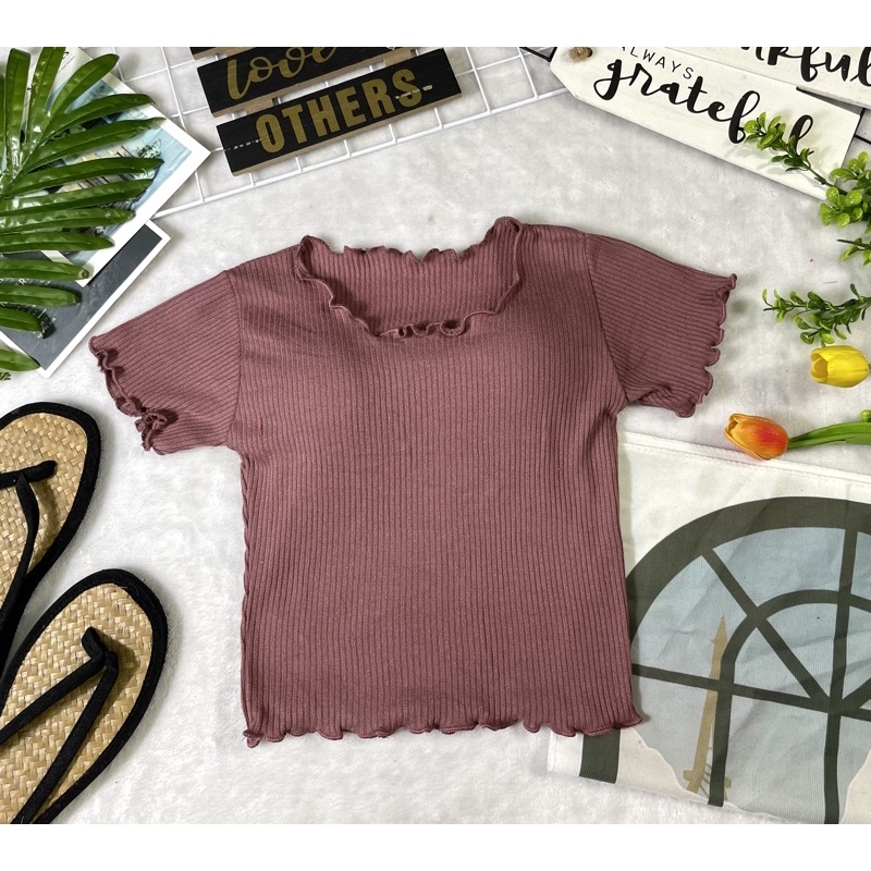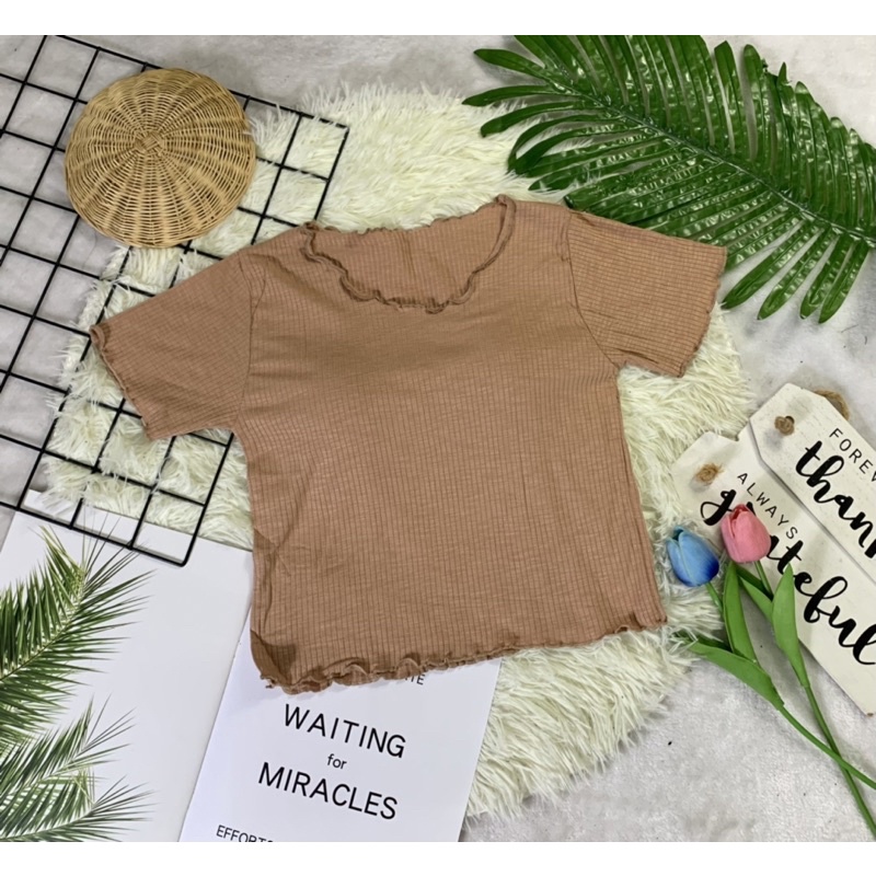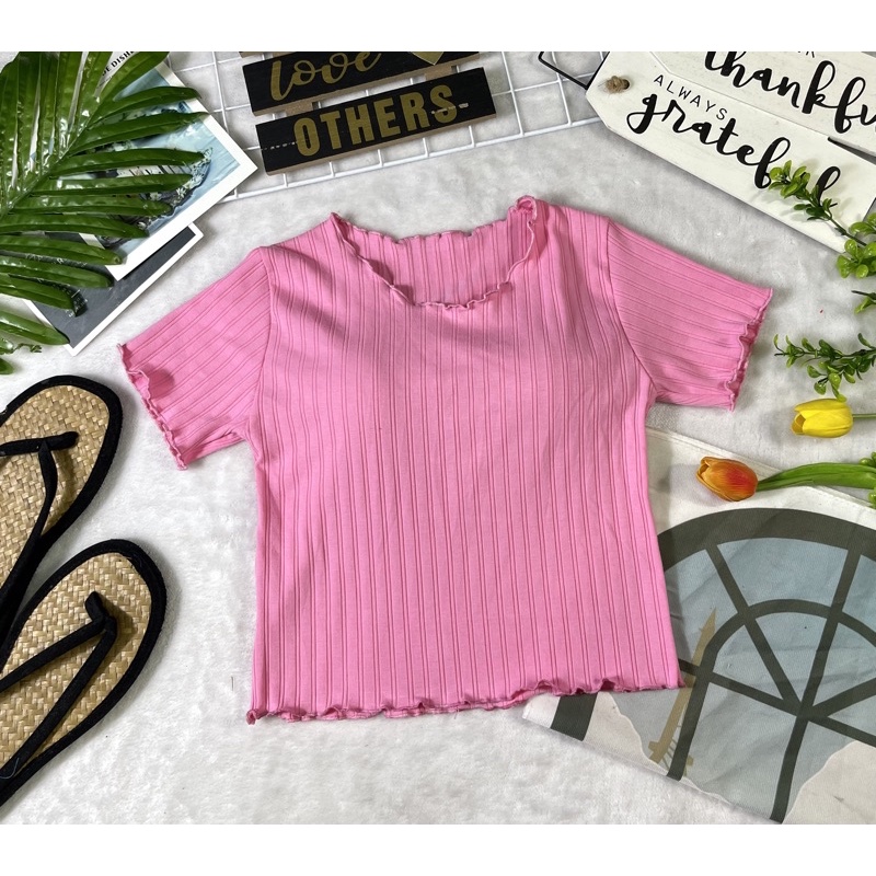 Lalata Vintage Crop Top ครอปหยัก เสื้อครอป ครอปผ้าร่อง ผ้ายืด คอกลม ชายมีระบาย (มี 19 สีให้เลือก)