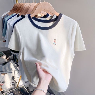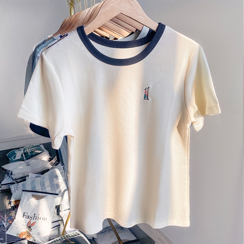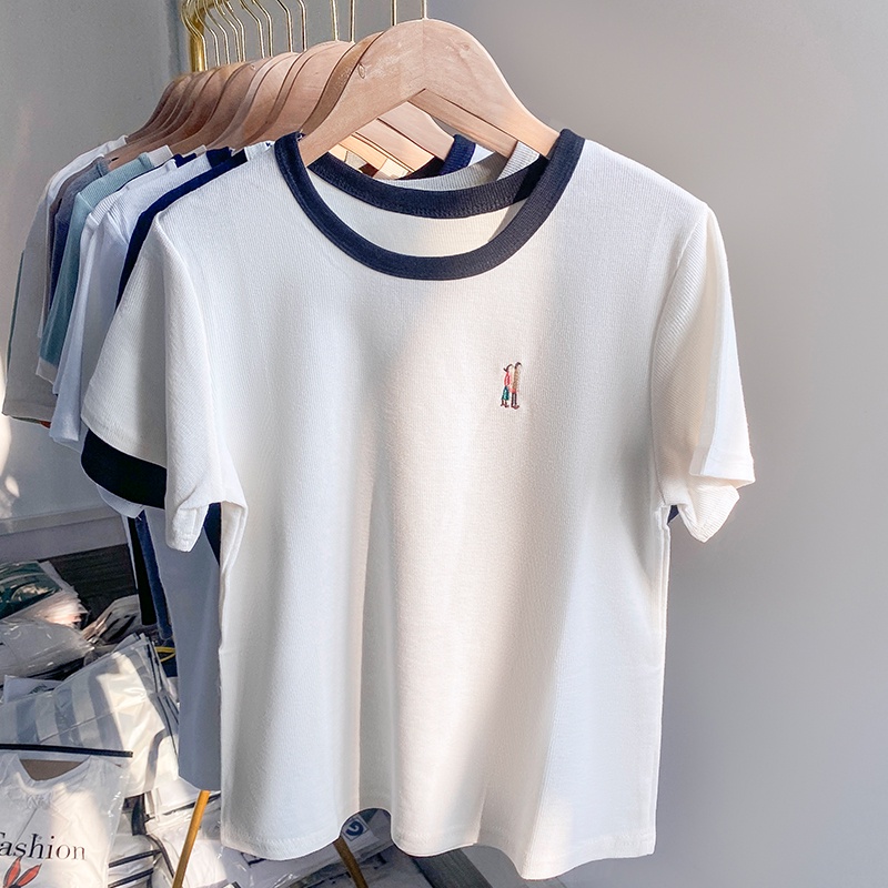 52253 เสื้อยืดแขนสั้น ผ้าฝ้ายแท้ ปักลาย สีตัดกัน แฟชั่นฤดูร้อน