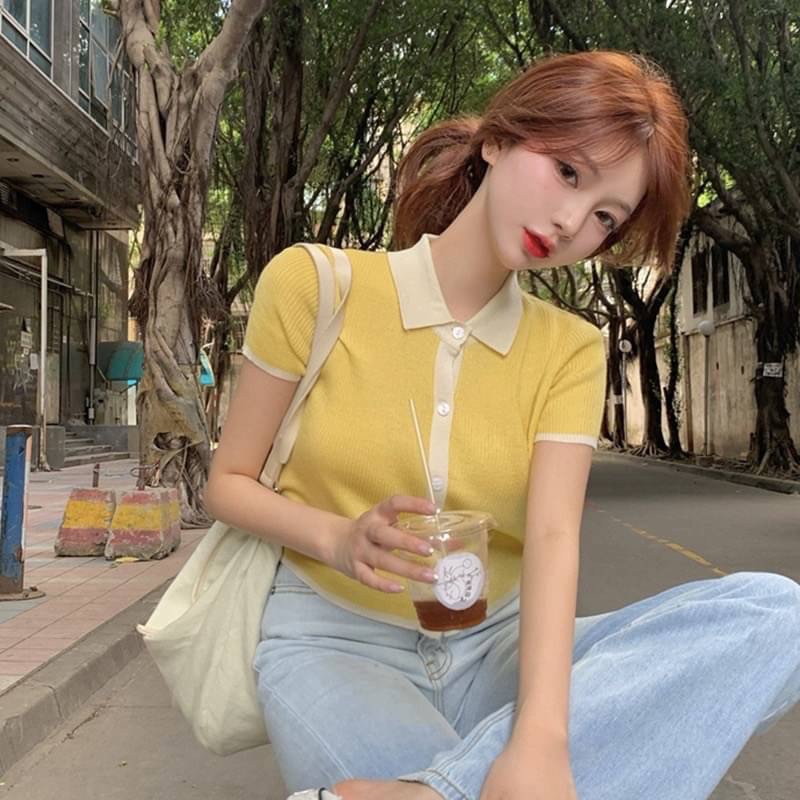 Mollygirlเสื้อครอปคอปก มีกระดุมใช้งานได้แมทง่าย ใส่ทำงานได้