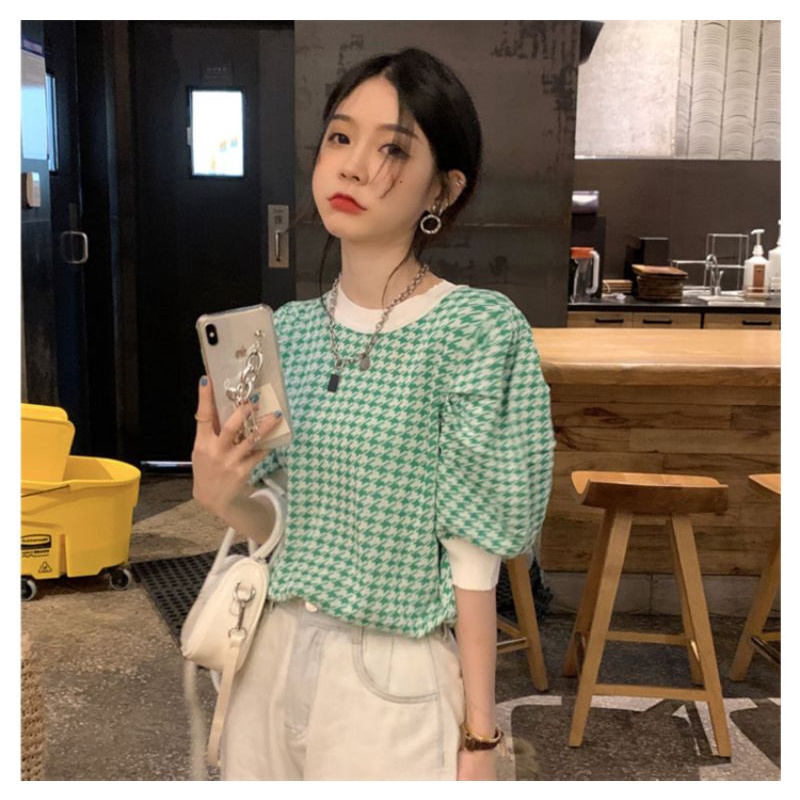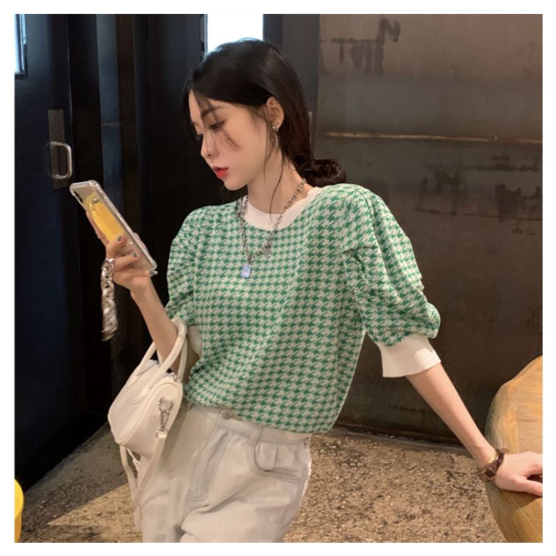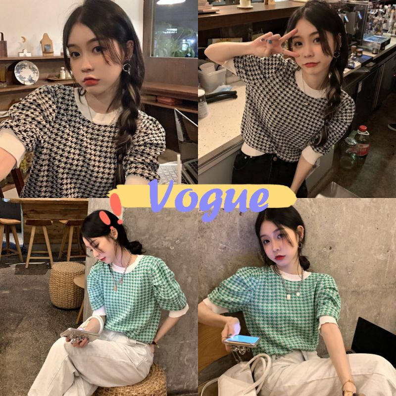 Vogue🌟พร้อมส่ง🌟 เสื้อไหมพรม คอกลม แขนสั้น ลายชิโนริผ้านิ่มใส่สบาย (6392) -N