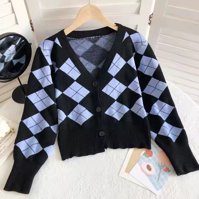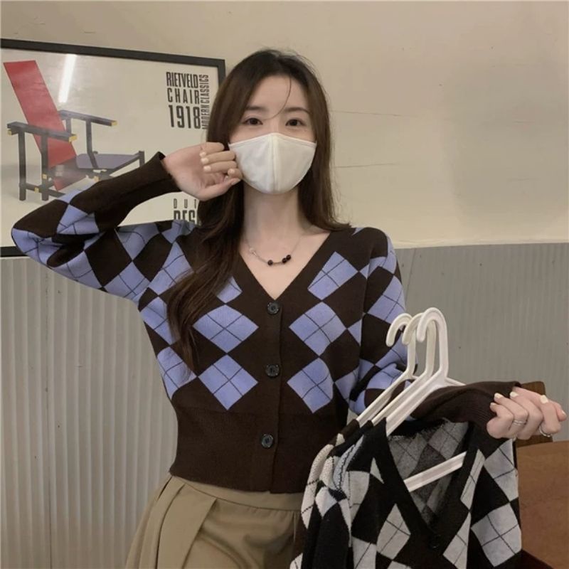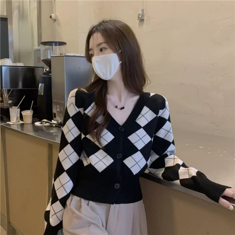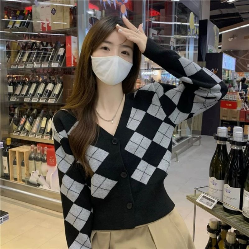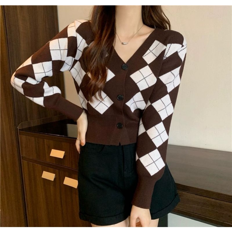 Vogue🌟พร้อมส่ง🌟เสื้อไหมพรมแขนยาวกระดุมด้านหน้า ดีเทลลายตารางหมากรุกเก๋ๆ (85028) -N