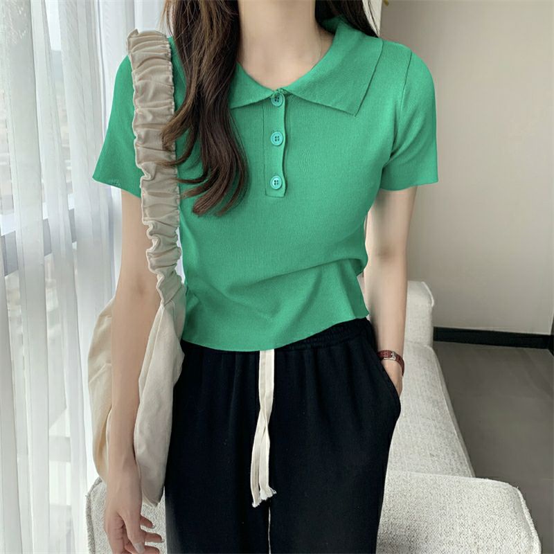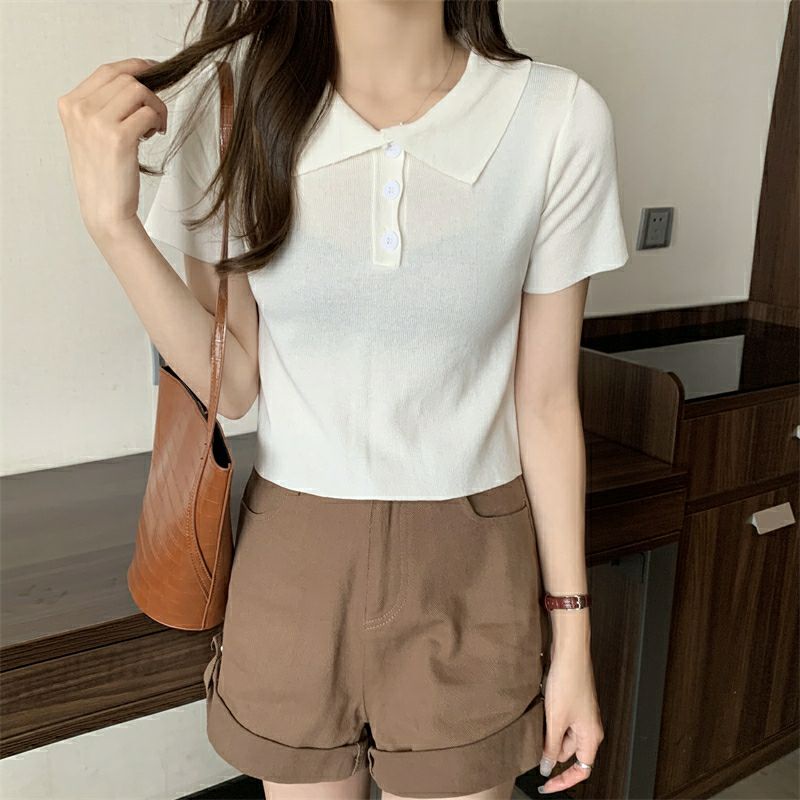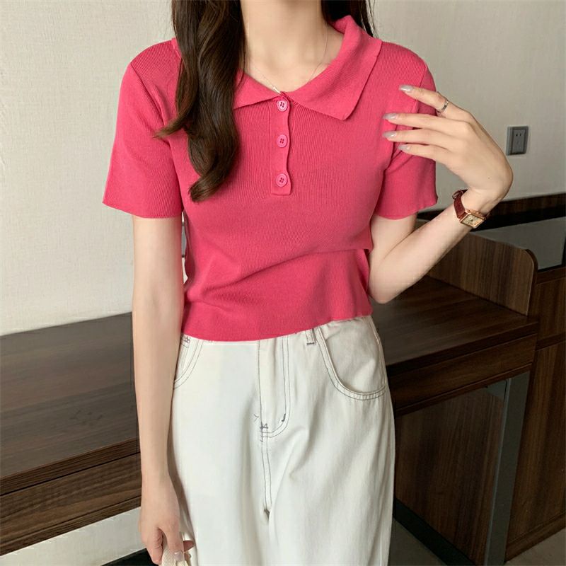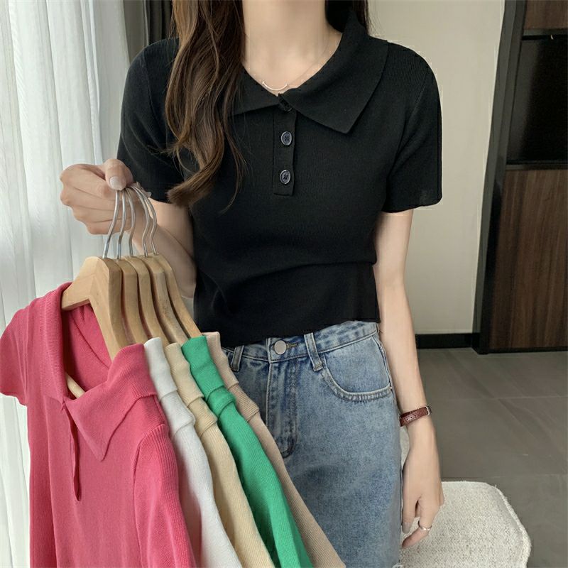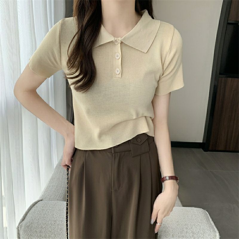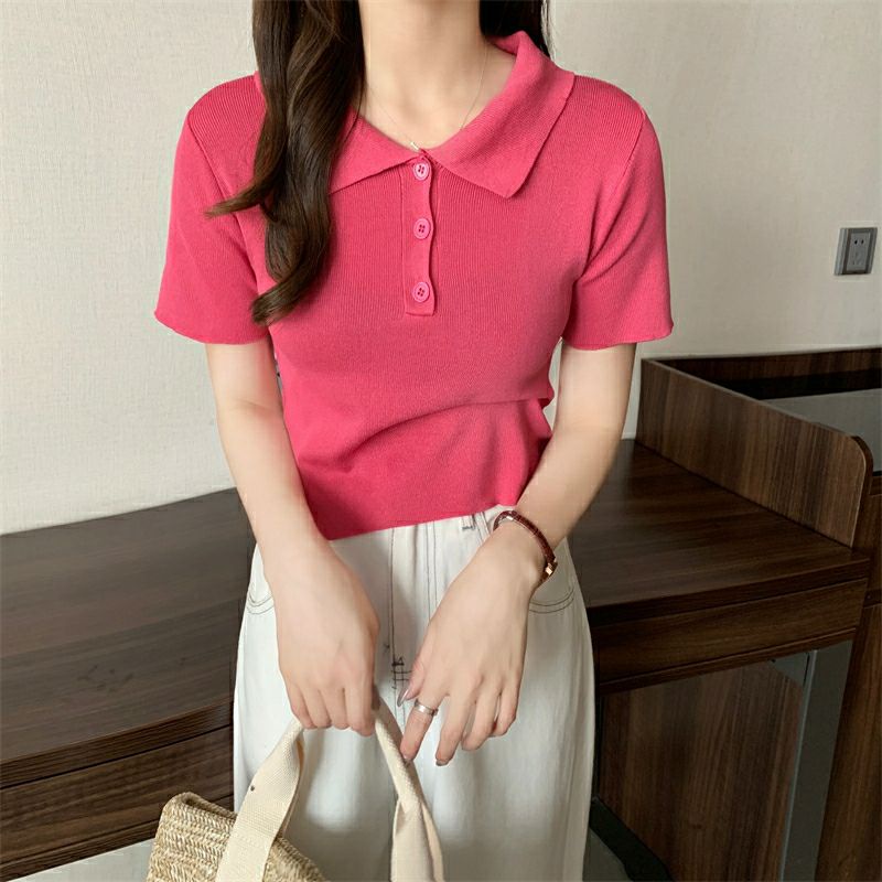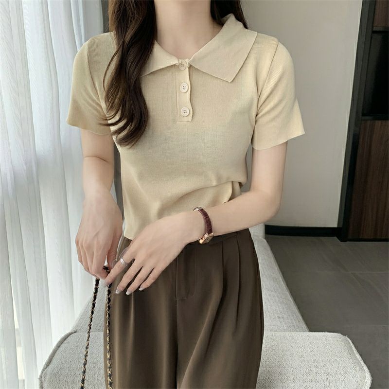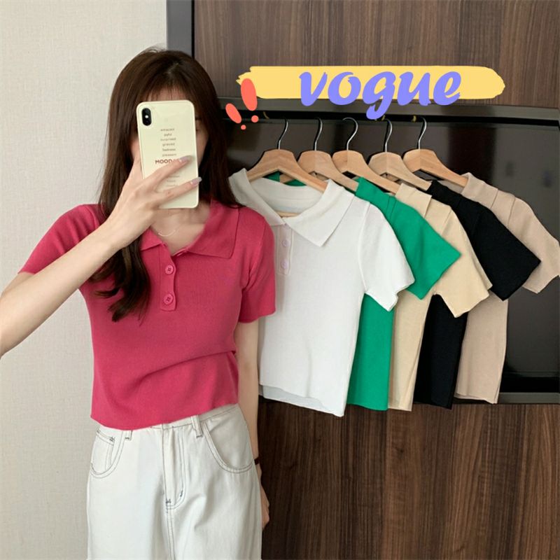 Vogue🌟พร้อมส่ง🌟 เสื้อไหมพรมแขนสั้น คอปก แนวมินิมอลน่ารักสไตล์เกาหลีมาก (8293)