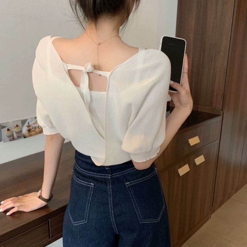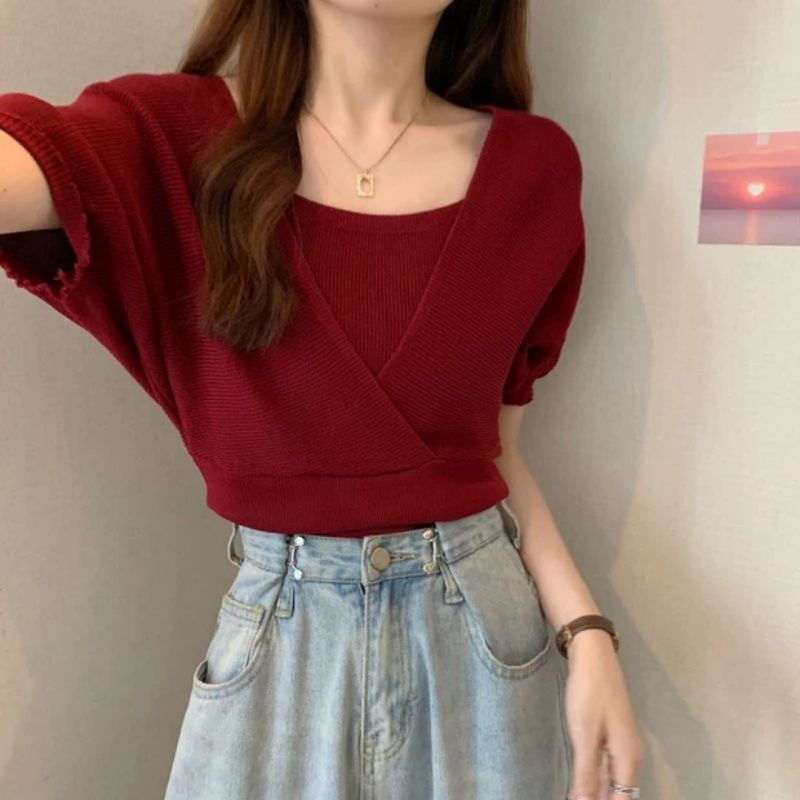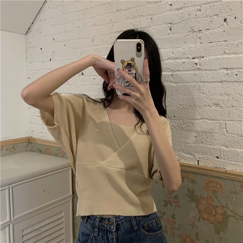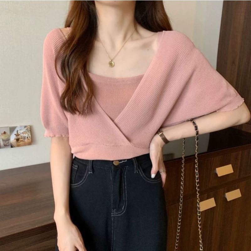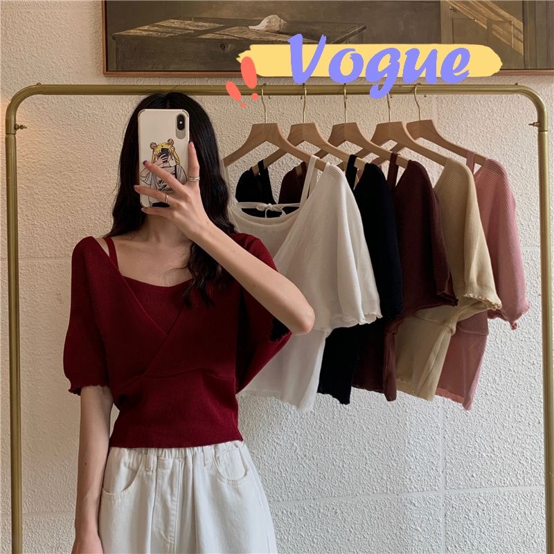Vogue🌟พร้อมส่ง🌟เสื้อไหมพรมเปิดไหล่แขนสั้น ผ้าร่องนิ้มใส่สบายมาก (3018)
