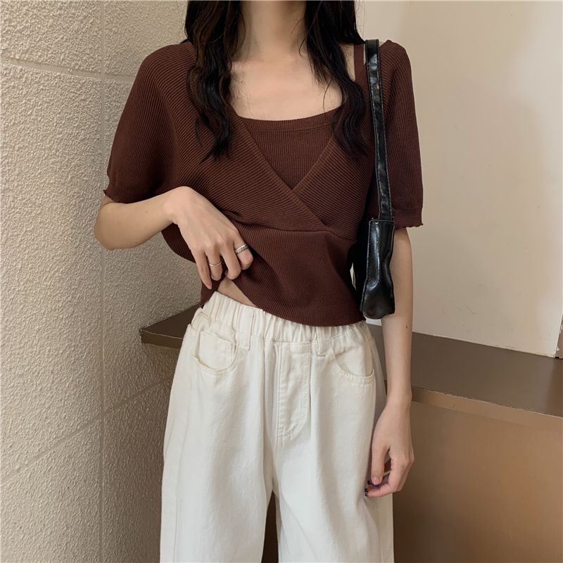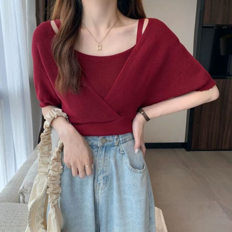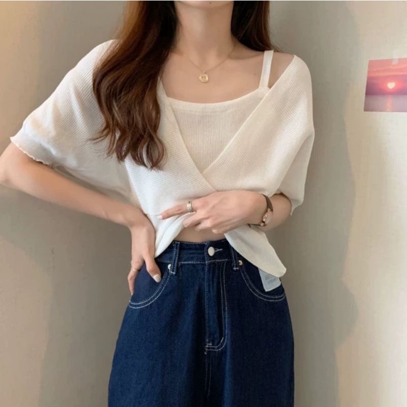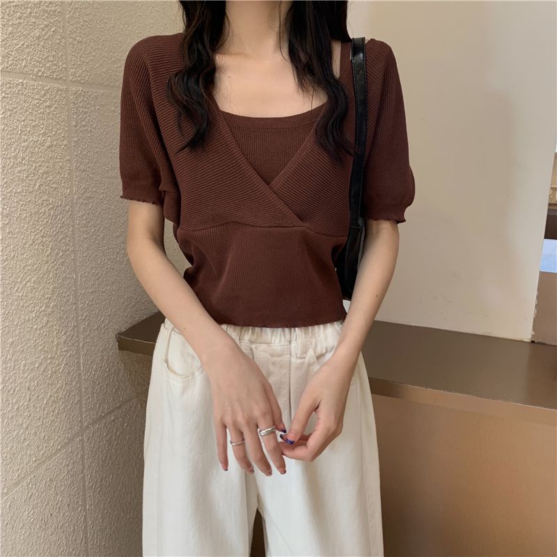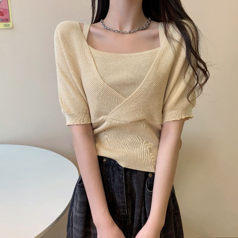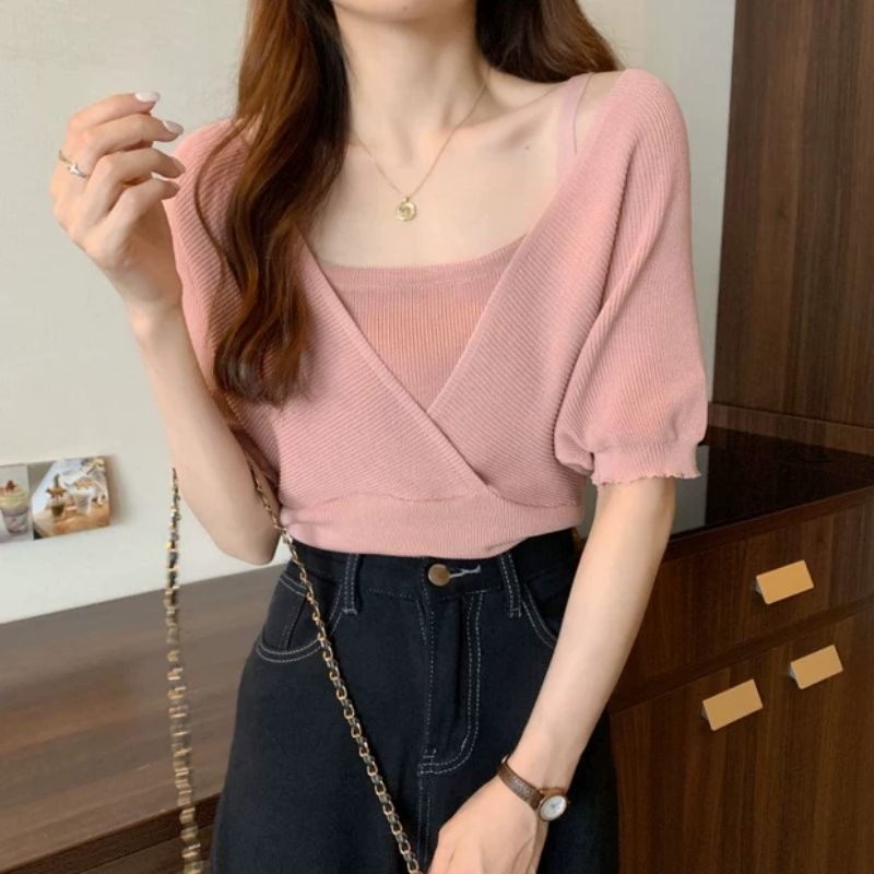 Vogue🌟พร้อมส่ง🌟เสื้อไหมพรมเปิดไหล่แขนสั้น ผ้าร่องนิ้มใส่สบายมาก (3018)