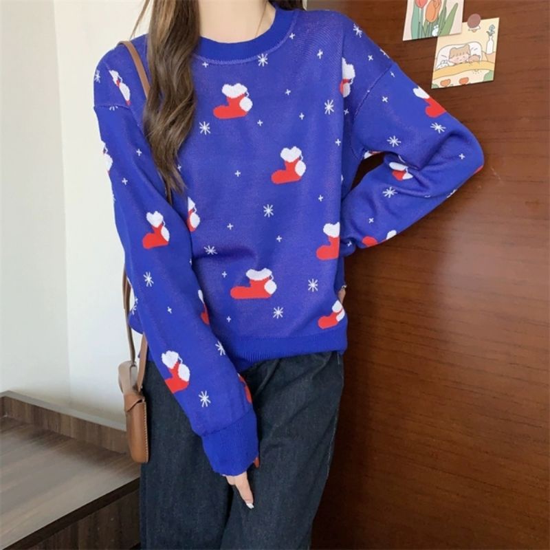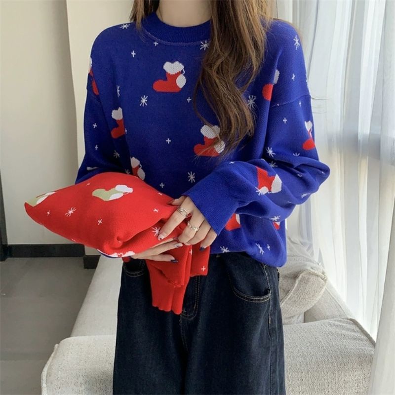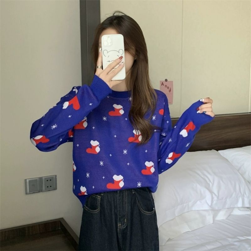 Vogue🌟พร้อมส่ง🌟เสื้อไหมพรมแชนยาว ลายถุงเท้าคริสต์มาส น่ารักมาก (C516)-N