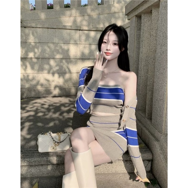 Vogue🌟พร้อมส่ง🌟 ขายรวกัน เสื้อเกาะอก/กระโปรง/เสื้อคลุม ลายทาง (8772+8772-1+8772-2)-N