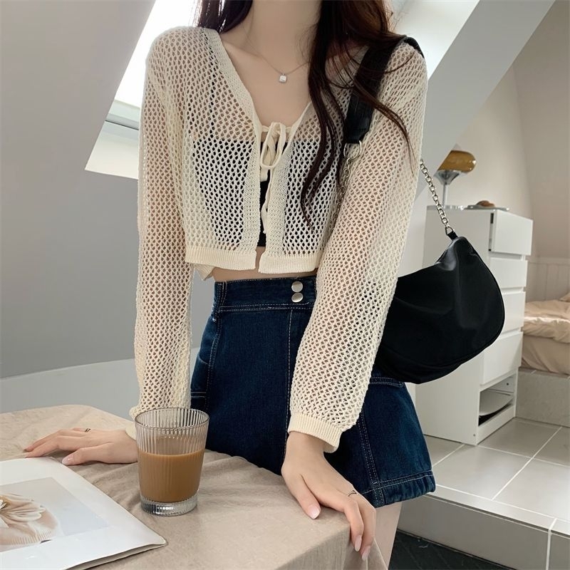 Vogue🌟พร้อมส่ง🌟 เสื้อคลุมไหมพรมแขนยาว ดีเทลถักไหมพรม ซีทรูเบาๆน่ารัก (3186) -C