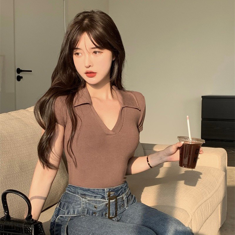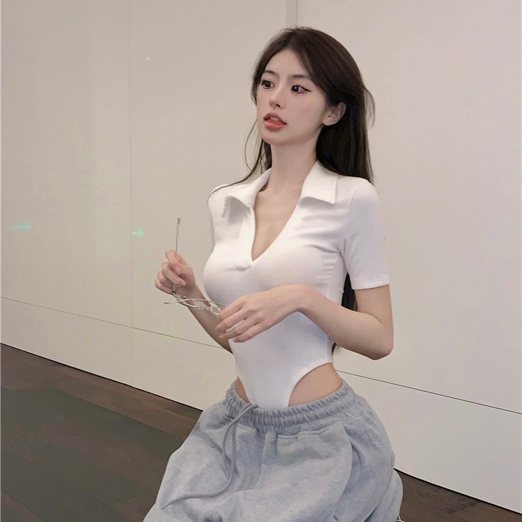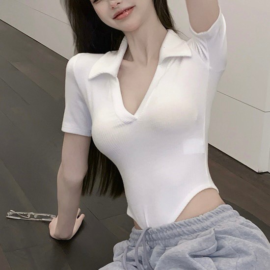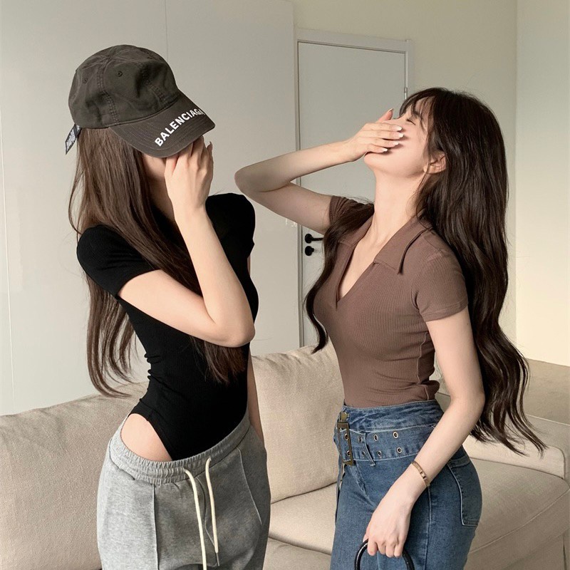 Vogue🌟พร้อมส่ง🌟 เสื้อบอดี้สูทไหมพรมดีเทลหน้าวีแต่งคอปกแขนสั้น สายฝอมาก (DX-9732-H/D15) -N