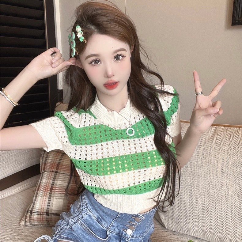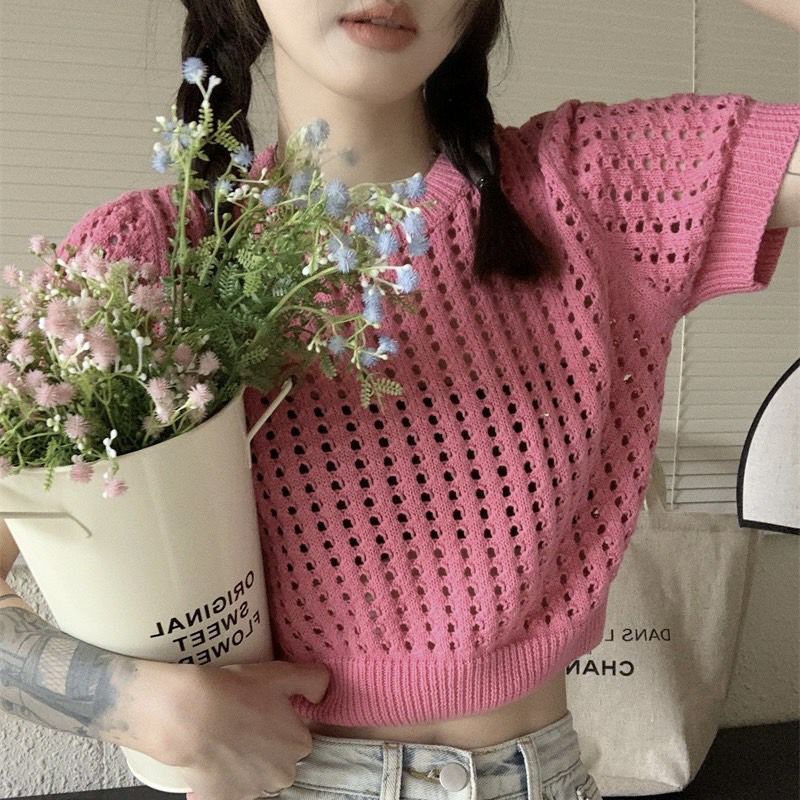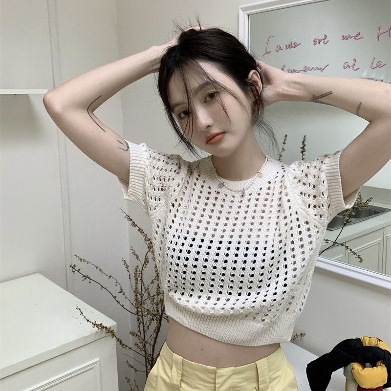 Vogue🌟พร้อมส่ง🌟 เสื้อถักไหมพรมแขนสั้น ซีทรูเบาๆสไตล์เกาหลีมาก (99025/99025-1-C) -N