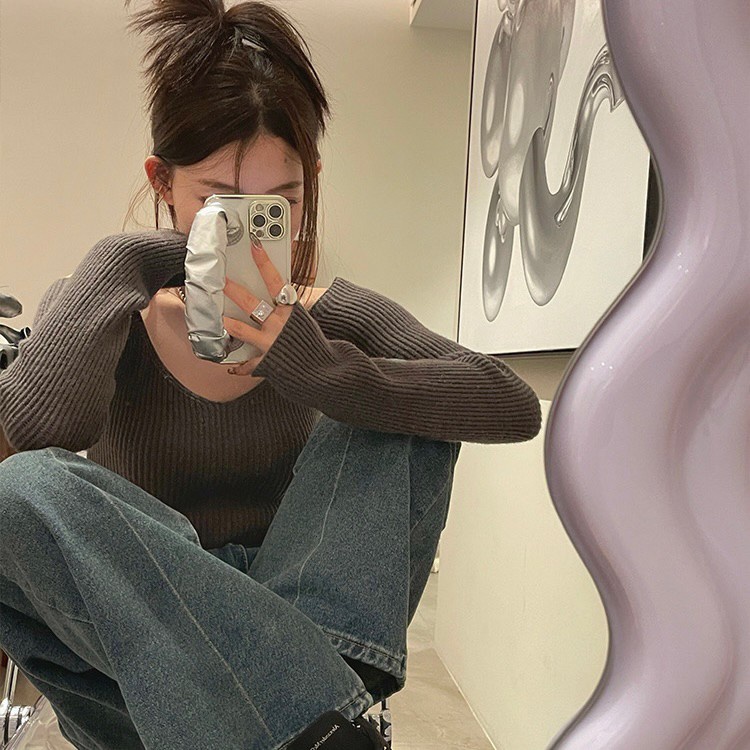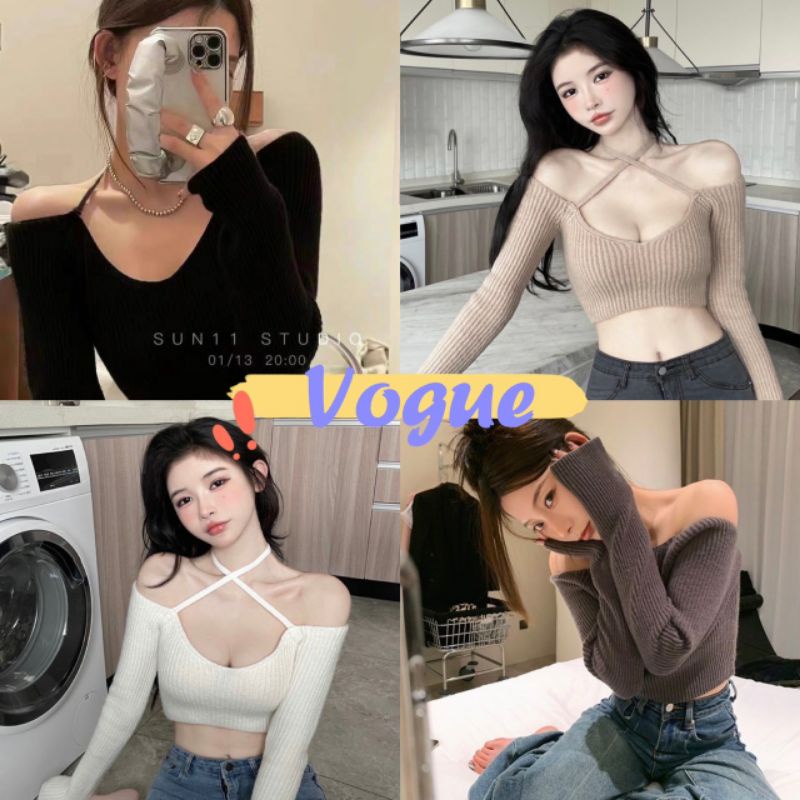 Vogue🌟พร้อมส่ง🌟เสื้อไหมพรมเปิดไหล่ มีสายผูกได้ให้แบบน่ารักผ้าขนนิ่มมาก (0242) -N