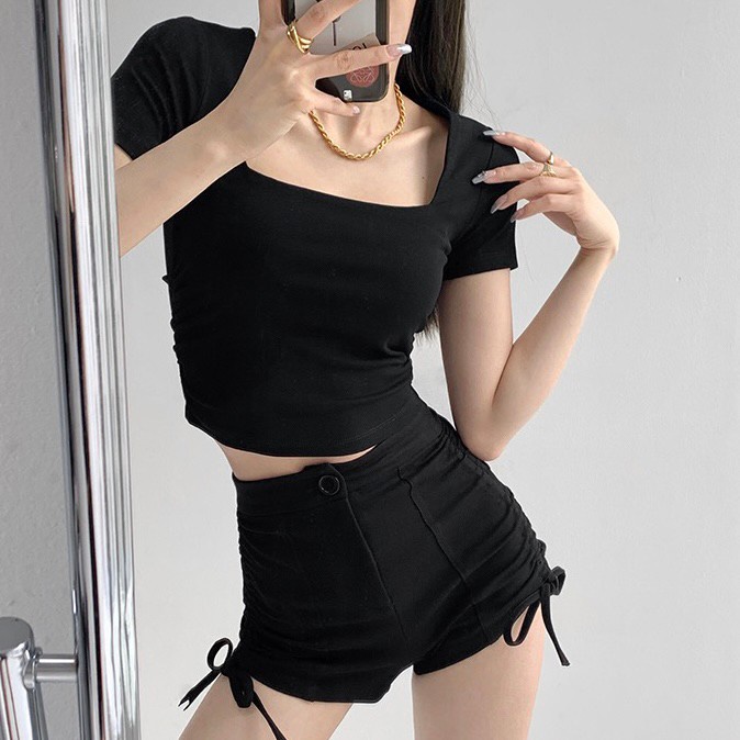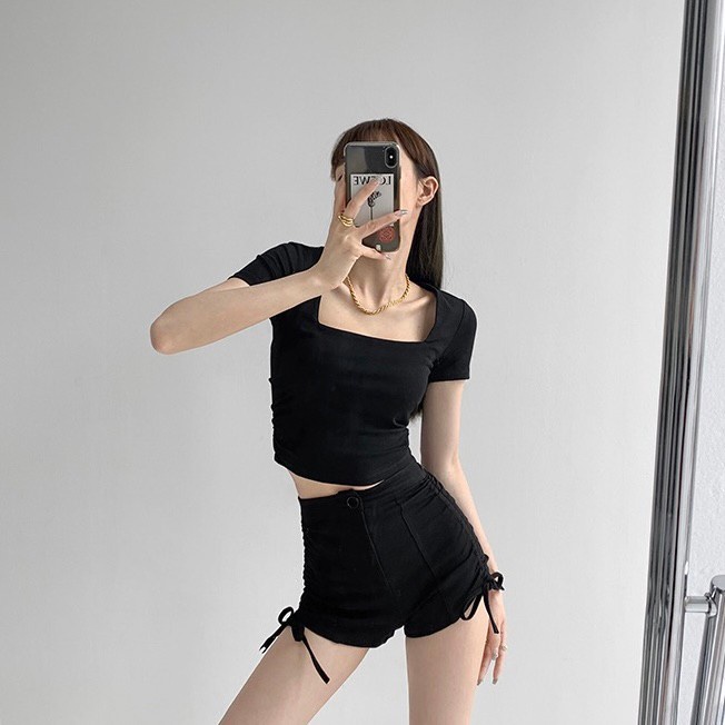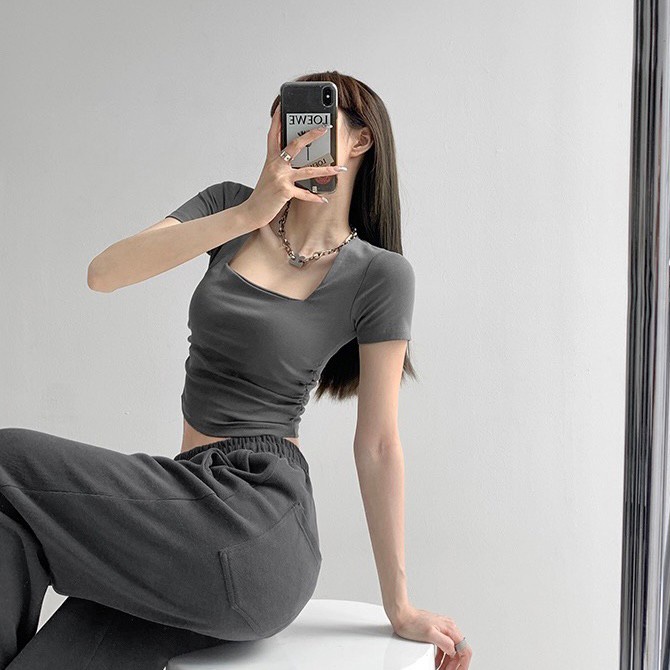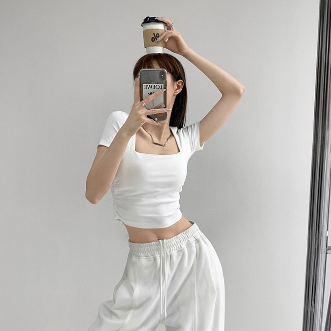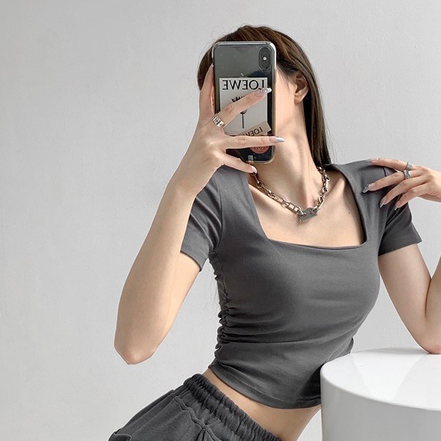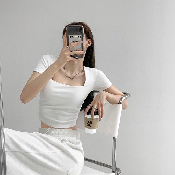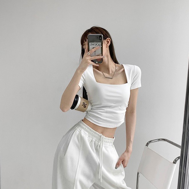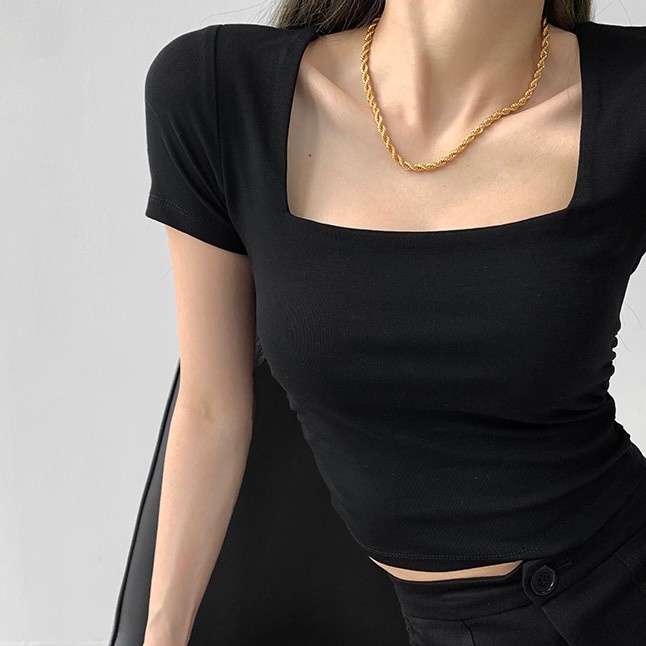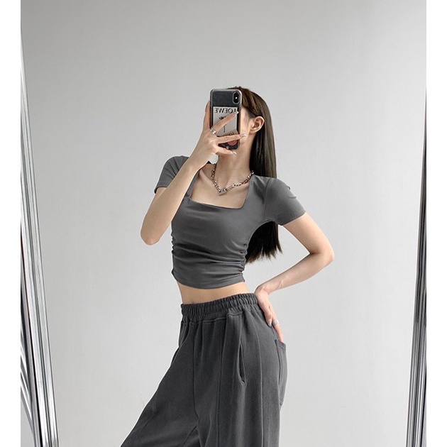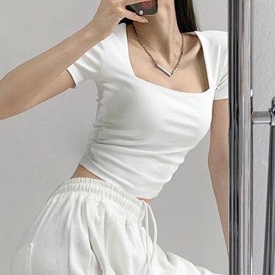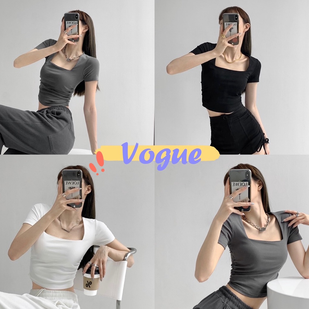 Vogue🌟พร้อมส่ง🌟 เสื้อยืดครอปแขนสั้น คอเหลี่ยม ผ้านิ่มลื่นใส่สบายสุดๆ (DX-6746-H)