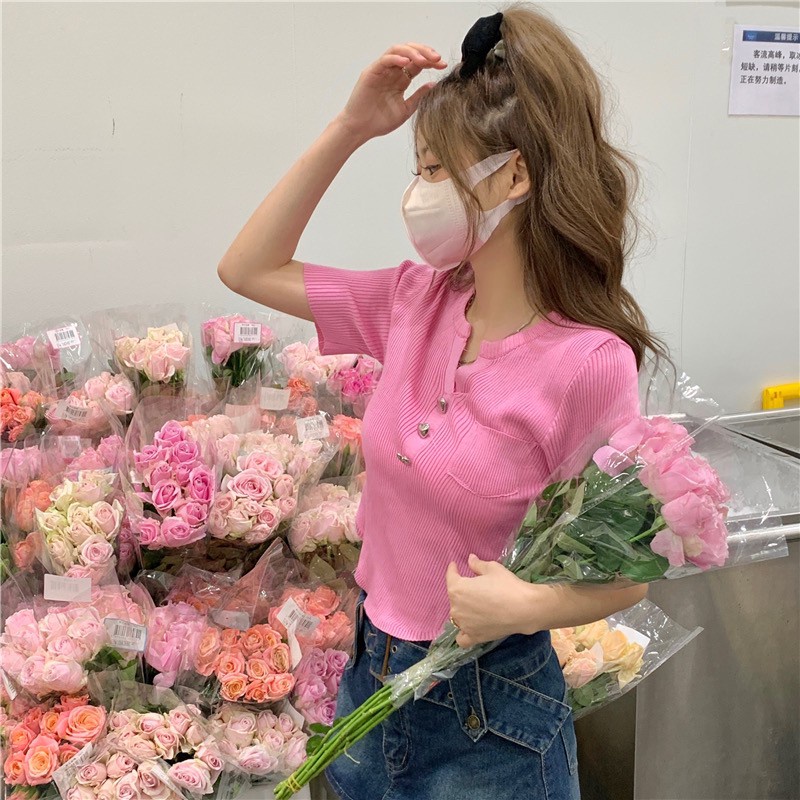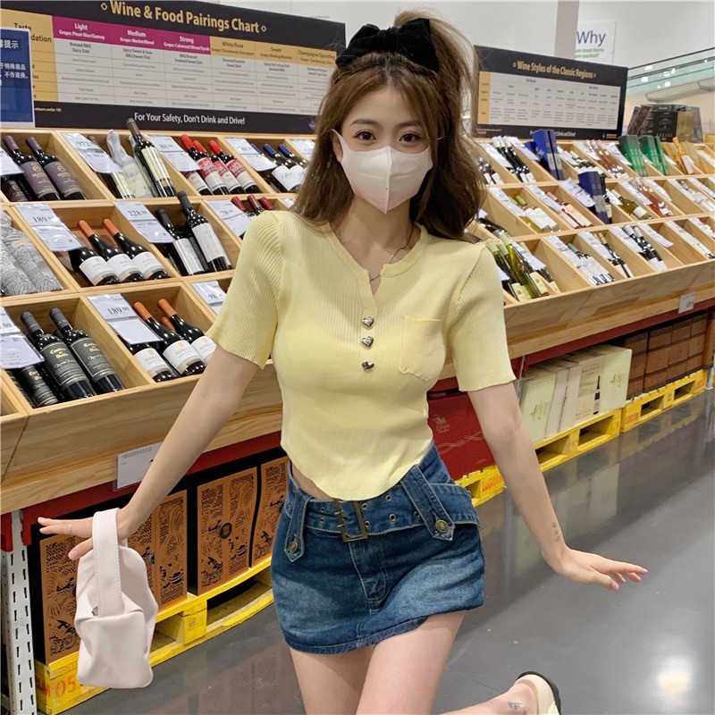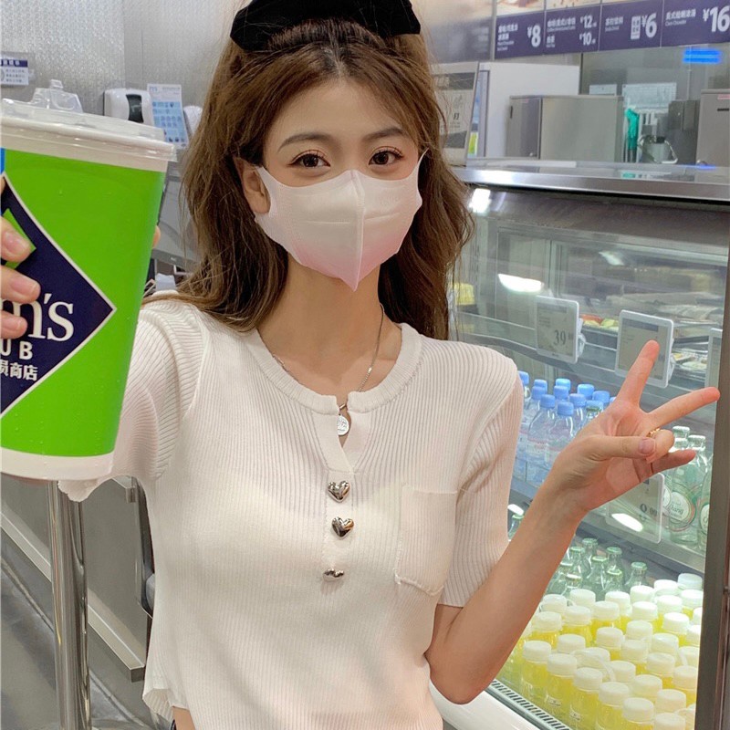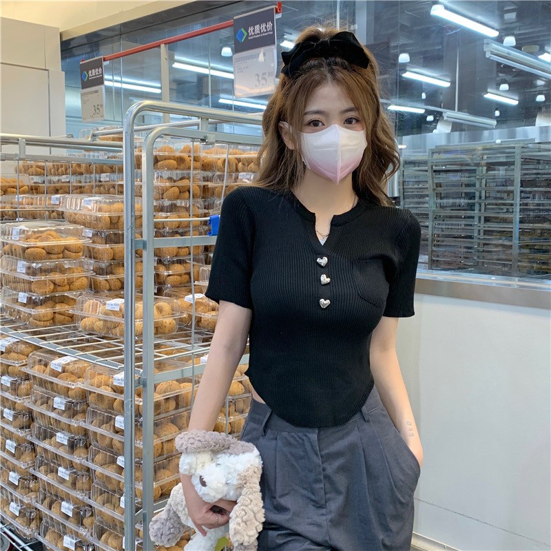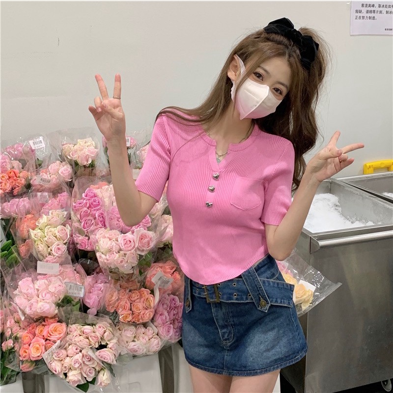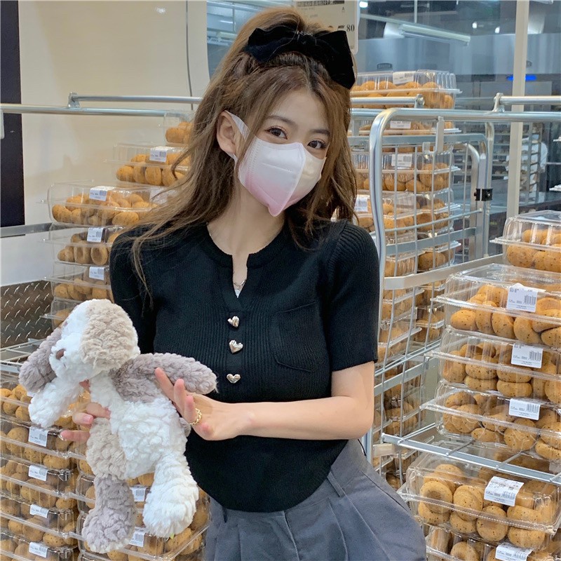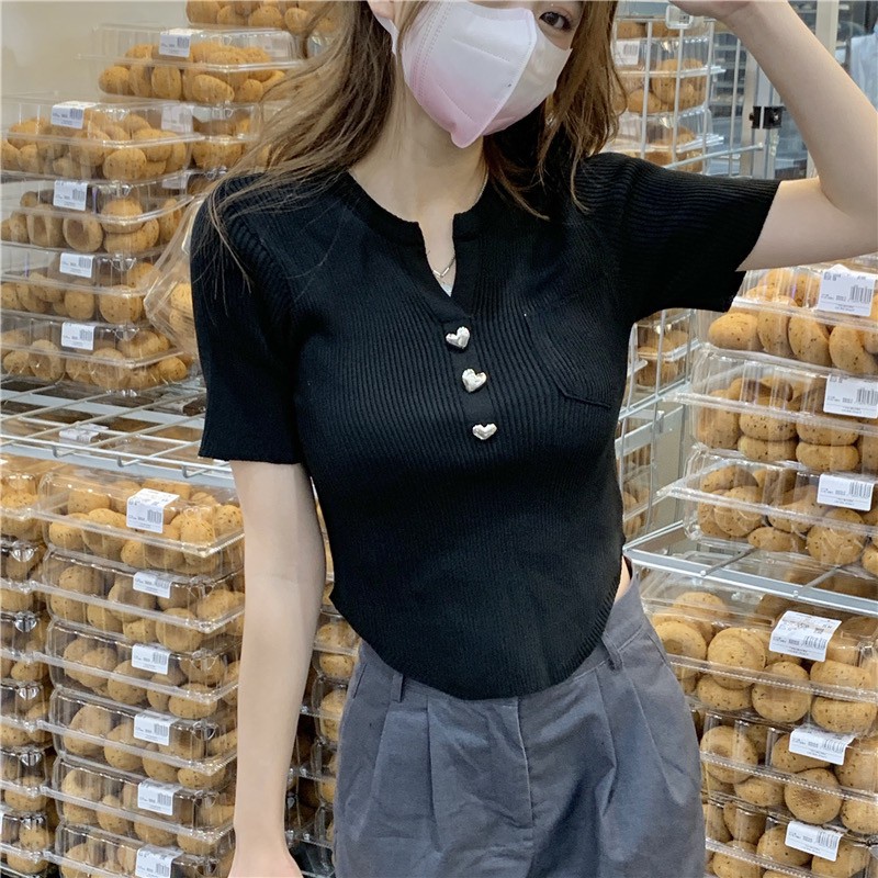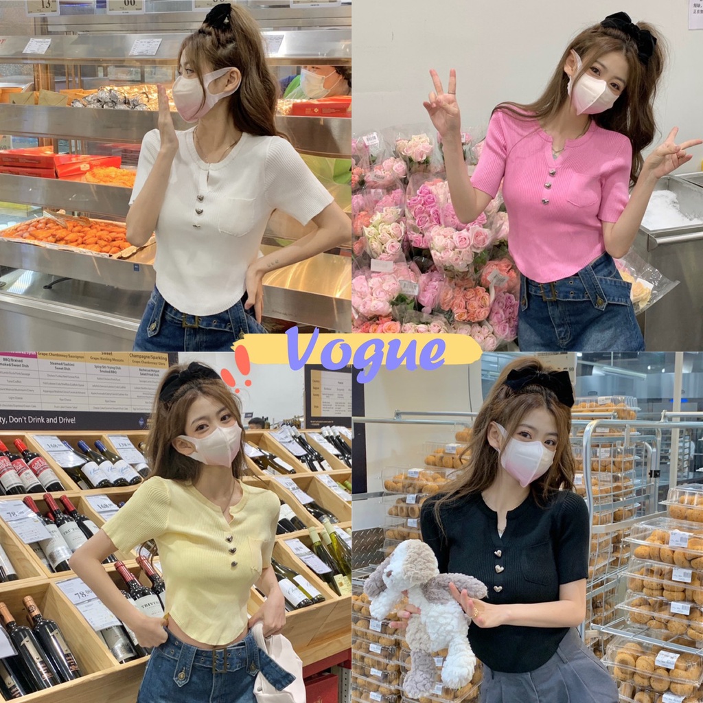 Vogue🌟พร้อมส่ง🌟 เสื้อไหมพรมแขนสั้น กระดุมหัวใจน่ารักคิ้วมาก (17008)