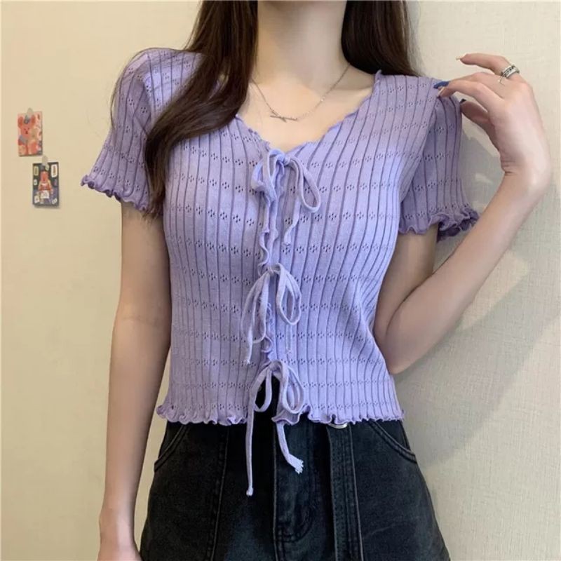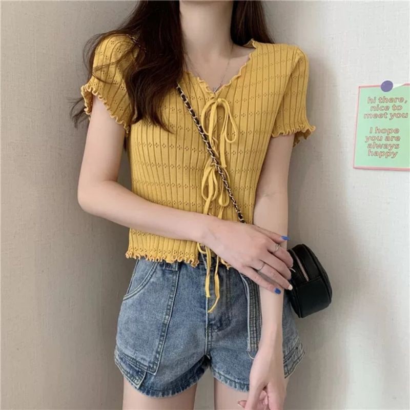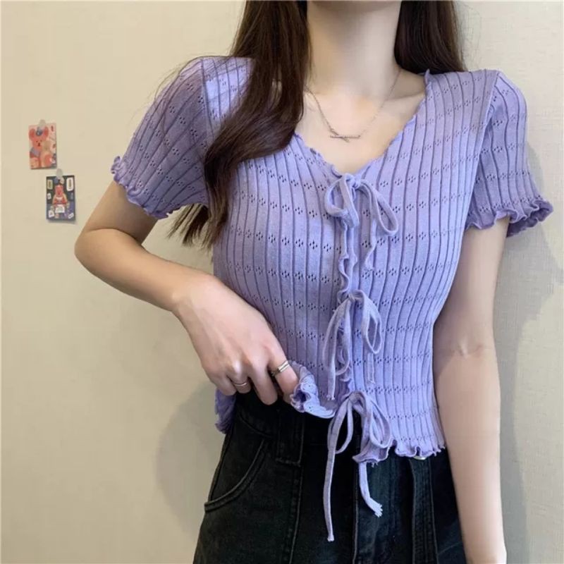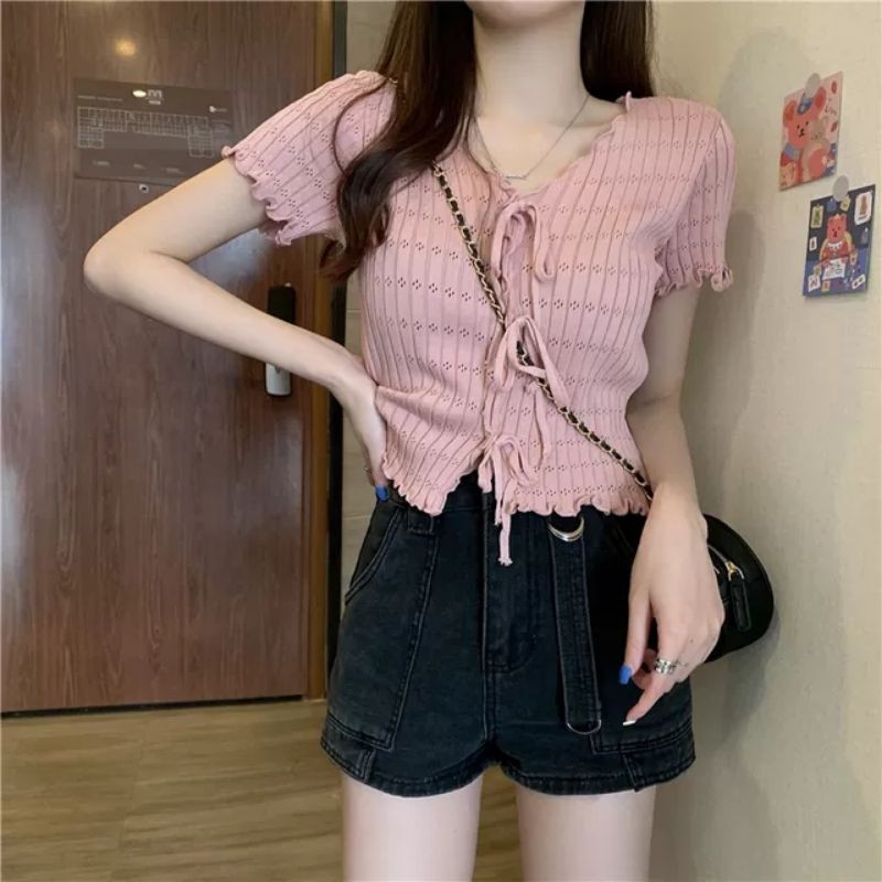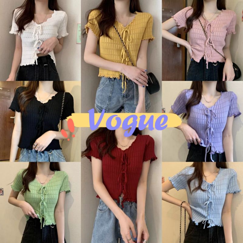 Vogue 🌟พร้อมส่ง🌟เสื้อไหมพรมแขนสั้น เชือก3ชั้นผูกด้านหน้า🥰ร้านโว๊ก(323)