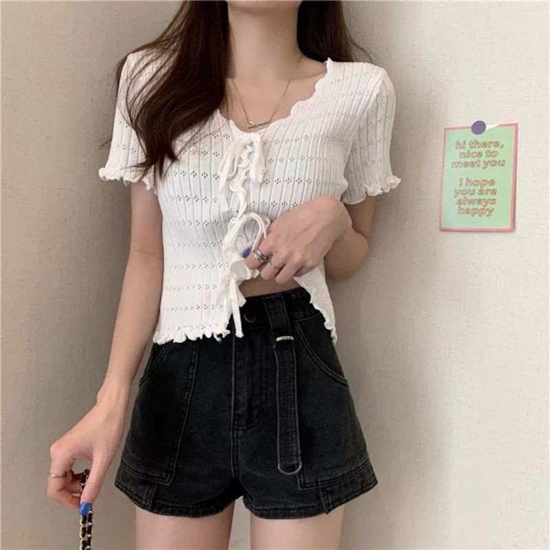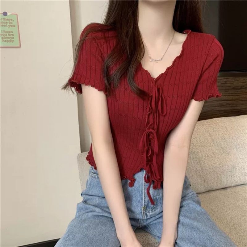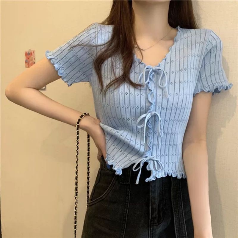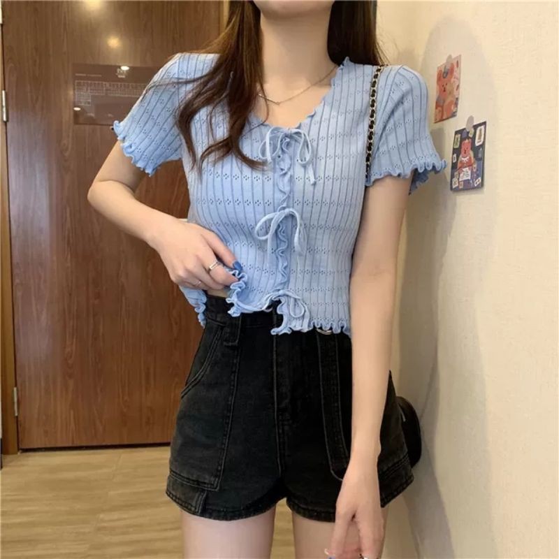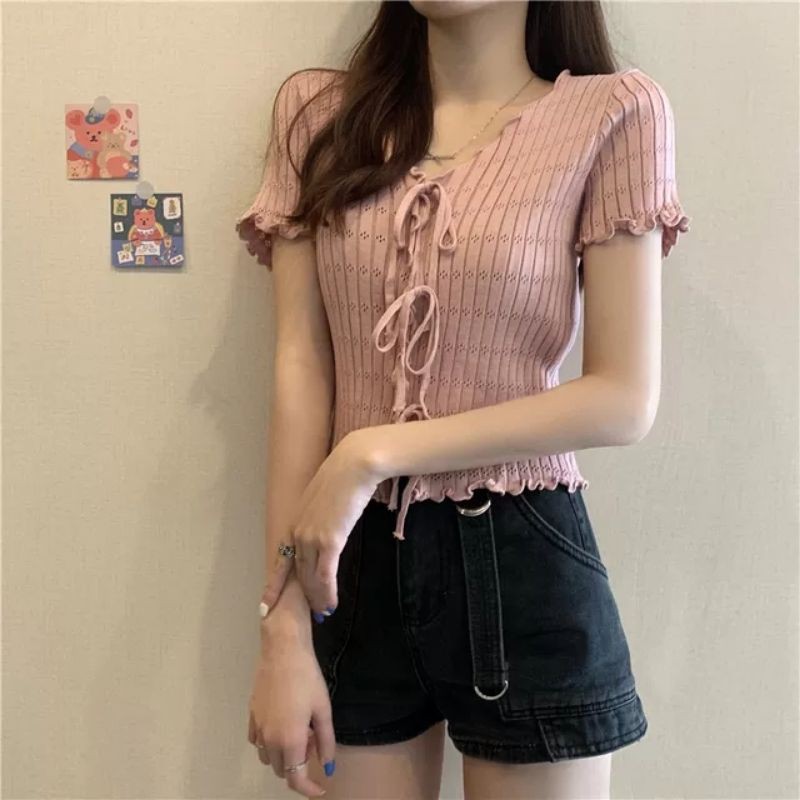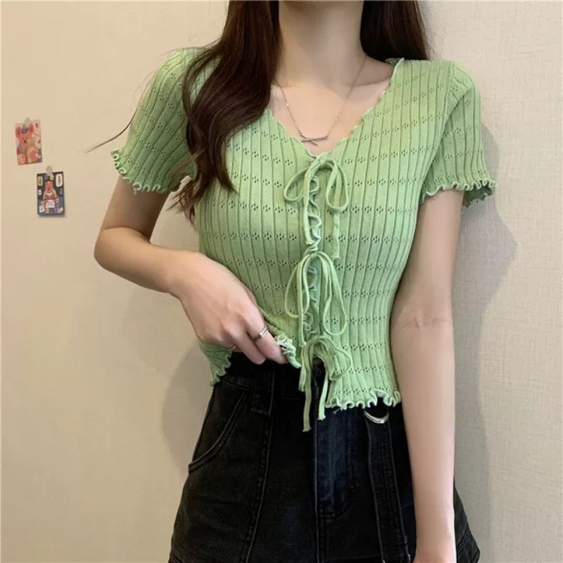 Vogue 🌟พร้อมส่ง🌟เสื้อไหมพรมแขนสั้น เชือก3ชั้นผูกด้านหน้า🥰ร้านโว๊ก(323)
