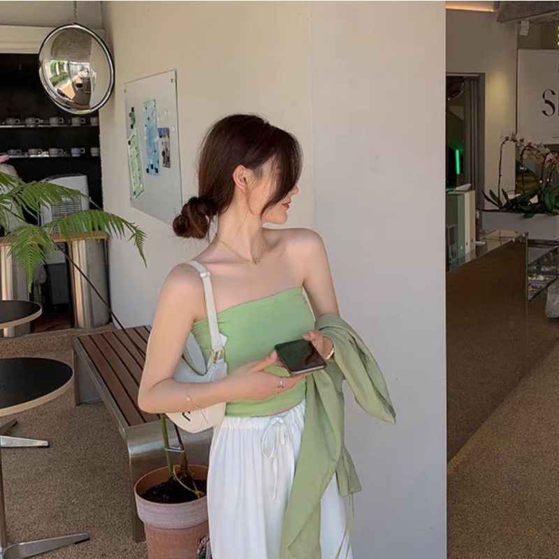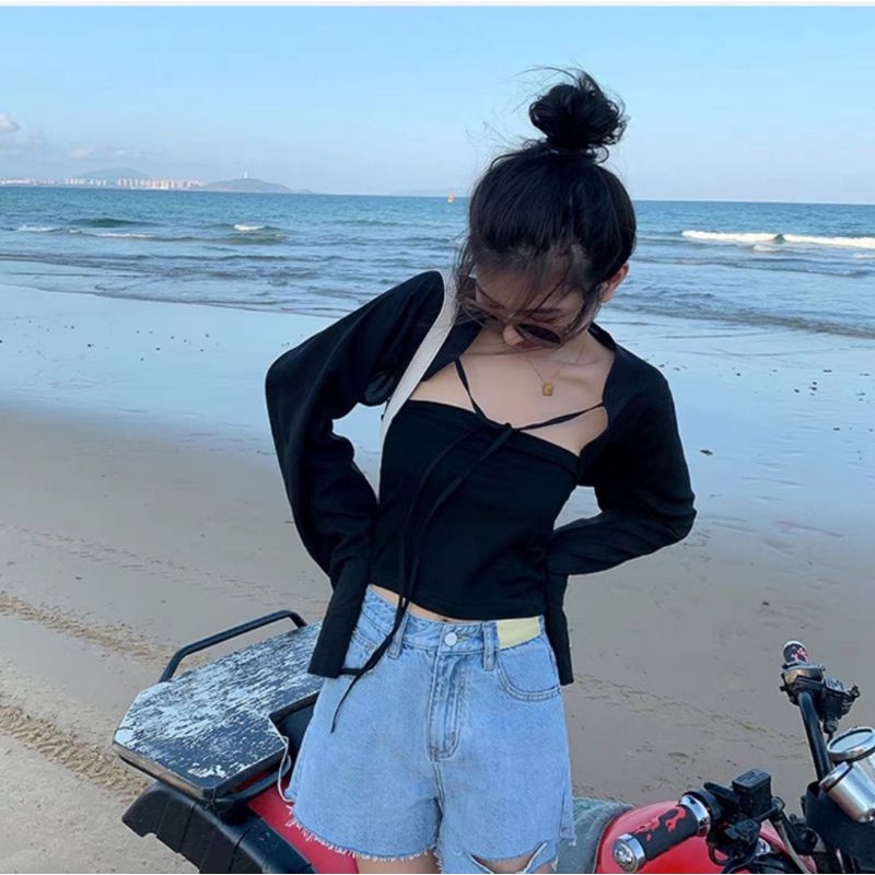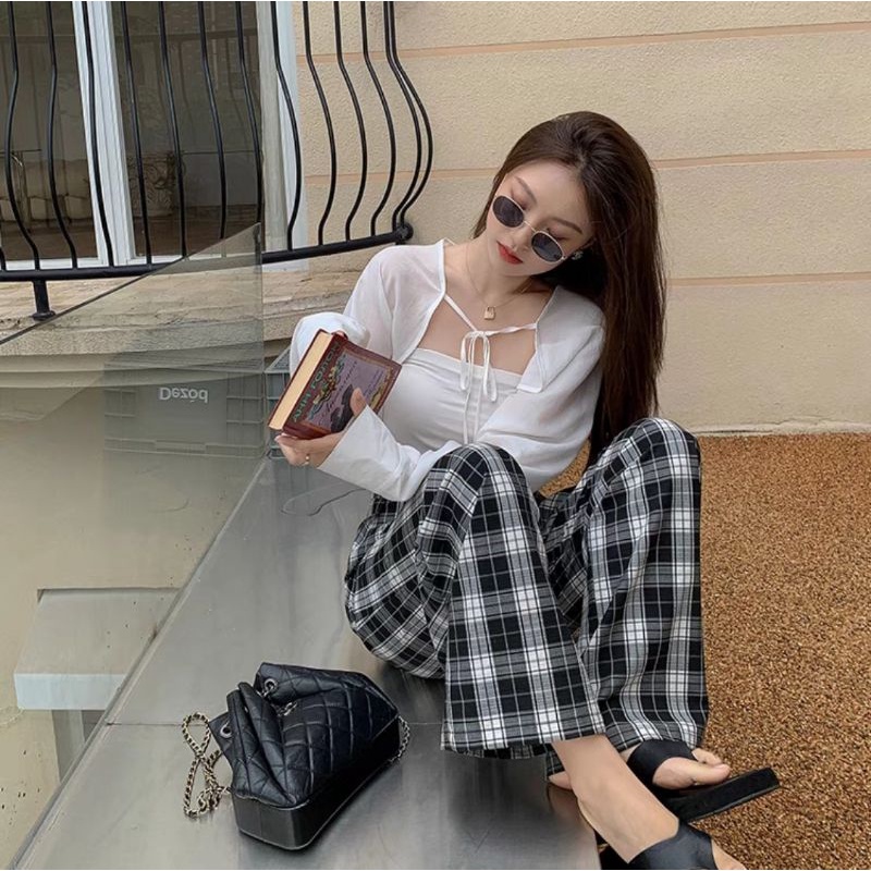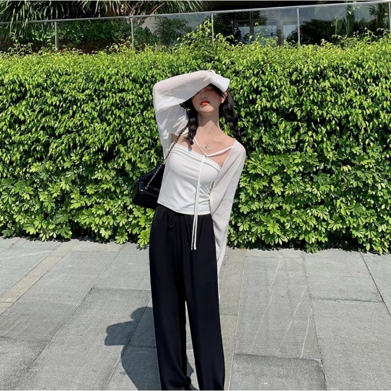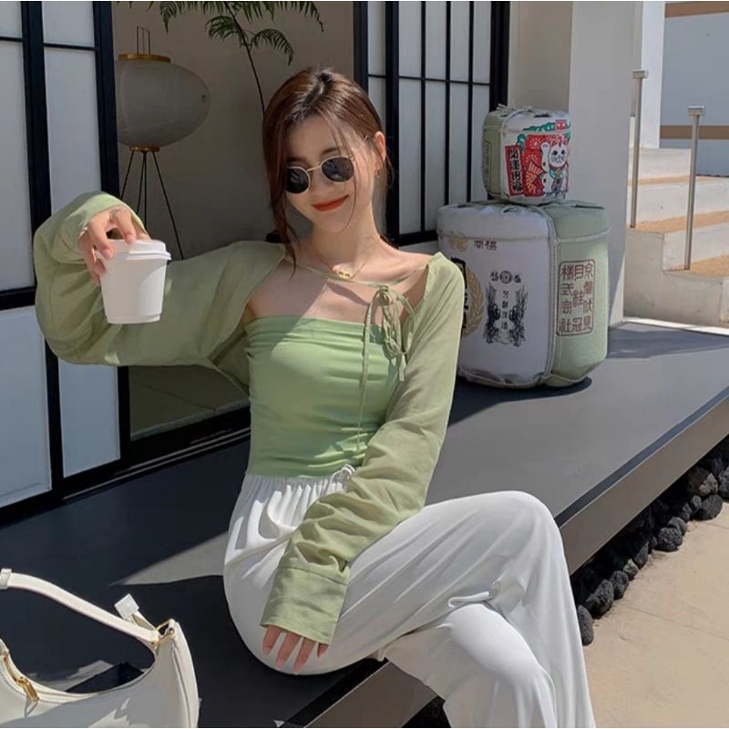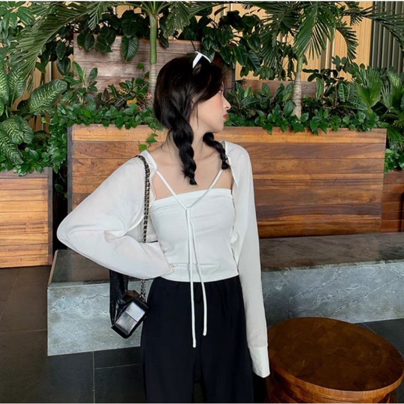 Vogue🌟พร้อมส่ง🌟เซ็ทเกาะอกไหมพรม+เสื้อคลุมผ้าชีฟอง สไตล์เกาหลี (58033)