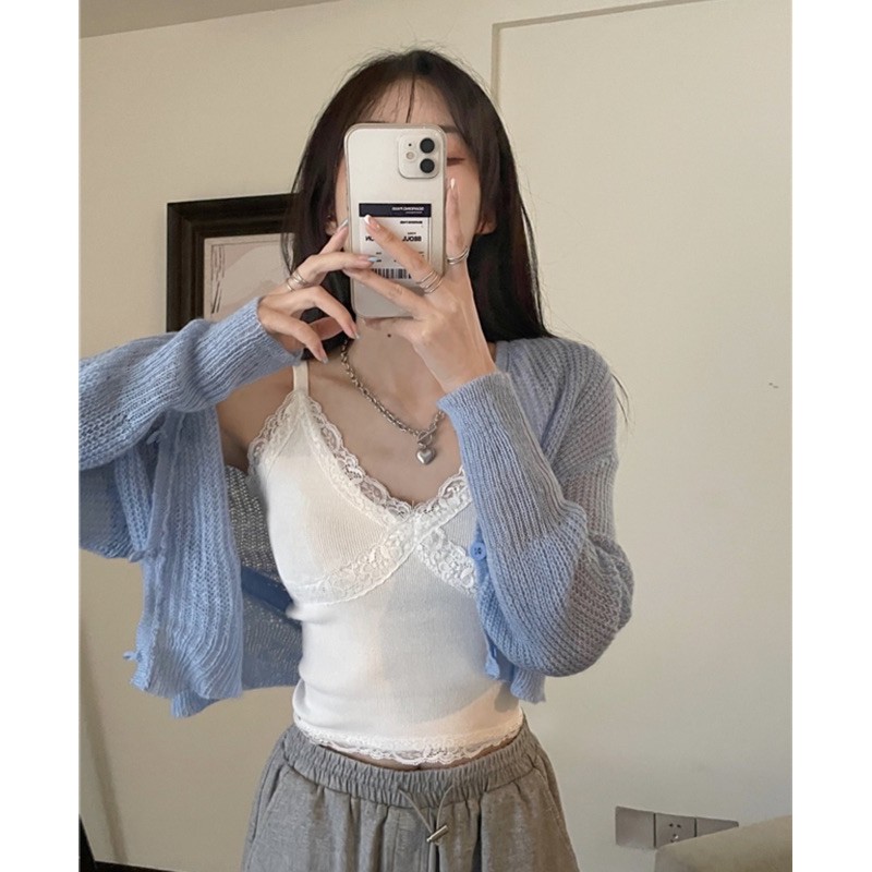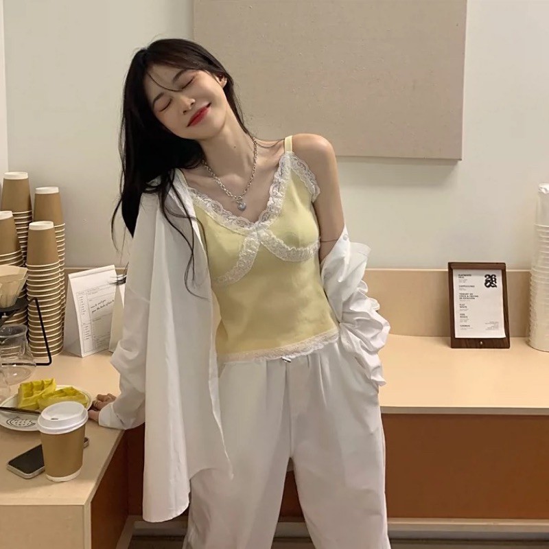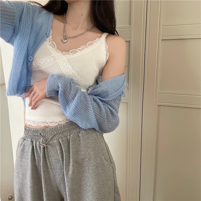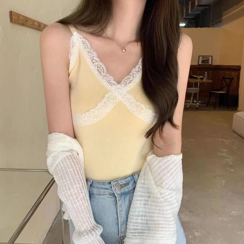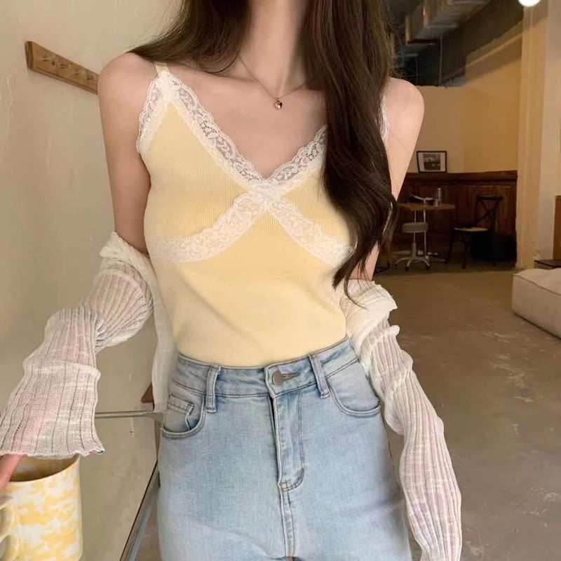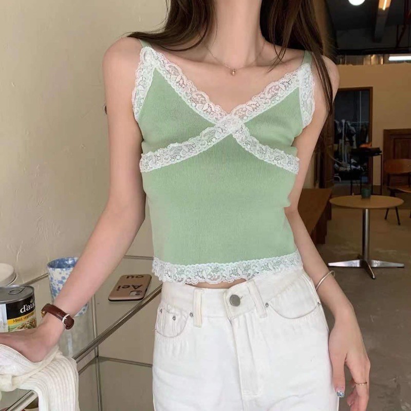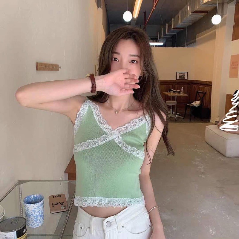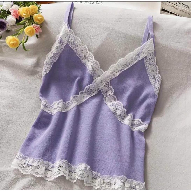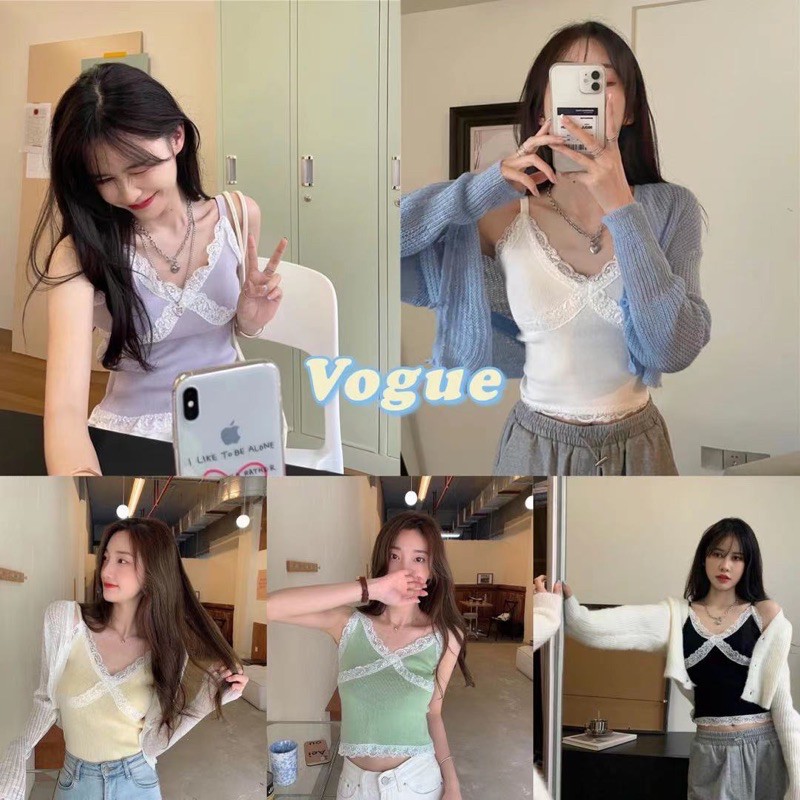 Vogue 🌟พร้อมส่ง🌟เสื้อสายเดี่ยวไหมพรม ลูกไม้ขอบน่ารัก🥰ร้านโว๊ก(1635) -N