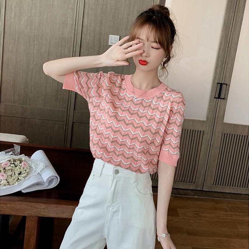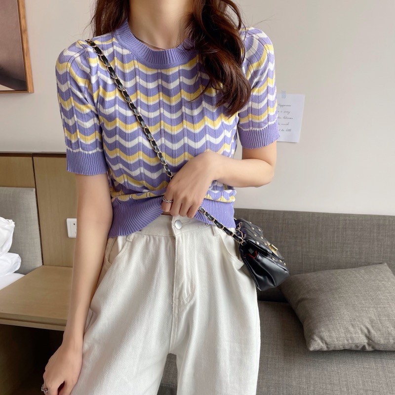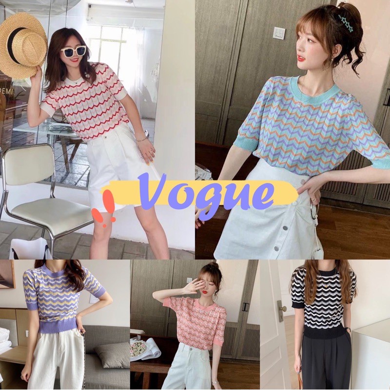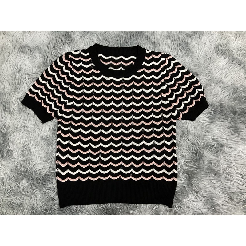 Vogue🌟พร้อมส่ง🌟เสื้อไหมพรมแขนสั้นคอกลม ลายทางหยักๆ สุดเก๋มากแม่ (6061) -N
