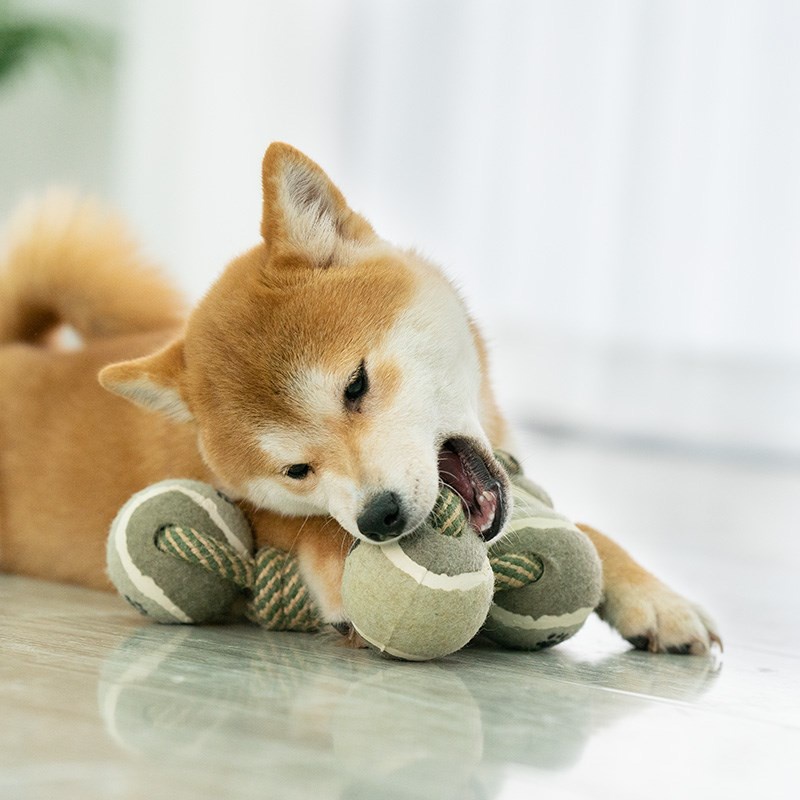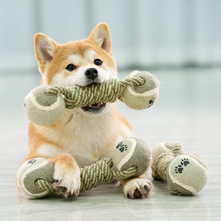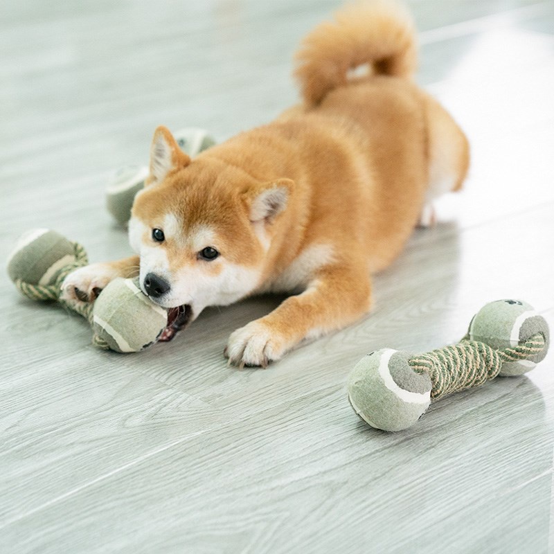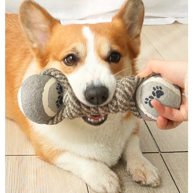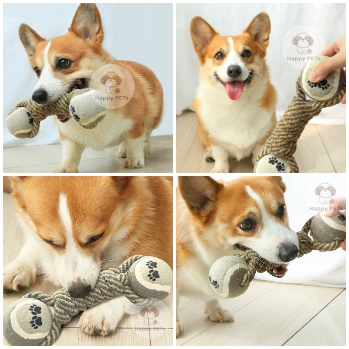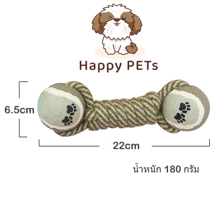 Happy PETs ของเล่นสุนัข ทรงดัมเบล เชือกผูกบอลเทนนิส 2ข้าง ของเล่นหมา ของเล่นสัตว์เลี้ยง