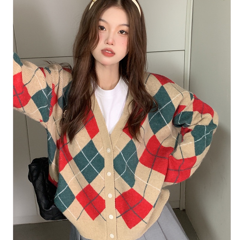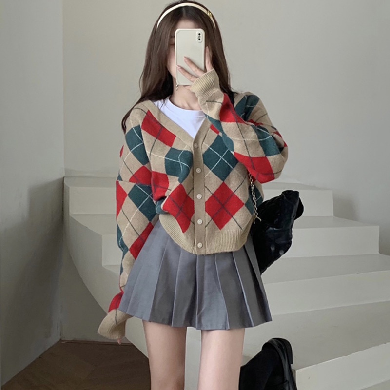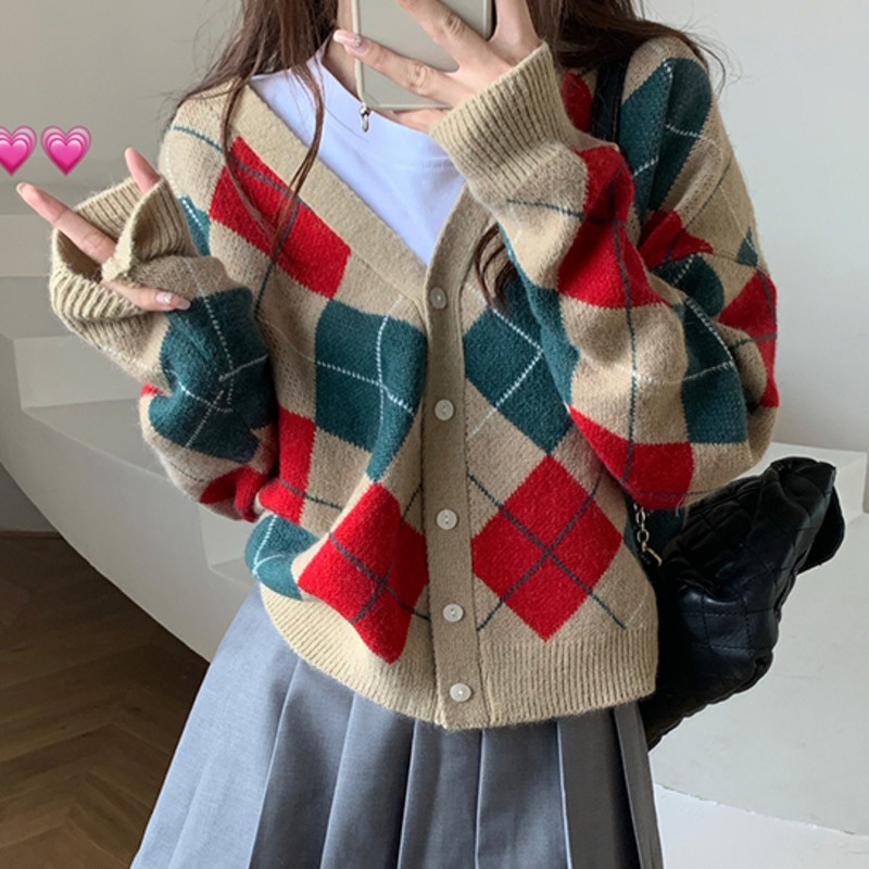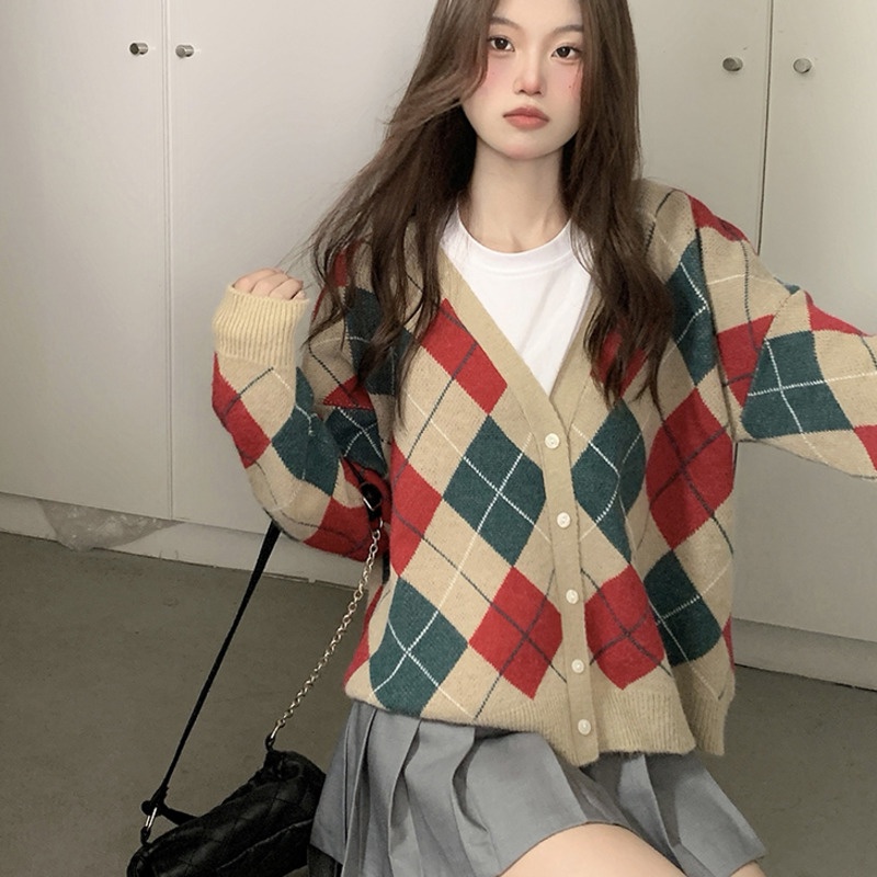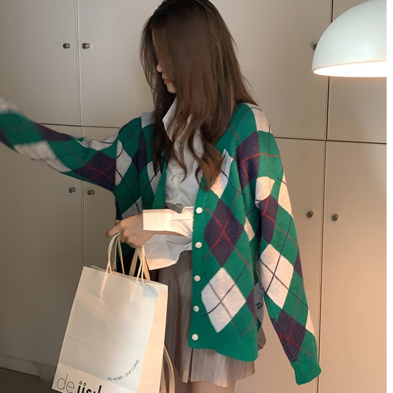 เสื้อคาร์ดิแกนแขนยาว ผ้าถัก ลายตาราง สไตล์เกาหลี สำหรับผู้หญิง