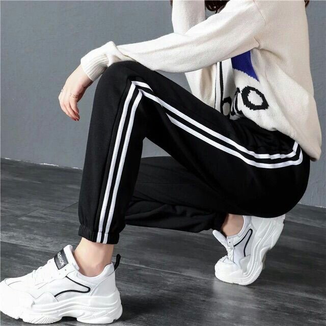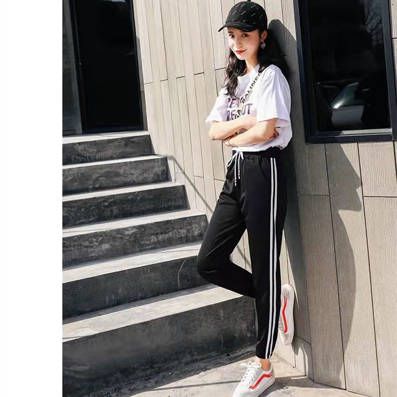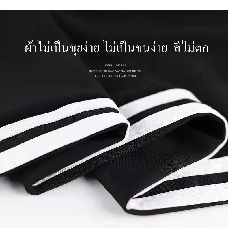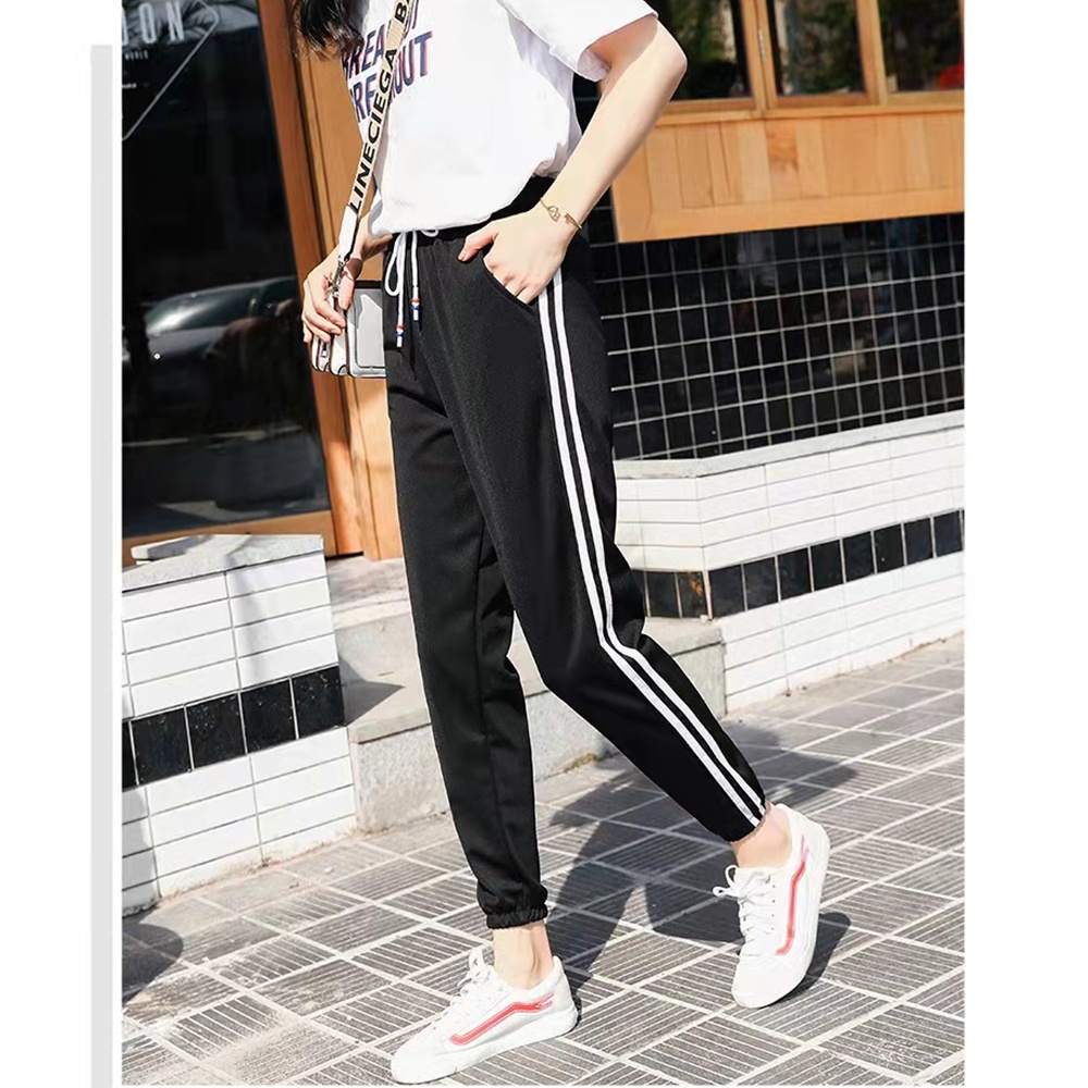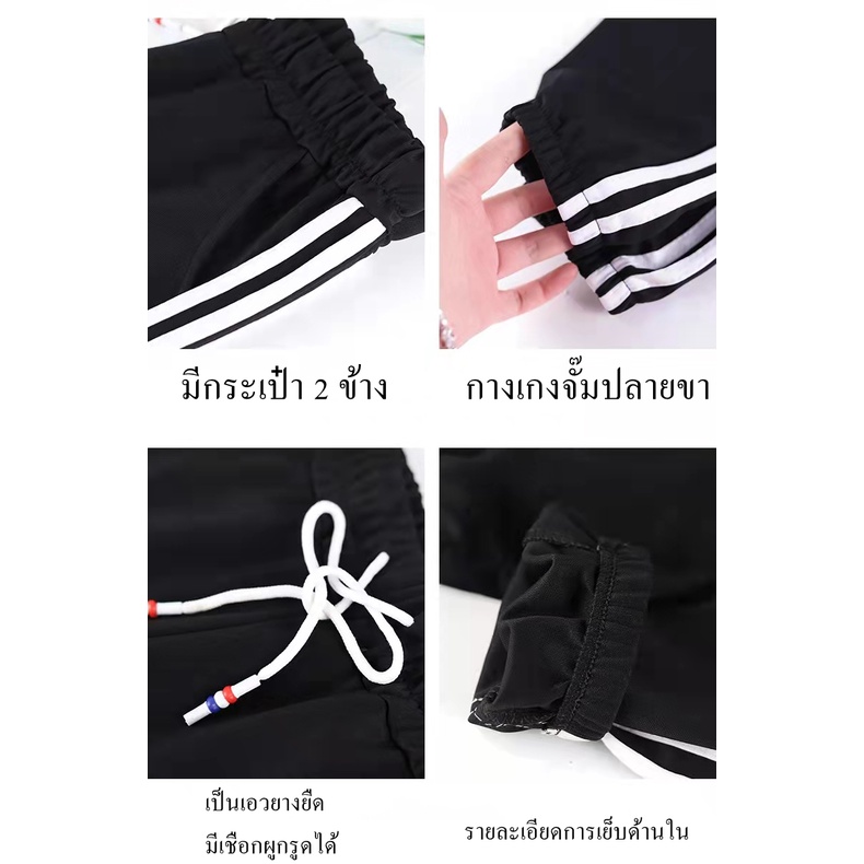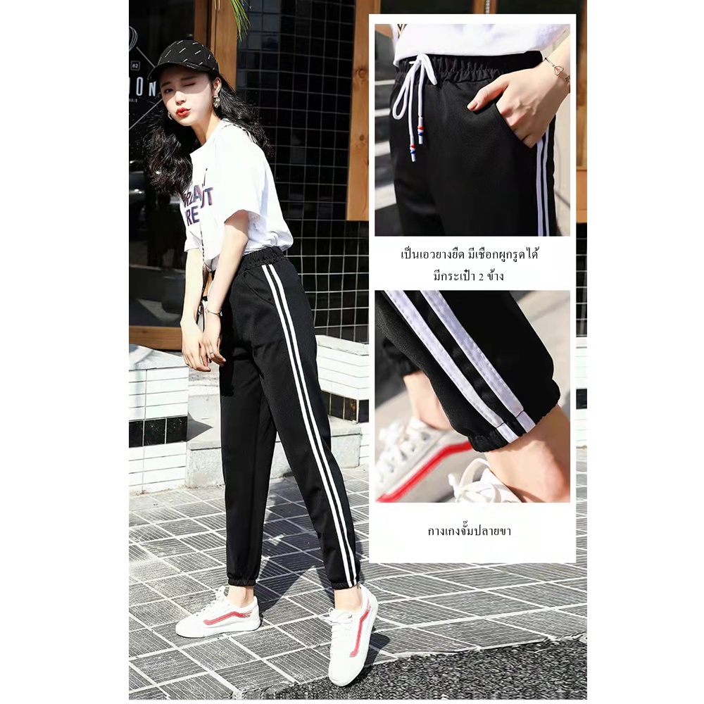 กางเกงขายาวทรงสปอร์ตสีพื้นแต่งด้วยแถบสีขาว2เส้น มีเชือกผูก มีกระเป๋า 2 ข้าง ผ้ายืดได้ตามตัว ทรงขาจั้มรุ่น9881#