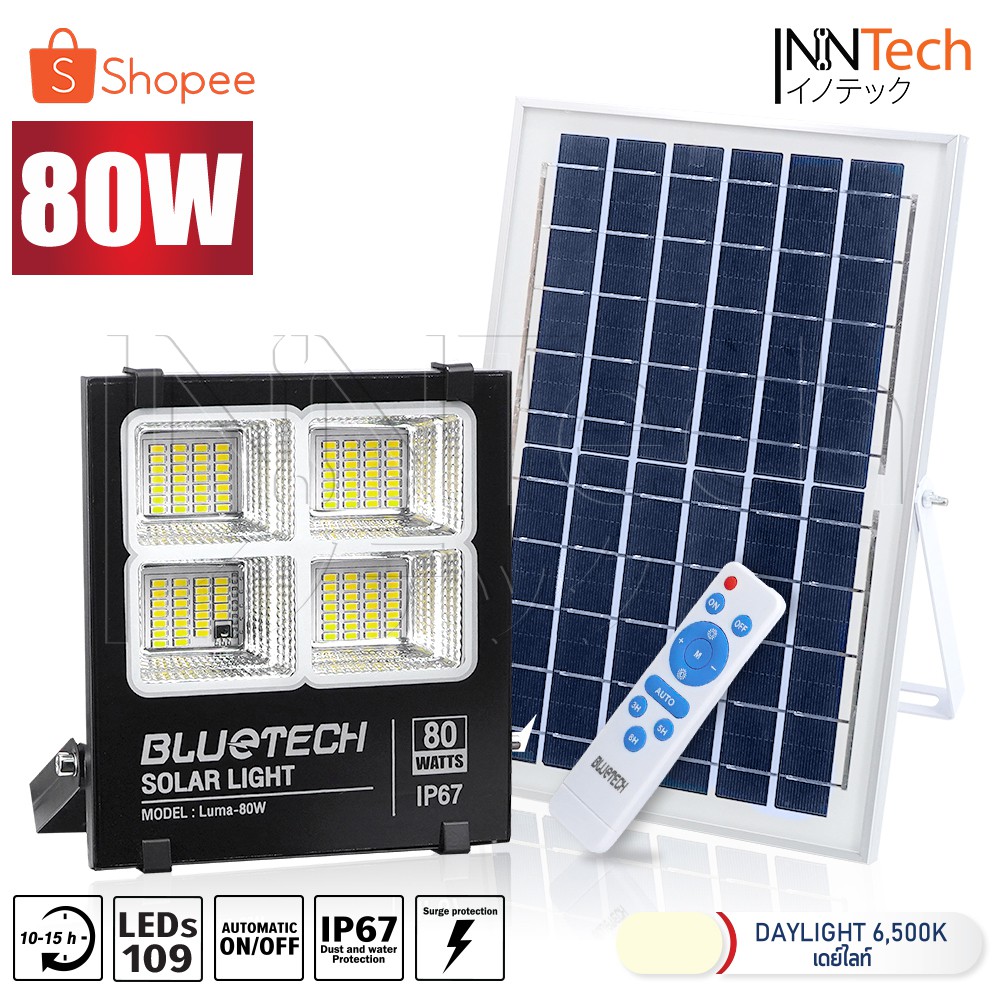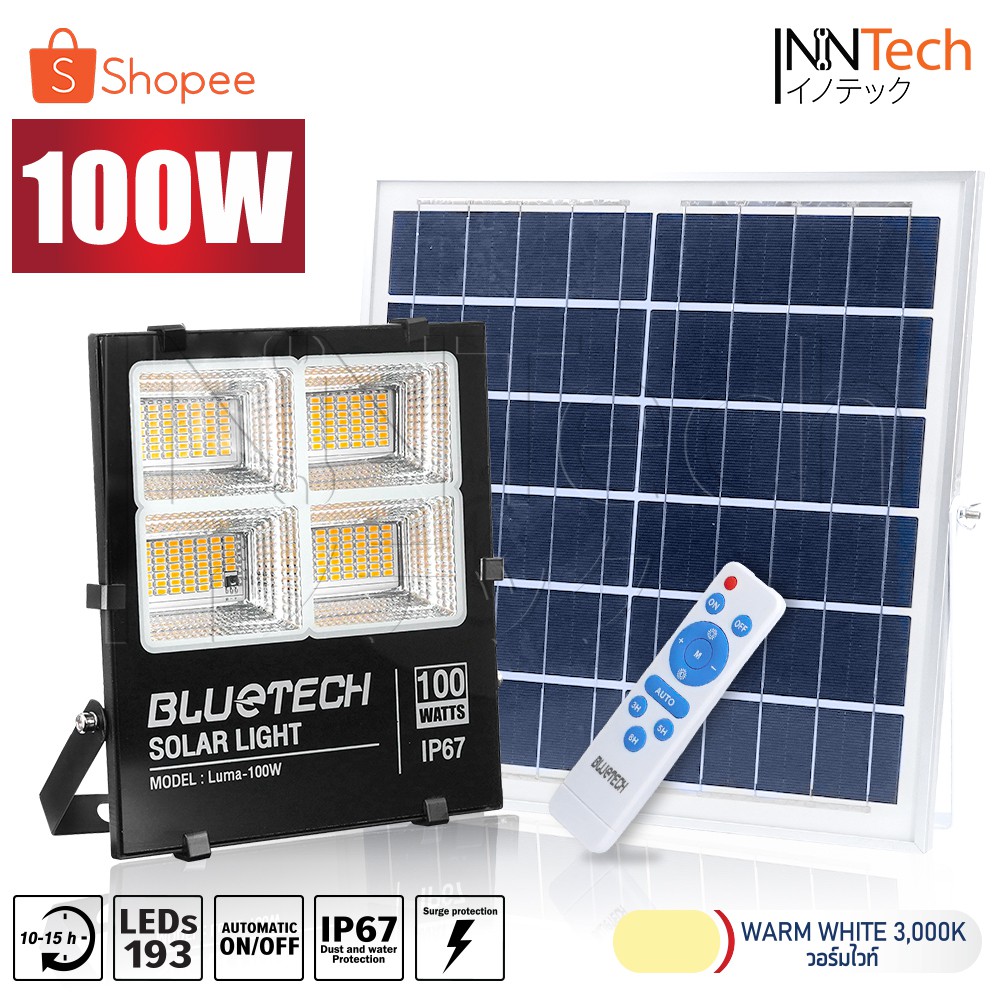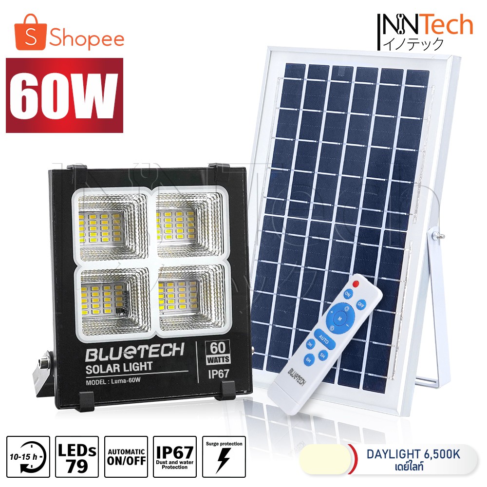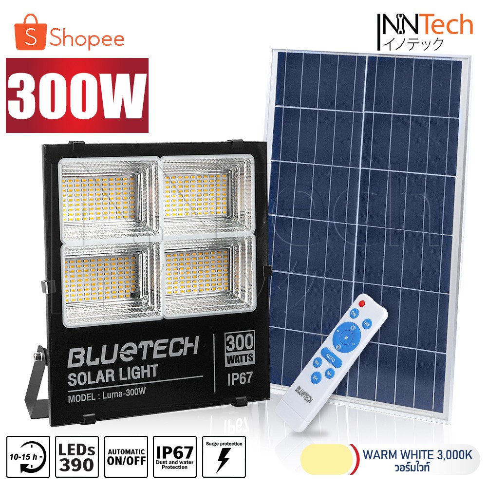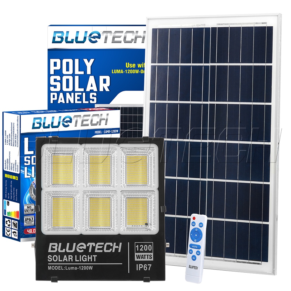 Bluetech ไฟโซล่าเซลล์ ไฟสปอร์ตไลท์ Solar Cell LED Floodlight, Spotlight รุ่นใหม่ 4ช่อง กันน้ำ IP67 วัตต์เต็ม ประกัน 1 ปี