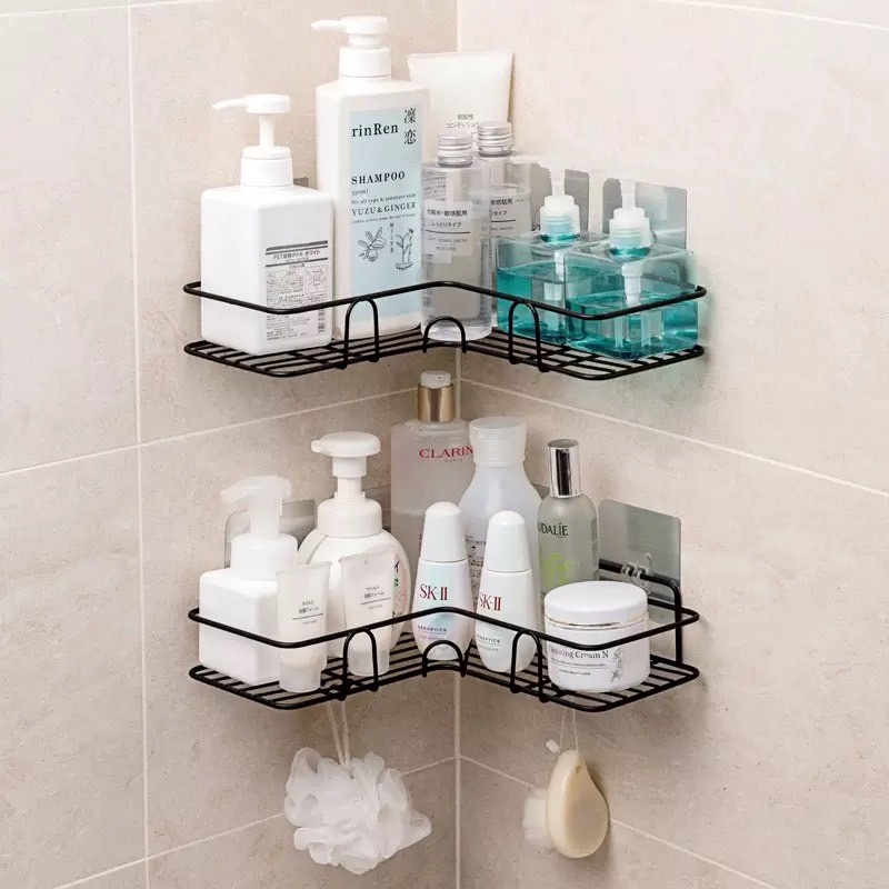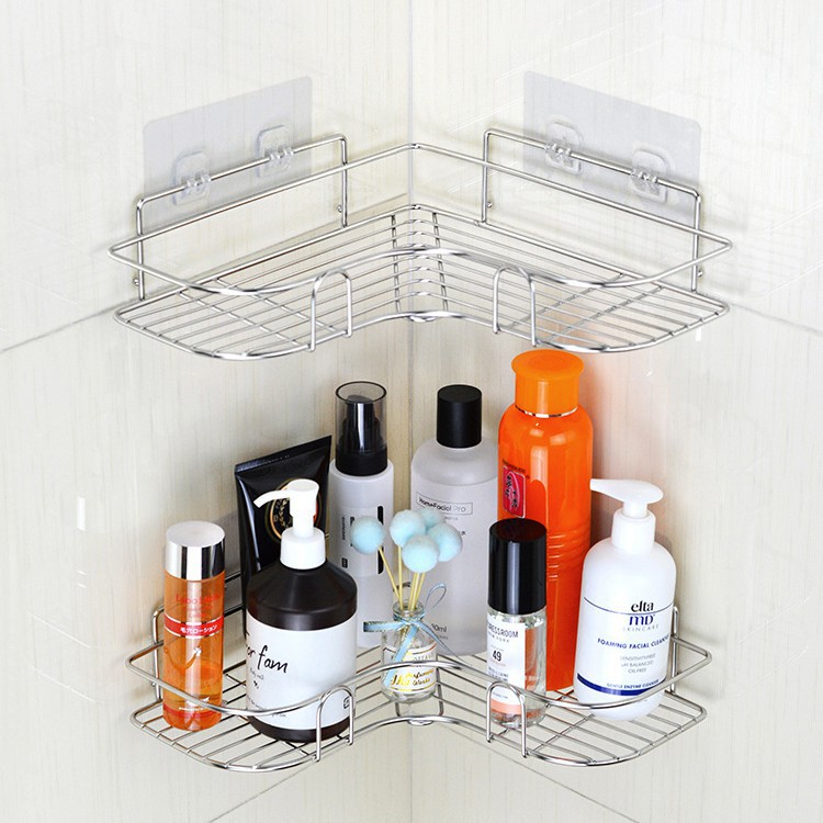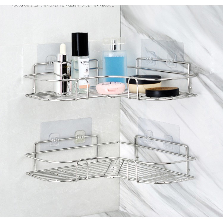 [ ไม่ต้องเจาะกำแพง ] ชั้นวางของ ไม่ต้องเจาะผนัง สแตนเลส ชั้นวางของในห้องน้ำ ที่วางแชมพู แบบเข้ามุม ที่แขวน