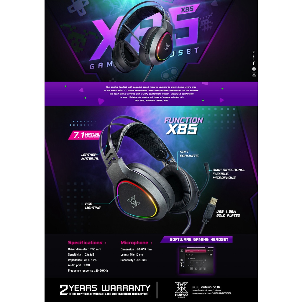 หูฟังเกมมิ่ง NUBWO X85 เสียง 7.1 VIRTUAL SURROUND SOUND หูฟังคอม หูฟัง RGB ประกันศูนย์ 2 ปี