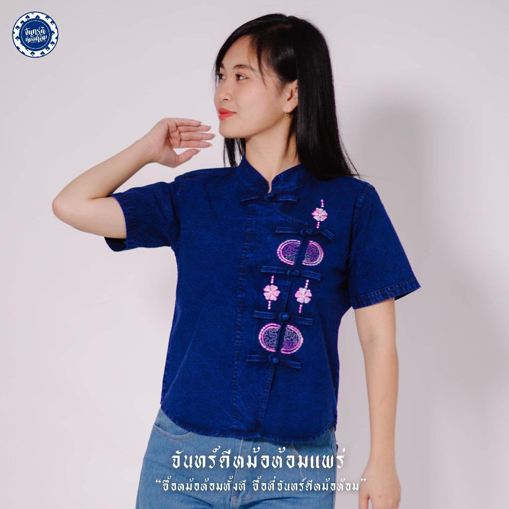(จันทร์ดีหม้อห้อม) เสื้อหม้อห้อมคอจีนกระดุมป้ายเข้ารูปปักลาย(2โทนสี)