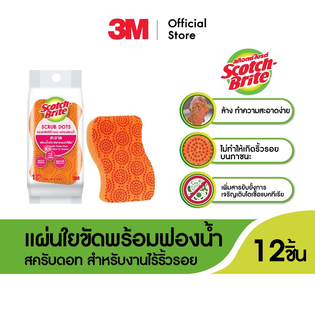 SCOTCH-BRITE® Scrub Dots Non Scratch 12 PK/CV แผ่นใยขัดพร้อมฟองน ้ำสครับดอท รุ่นทั่วไป pack 12