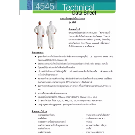3M ชุด PPE ชุดป้องกันฝุ่น เชื้อโรคและสารเคมี 3M Protective Coverall 4545 (Size M)