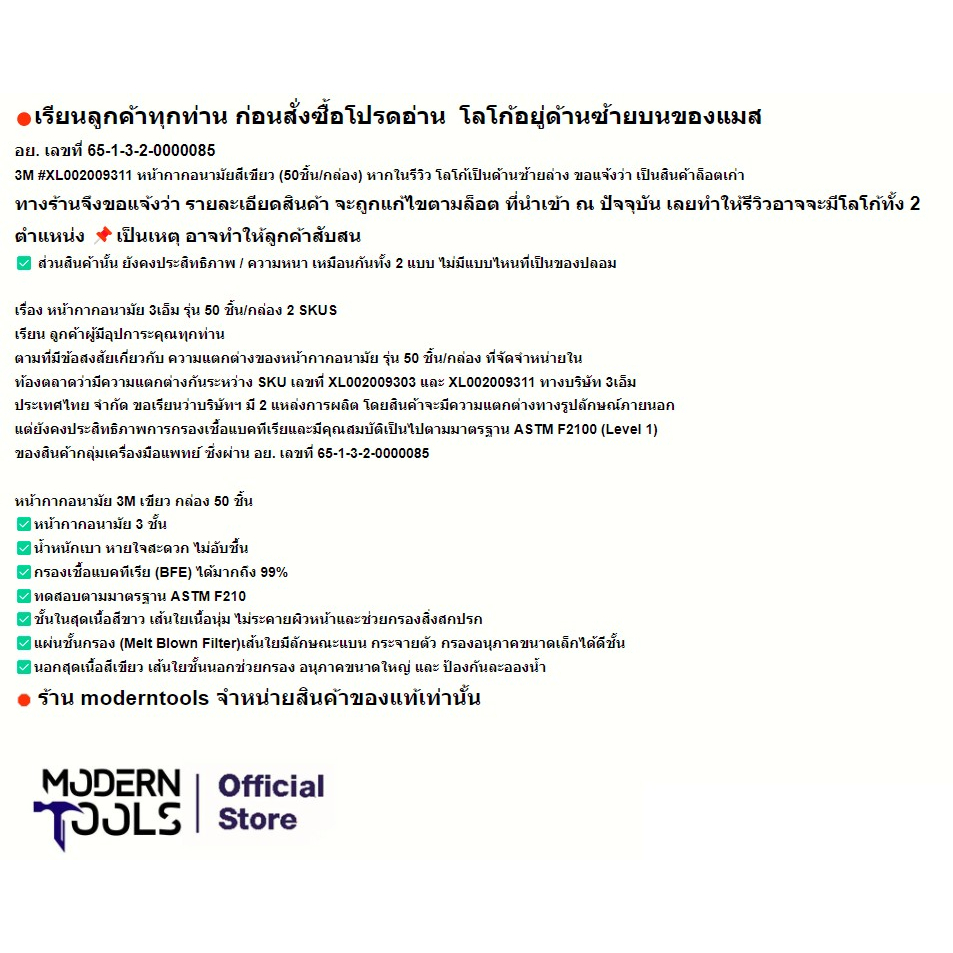 3M หน้ากากอนามัยทางการแพทย์ สีเขียว ขนาด 9.5 x 17.5 ซม. โลโก้ซ้ายบน Medical Mask (50ชิ้น/กล่อง) #XL002009311|MODERNTOOLS