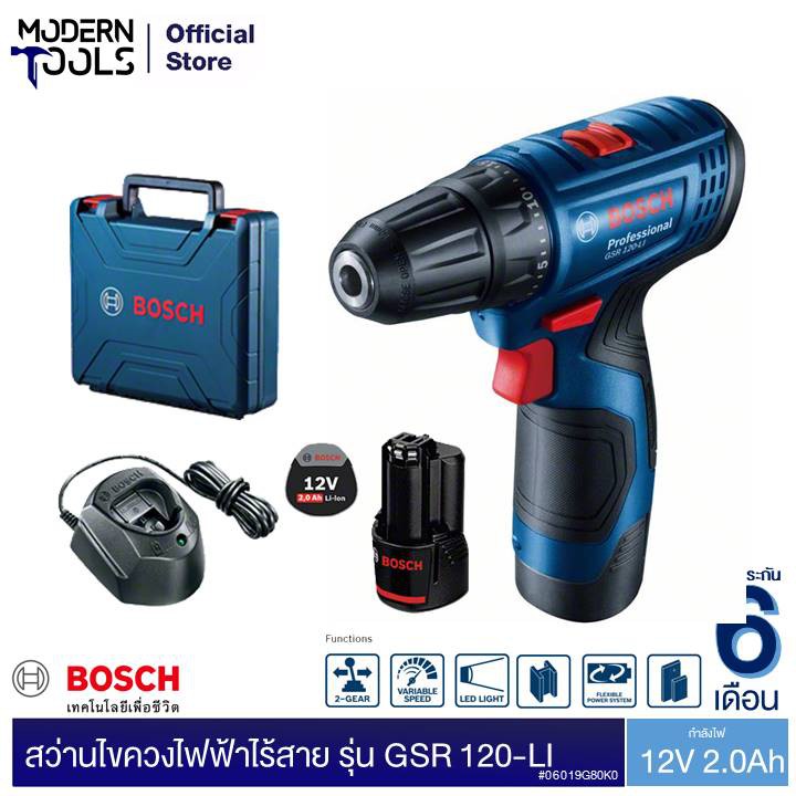 BOSCH GSR120-LI สว่านไขควงไฟฟ้าไร้สาย 12V 2x1.5Ah พร้อมแบต 2 ก้อน#06019G80K0 | MODERNTOOLS OFFICIAL