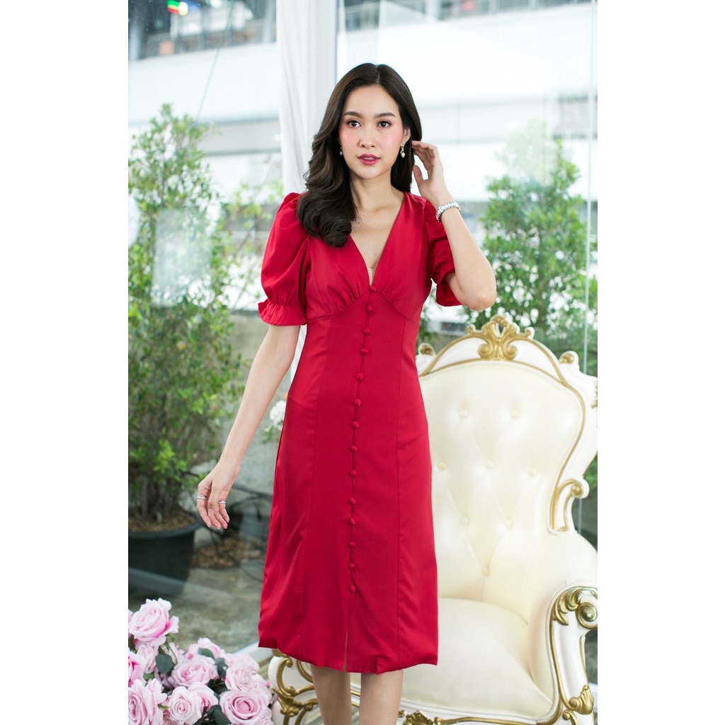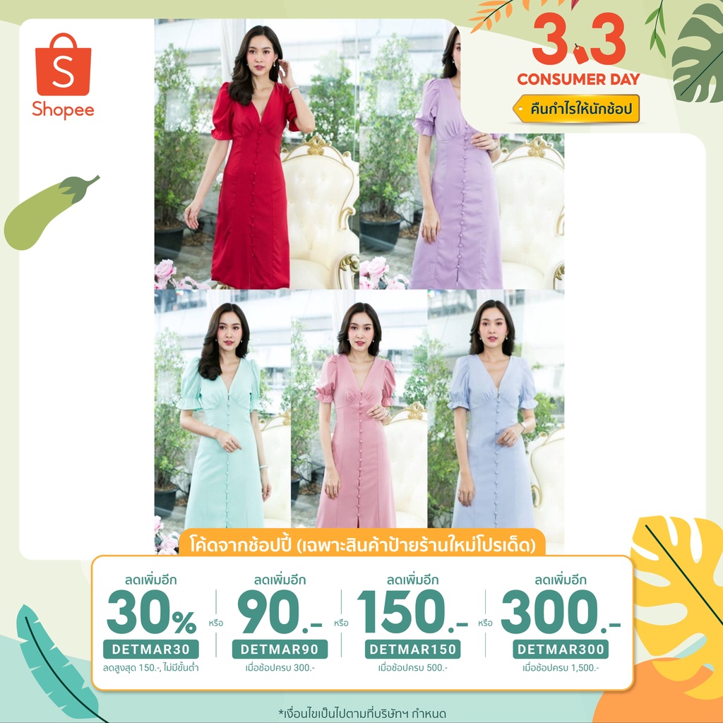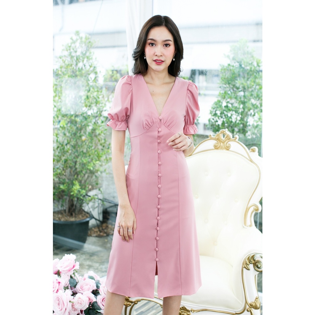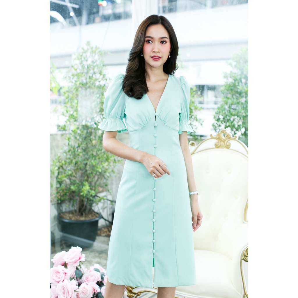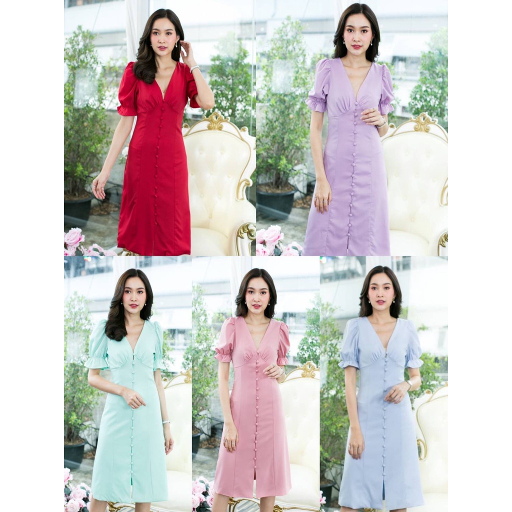 (โค้ด DETMAR30 ลดเพิ่ม 30%) เดรสยาวแขนตุ๊กตา คอวี สีพาทเทล