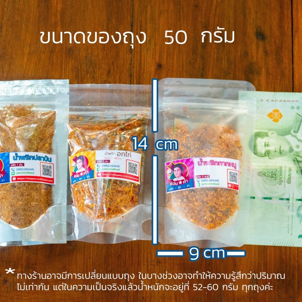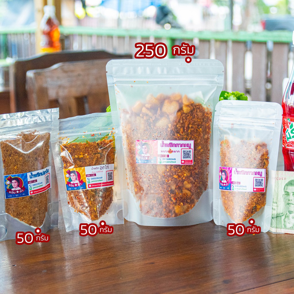 (ราคาส่ง 20 บ) น้ำพริกกากหมู อกไก่ ปลาย่าง แมลงดา ไก่สมุนไพร พริกคั่วน้ำมัน 50กรัม