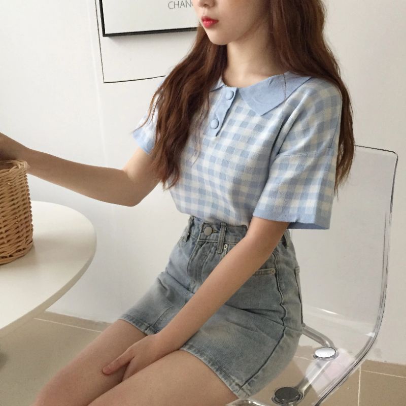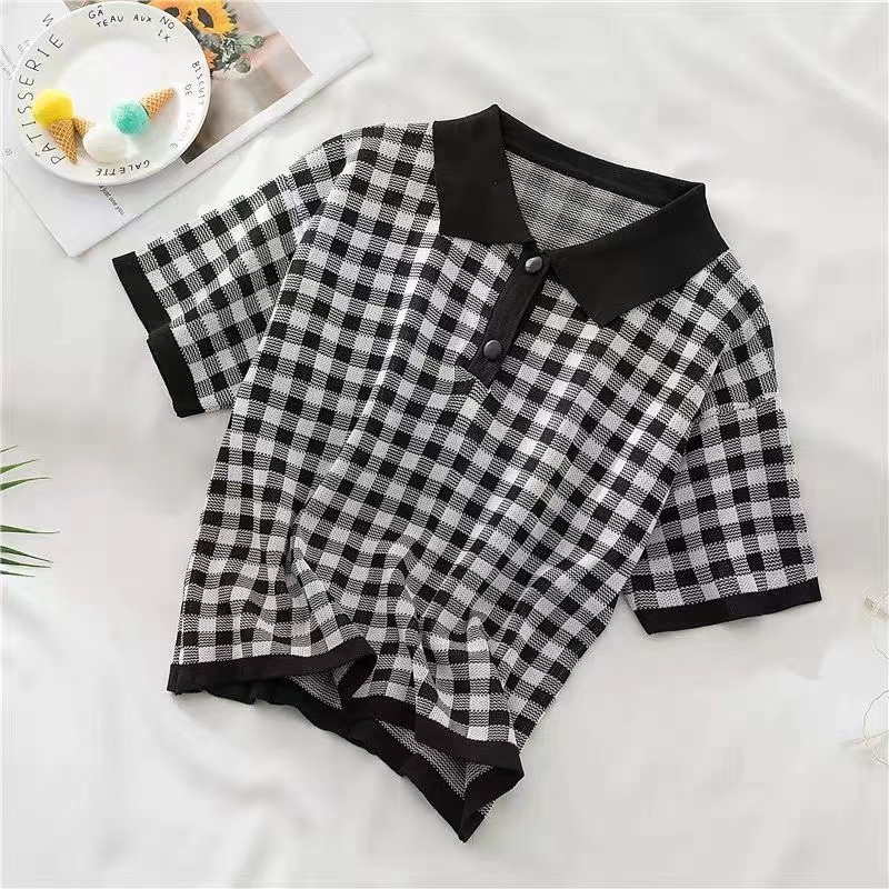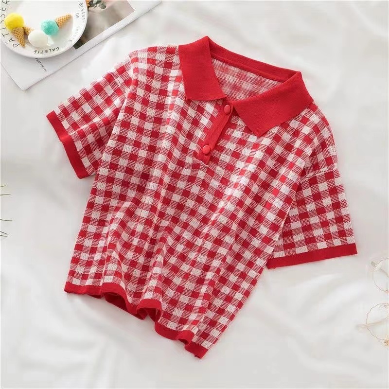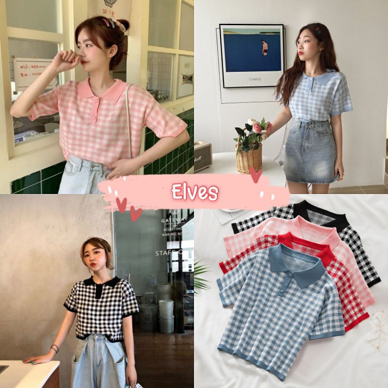 [โค้ดลดเพิ่ม SMEDDAY515] Elves✨พร้อมส่ง✨เสื้อไหมพรมแขนสั้นลายสก็อต🎉*3952-1*