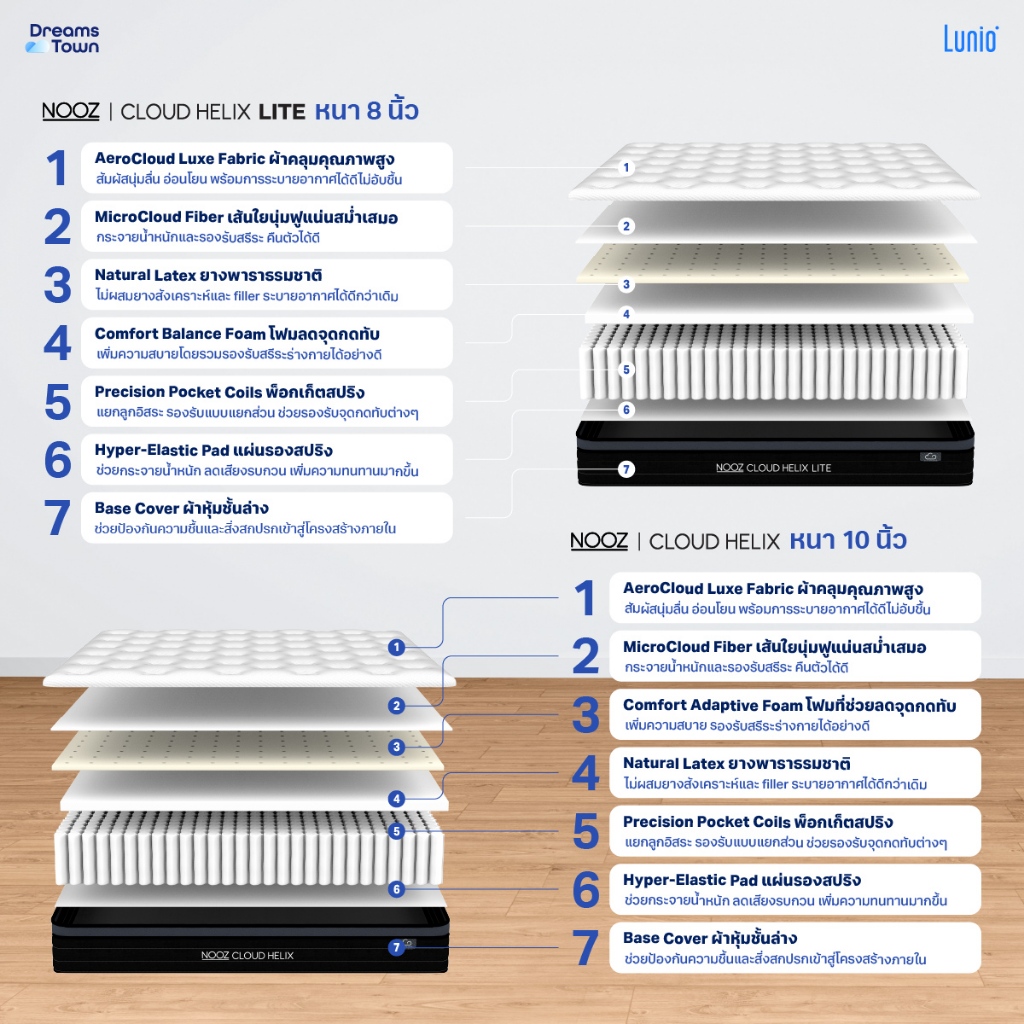 NOOZ ที่นอนยางพาราแท้ เสริมพ็อกเก็ตสปริง นุ่มเด้ง รองรับสรีระมากยิ่งขึ้น สัมผัสเย็น ไม่ยวบ รุ่น Cloud Helix