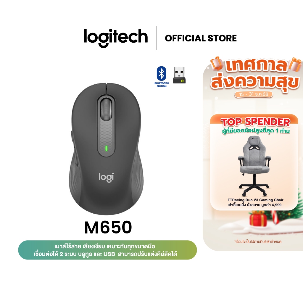 Logitech SIGNATURE M650 SilentTouch ลดเสียงคลิก ปุ่มข้างปรับแต ่งได้ ใช้ได้ทั้ง Windows และ macOS (เมาส์ไร้สาย)