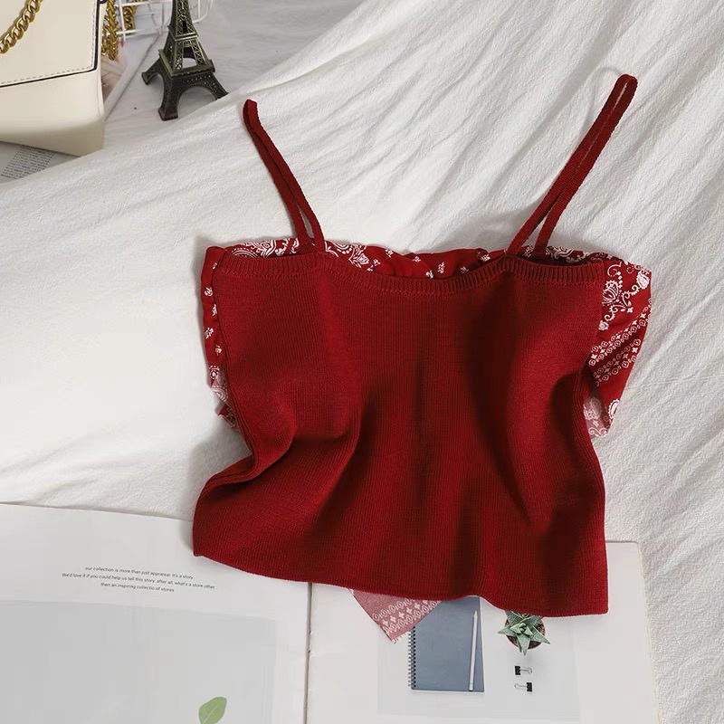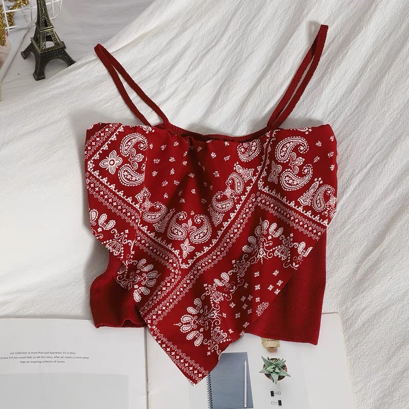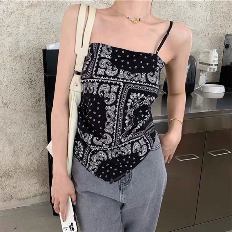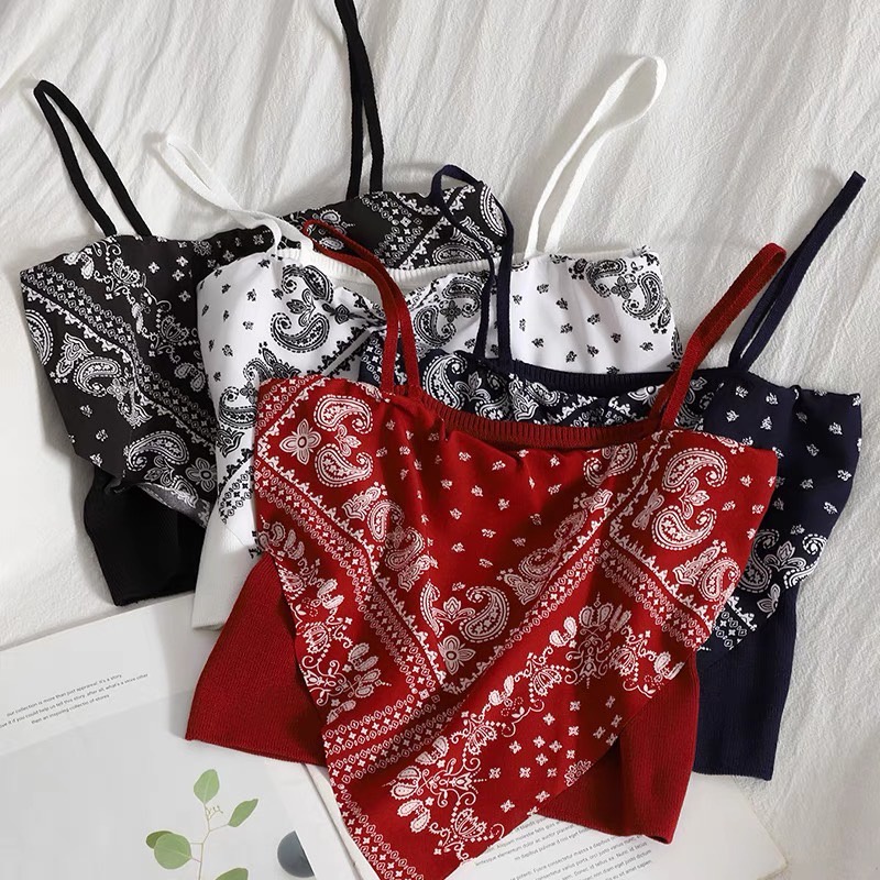 เสื้อสายเดี่ยวทรงสามเหลี่ยม ด้านในเป็นเกาะอก ผ้าไหมพรม ดีเทลลายกราฟิก แฟชั่นผู้หญิง
