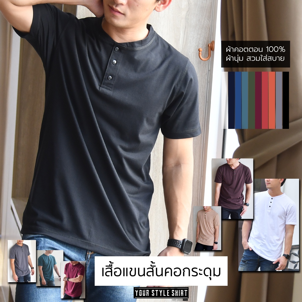 เสื้อแขนสั้น คอกระดุม รุ่นกระดุมดำ [มี 15 สี] ผ้าคอตตอน 100 % ไม่หดไม่ย้วย เสื้อคอจีน เสื้อผู้ชาย เสื้อสีดำ