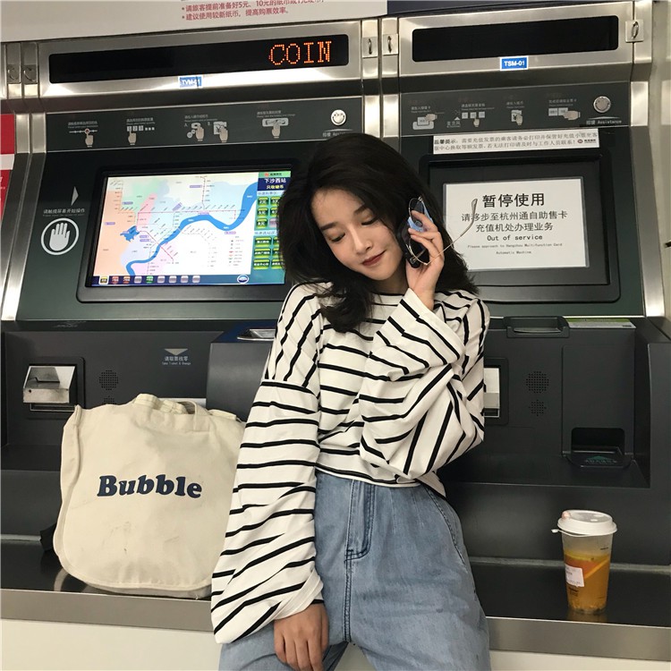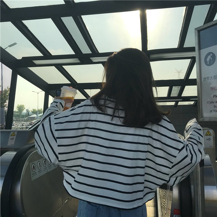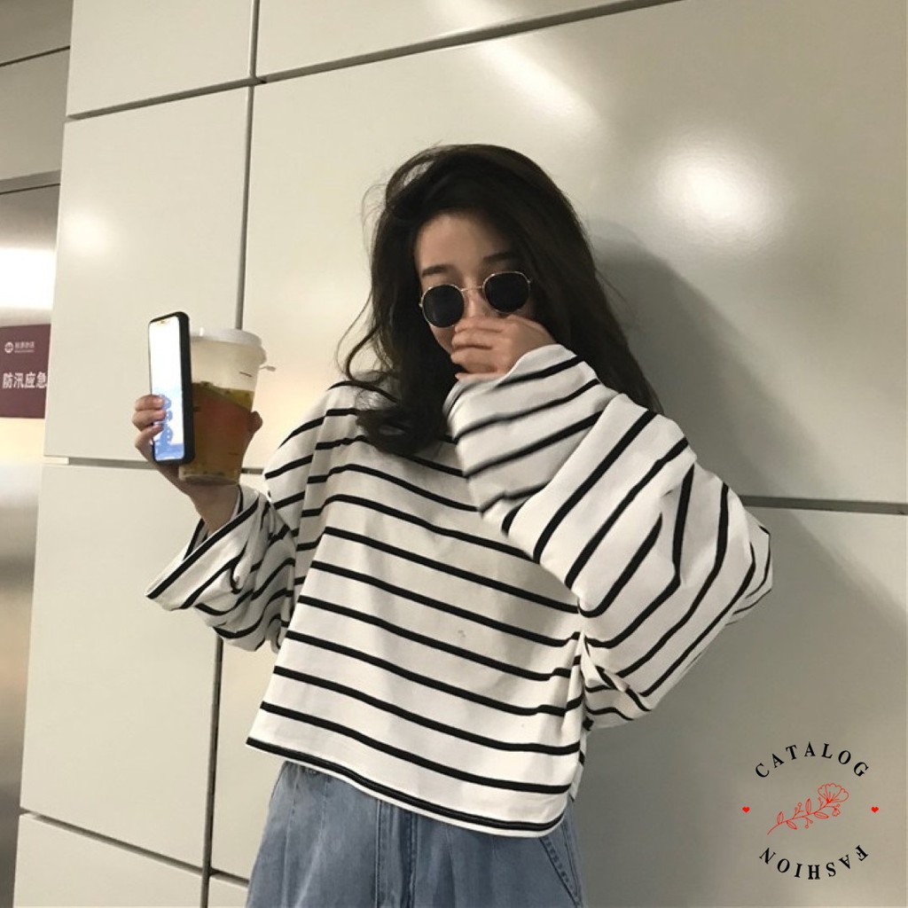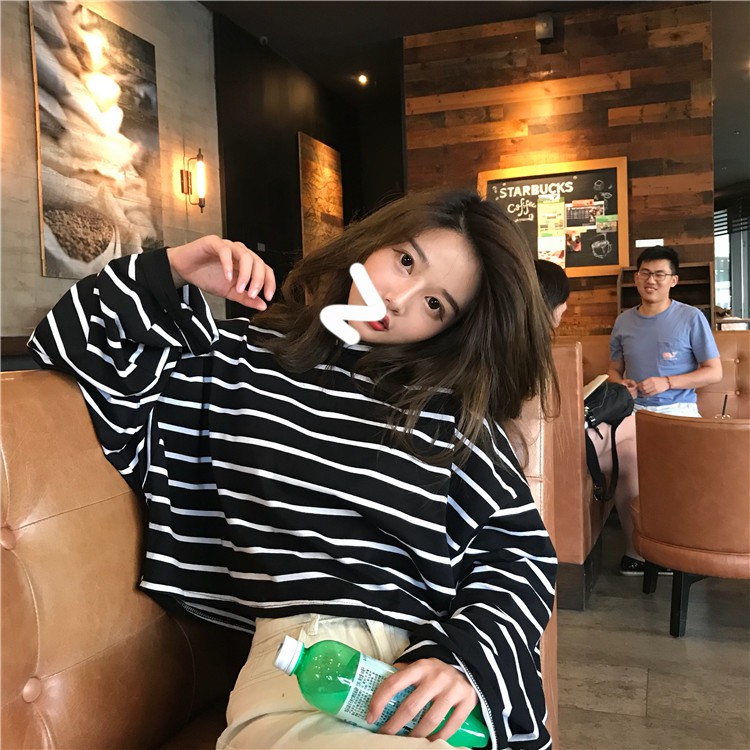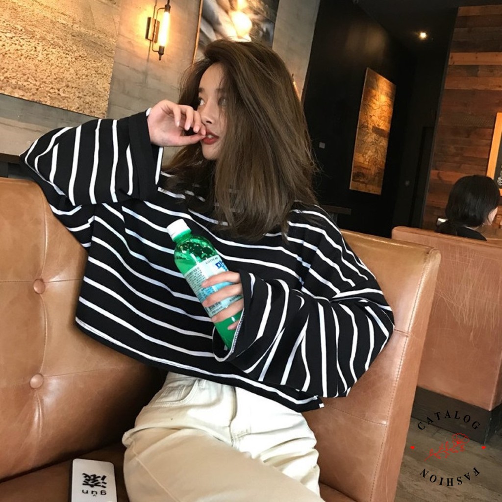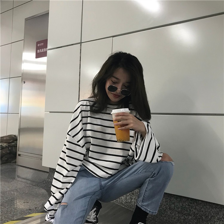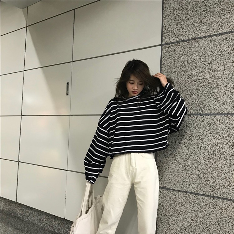 🔥ราคาถูกที่สุด🔥เสื้อโอเวอร์ไซส์คอกลมแขนยาว ลายขวางดำ ขาว แฟชั่นเท่ๆ