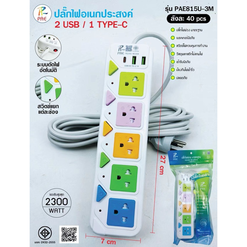 ปลั๊กไฟ Pae ปลั๊กพ่วงมาตรฐานมอก.มี 3ช่อง 4ช่อง 5ช่อง 3USB สายยาว 3เมตร 5เมตร