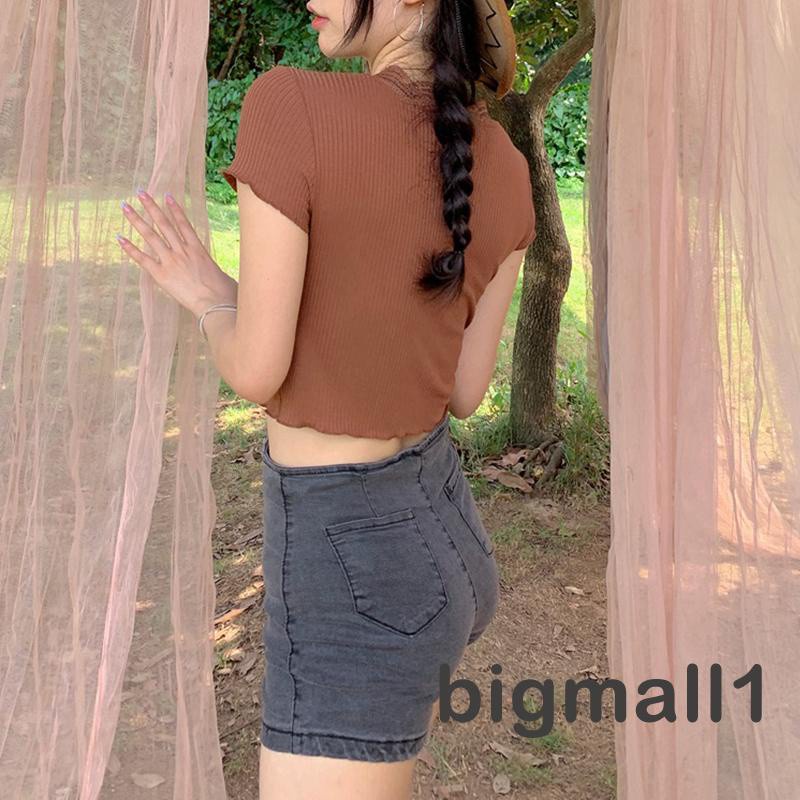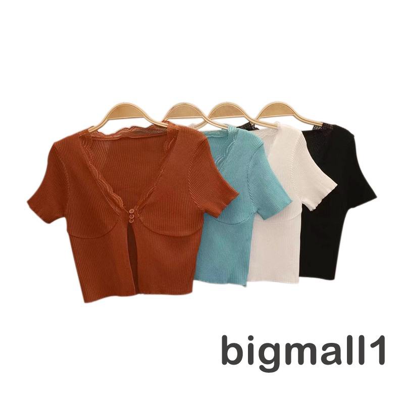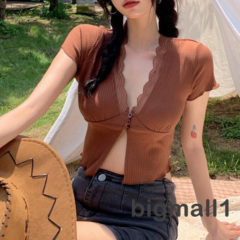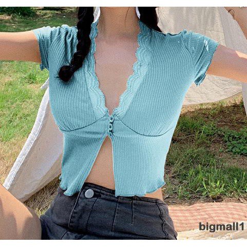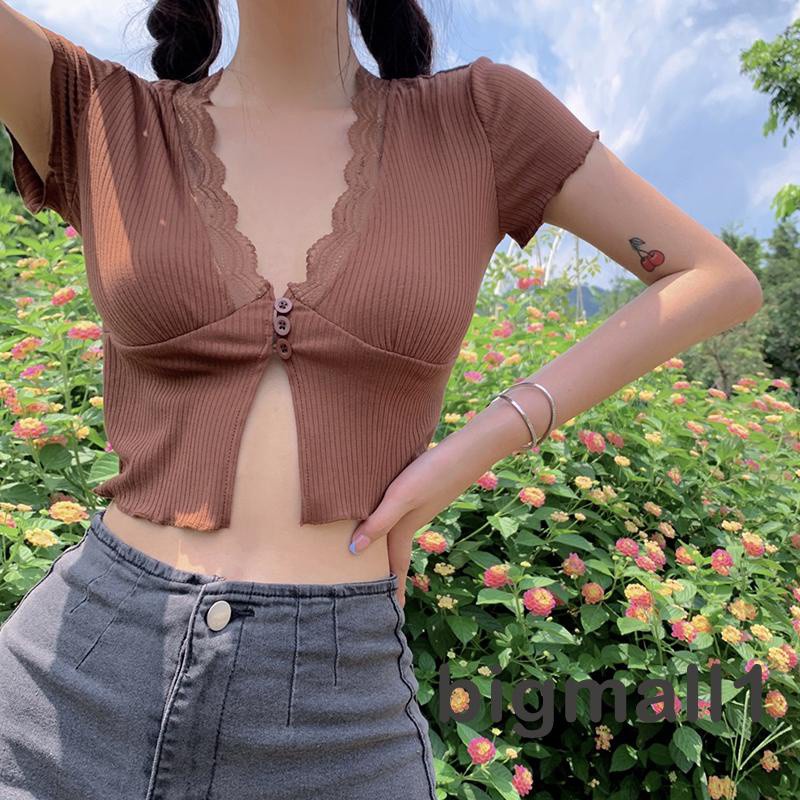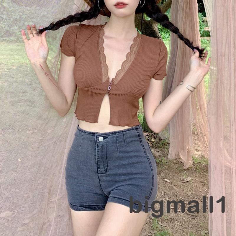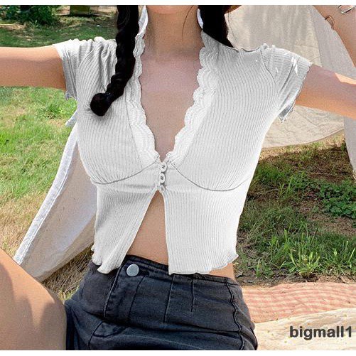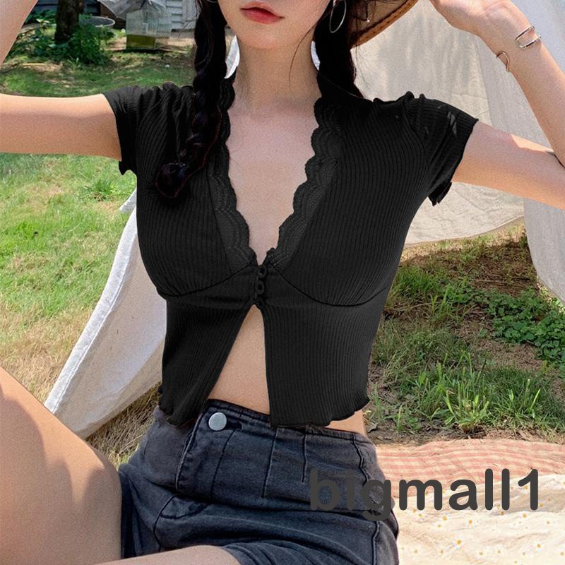 BIGMALL- เสื้อครอปผ้าถัก แขนสั้น คอวีแต่งลูกไม้ แบบมีกระดุมหน้า แฟชั่นฤดูร้อน สำหรับผู้หญ ิง