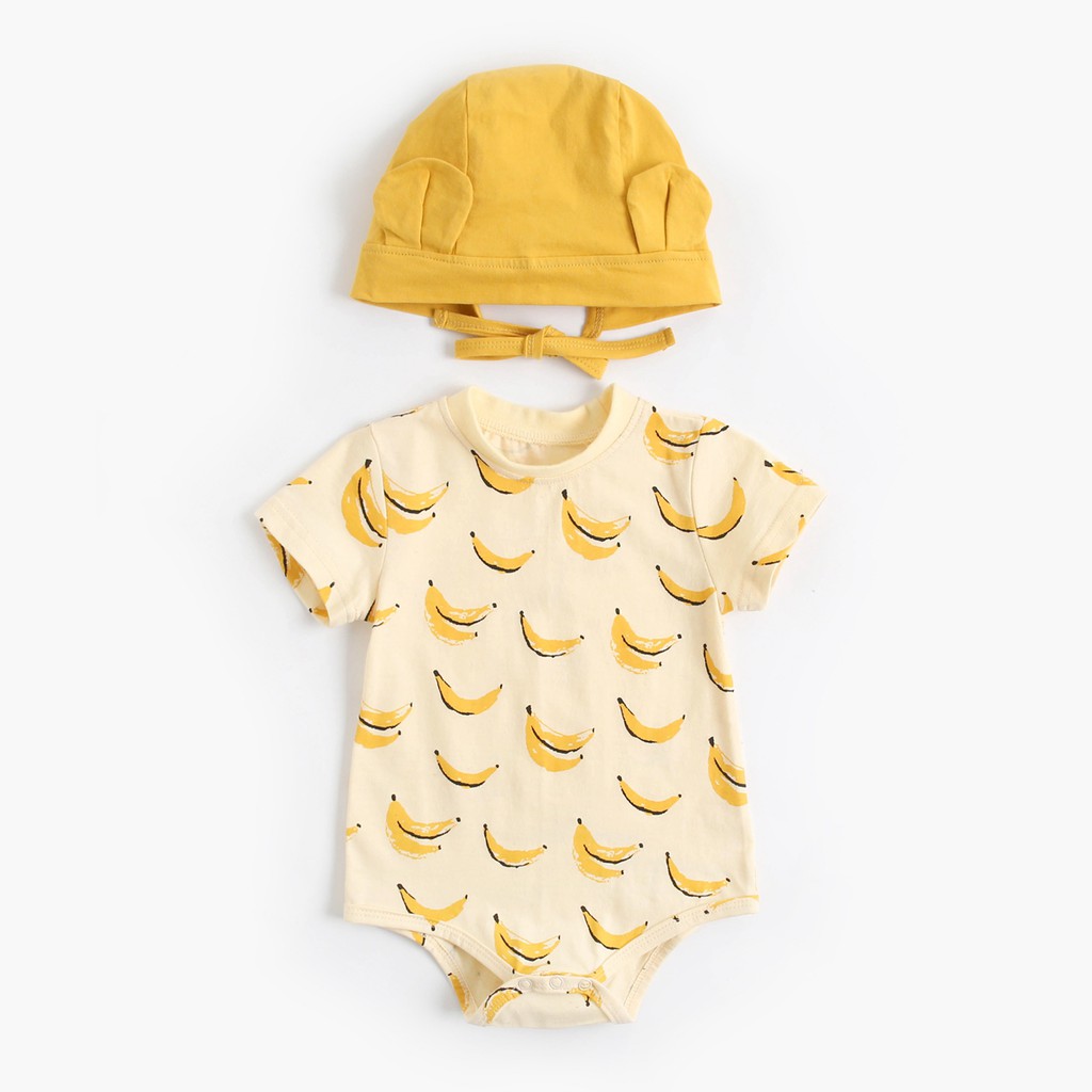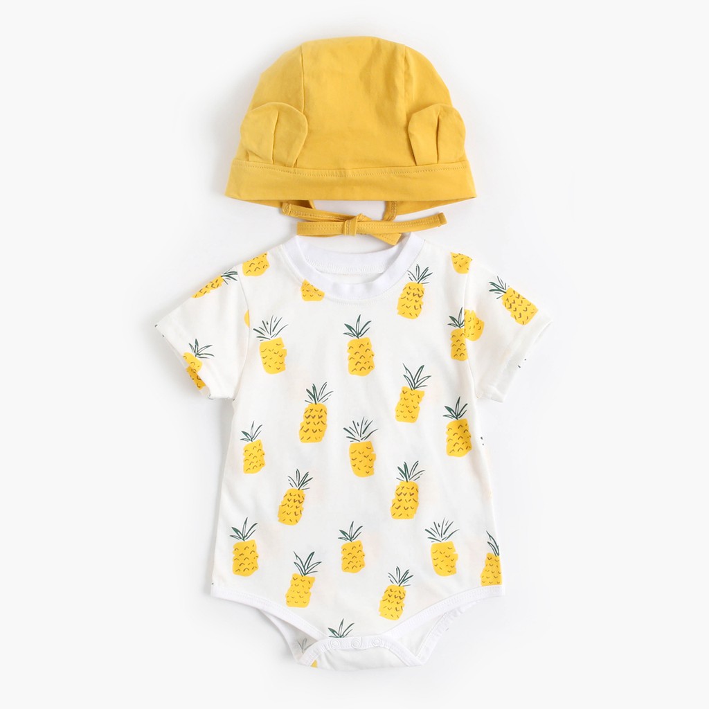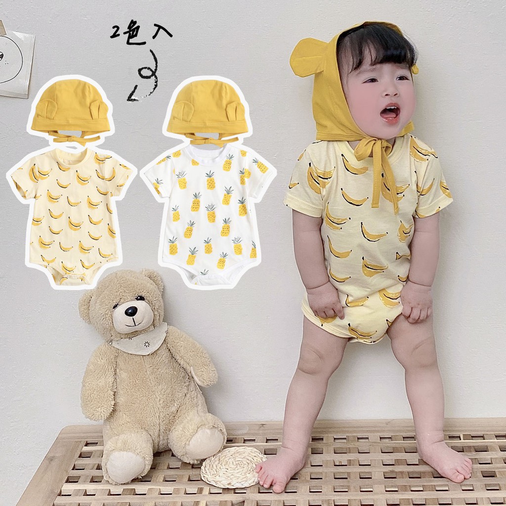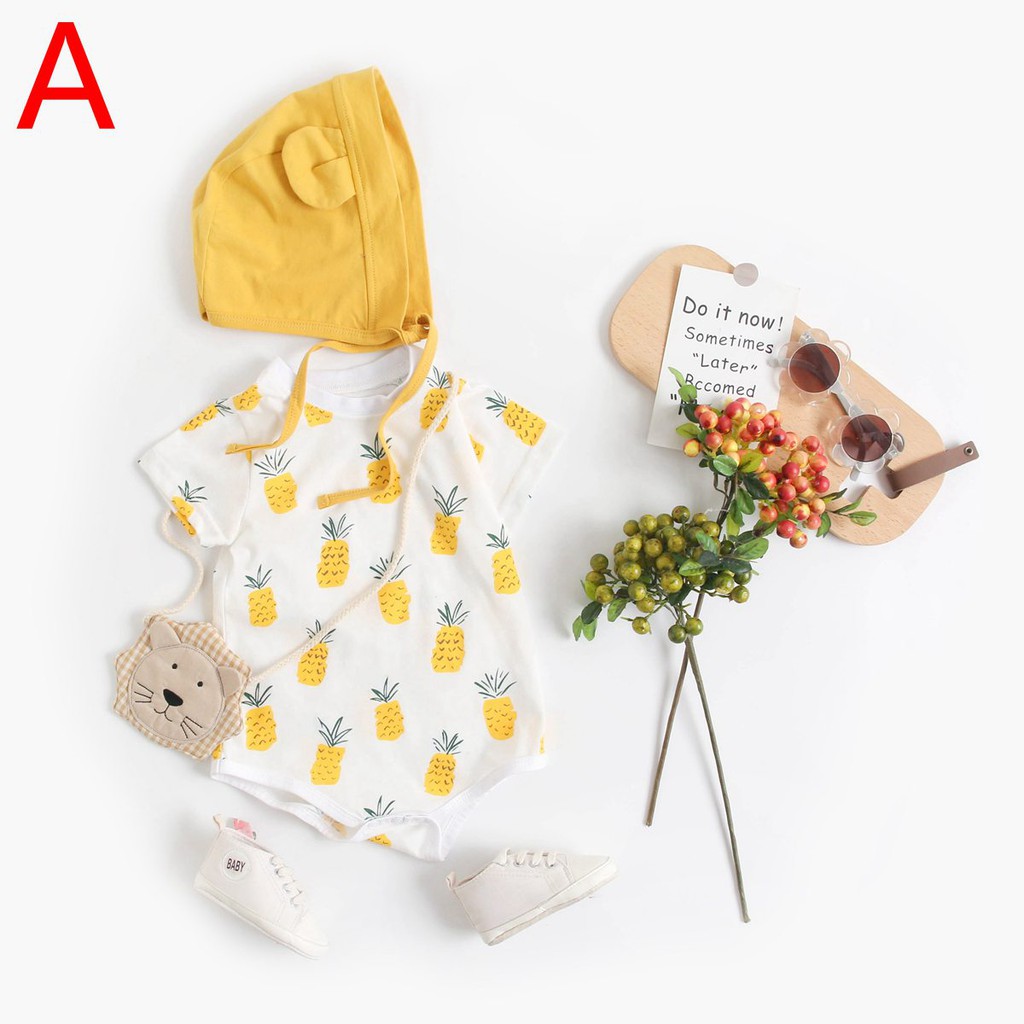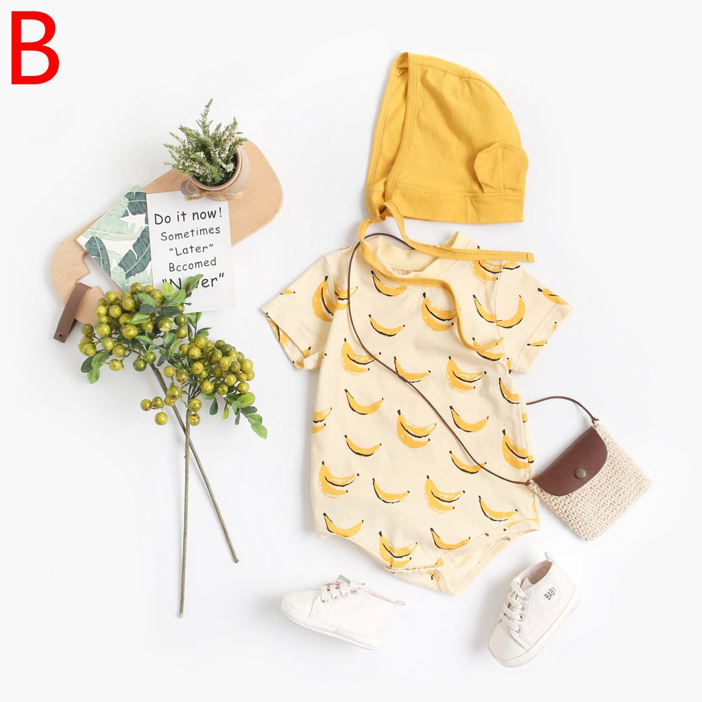 ฤดูร้อน สาวเด็กบอดี้สูท ฝ้าย เสื้อผ้าเด็ก น่ารัก การพิมพ์ผลไม้ ชุดบอดี้สูทสำหรับทารก เล็ก ๆ น้อย ๆ กับหมวก