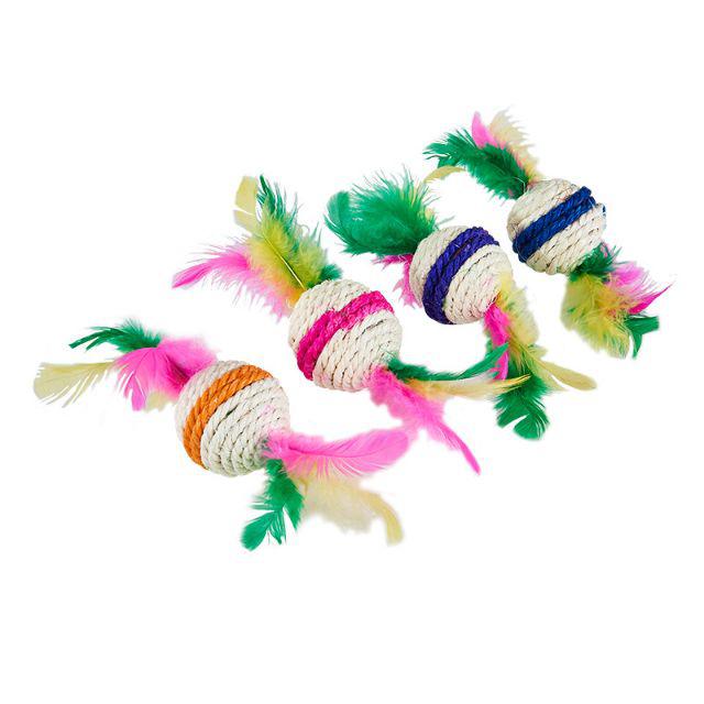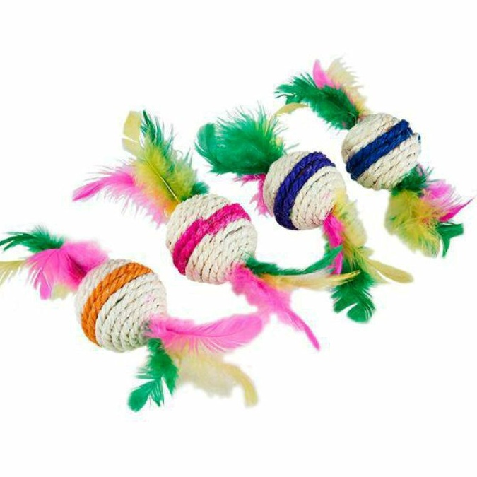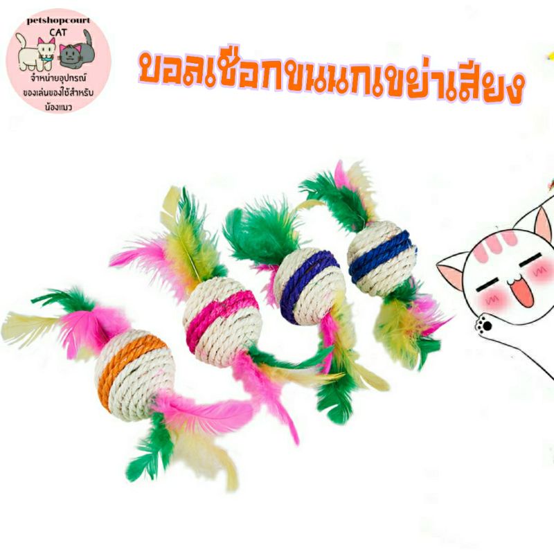 😻ของเล่นแมวบอลเชือกปอขนนกเขย่ามีเสียง(ของเล่นแมว)
