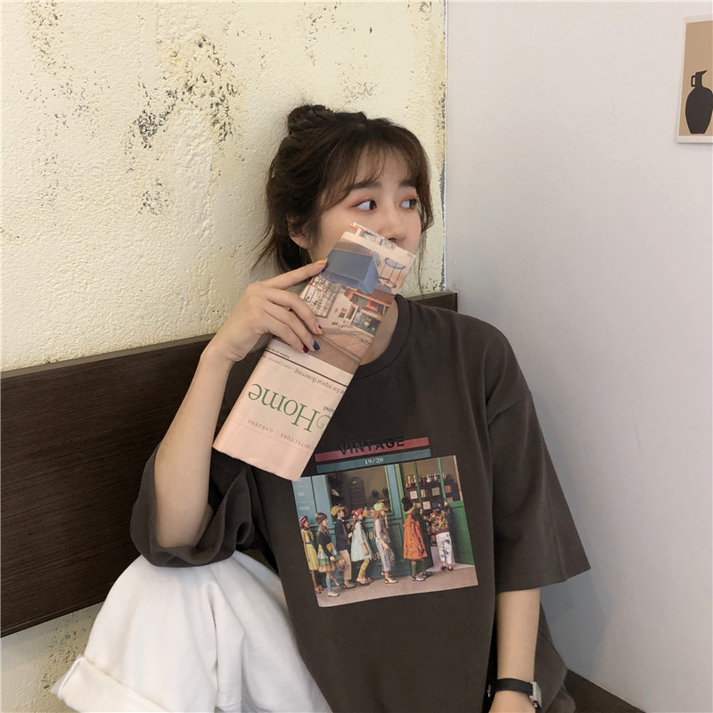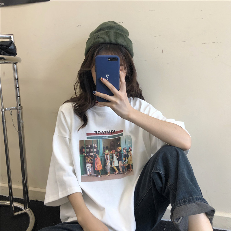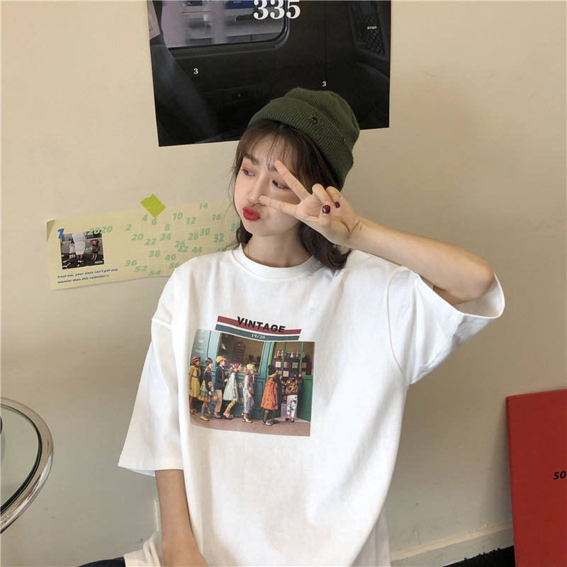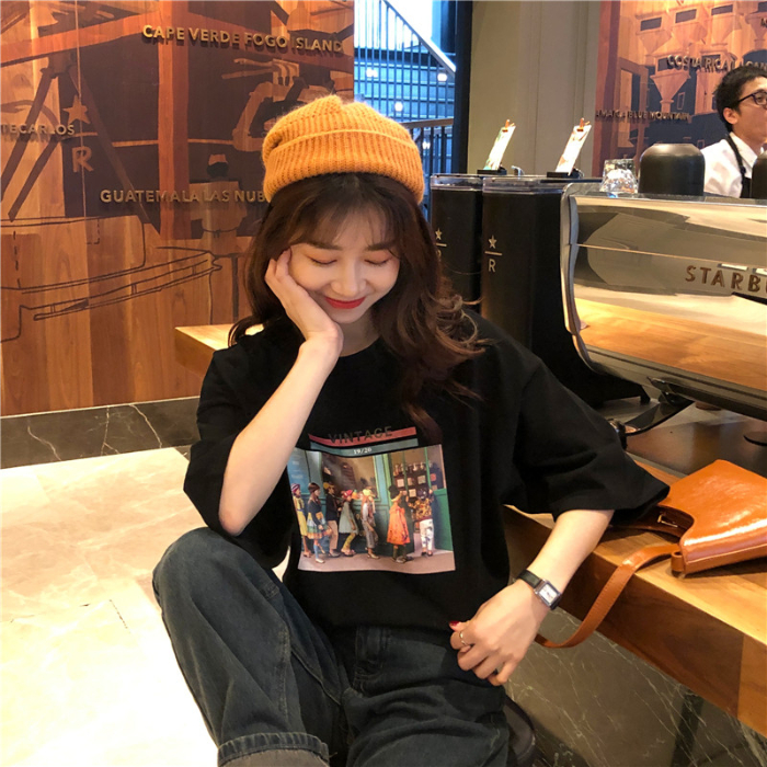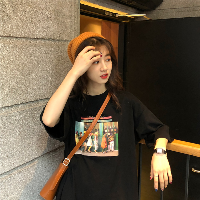 เสื้อยืดแขนสั้น พิมพ์ลายดิจิทัล ขนาดใหญ่ สไตล์เกาหลี แฟชั่นวินเทจ สําหรับผู้หญิงวัยรุ่น มีสีดํา ไซซ์ L